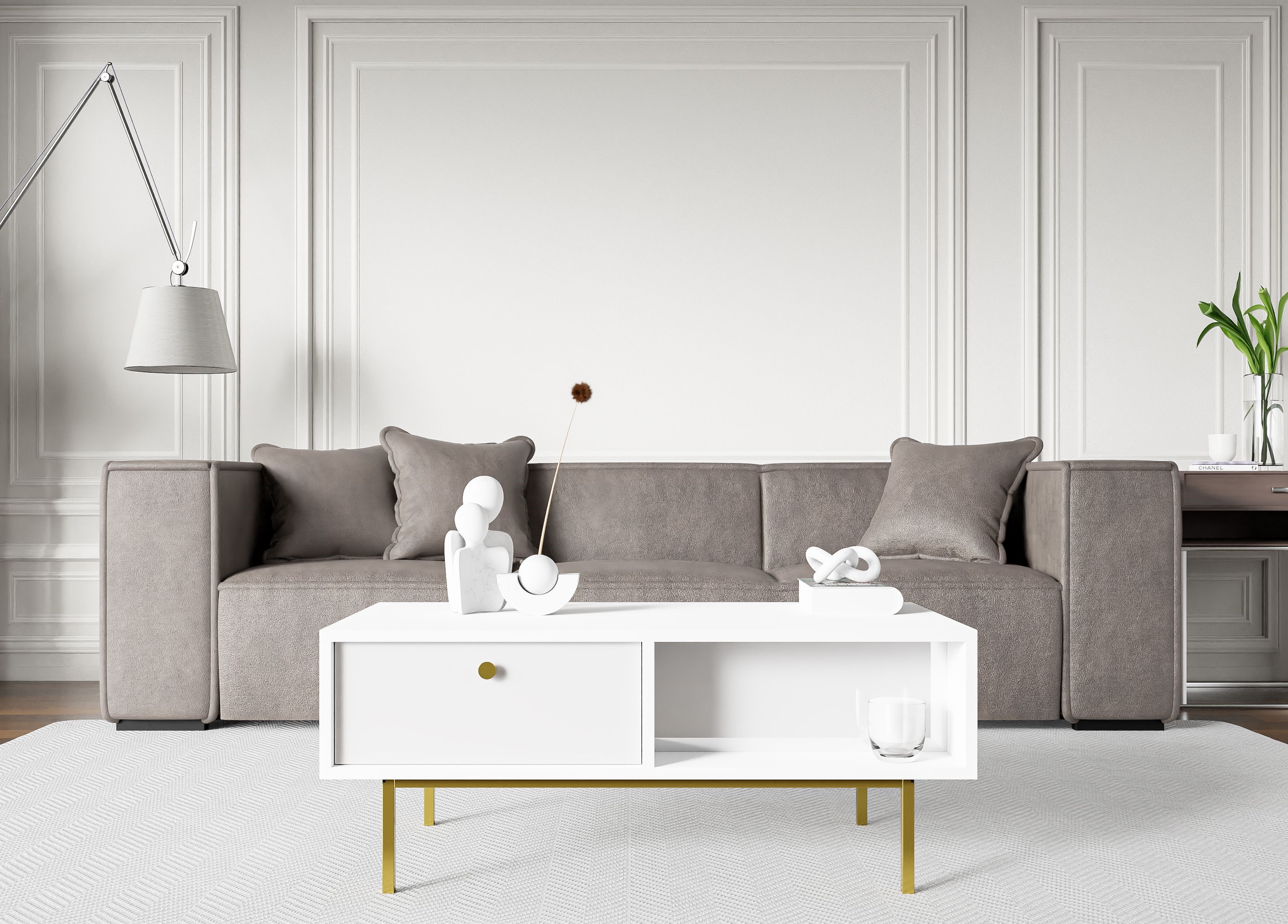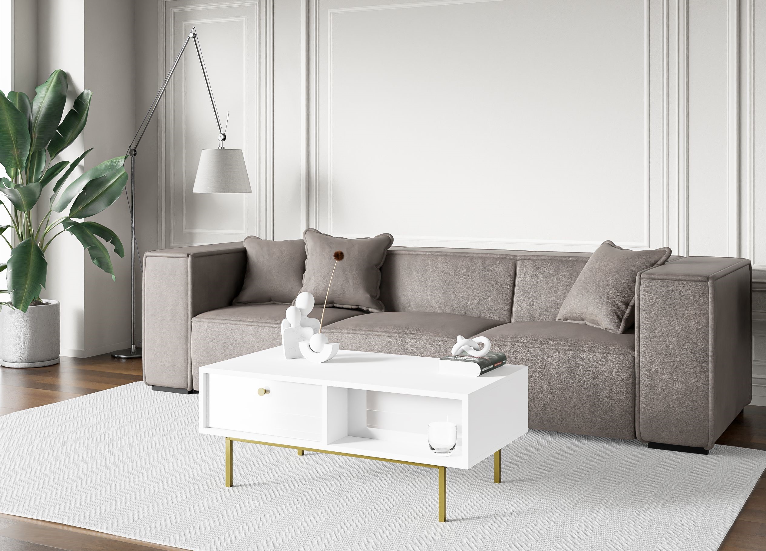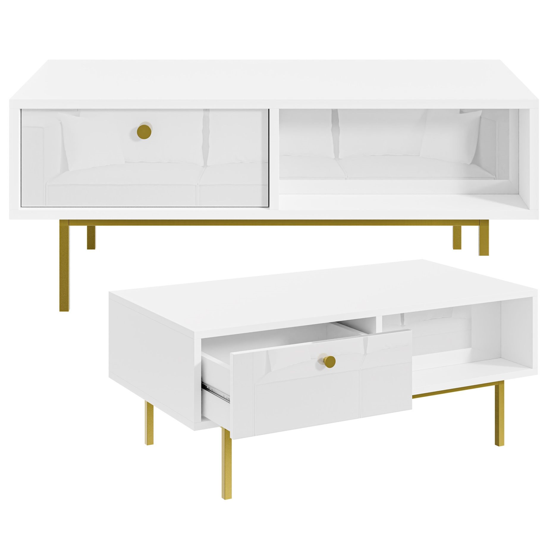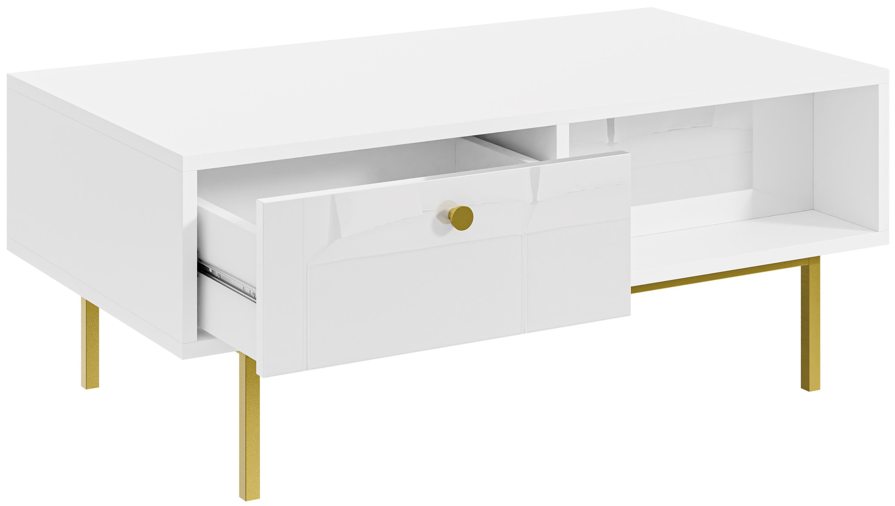 Nowoczesny, prostokątny stolik kawowy w kolorze białym, z elementami w kolorze złotym. Mebel posiada 2 otwarte komory oraz 2 szuflady.