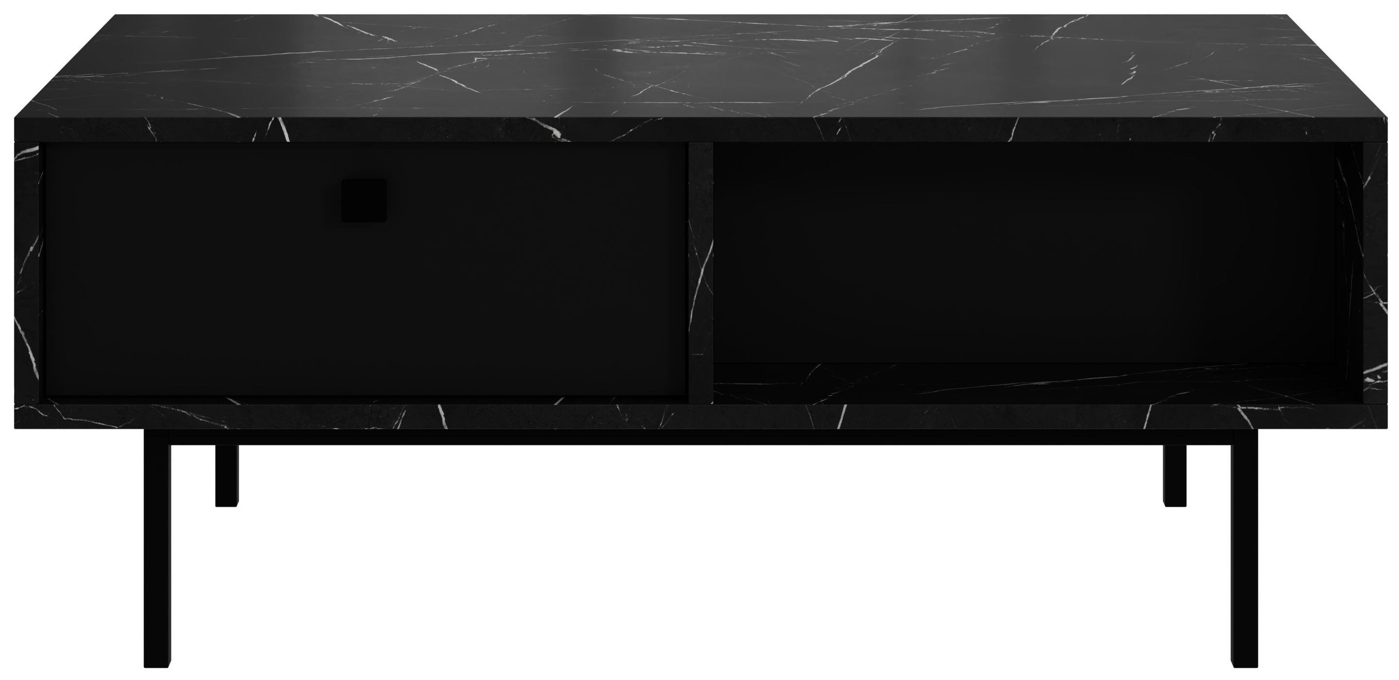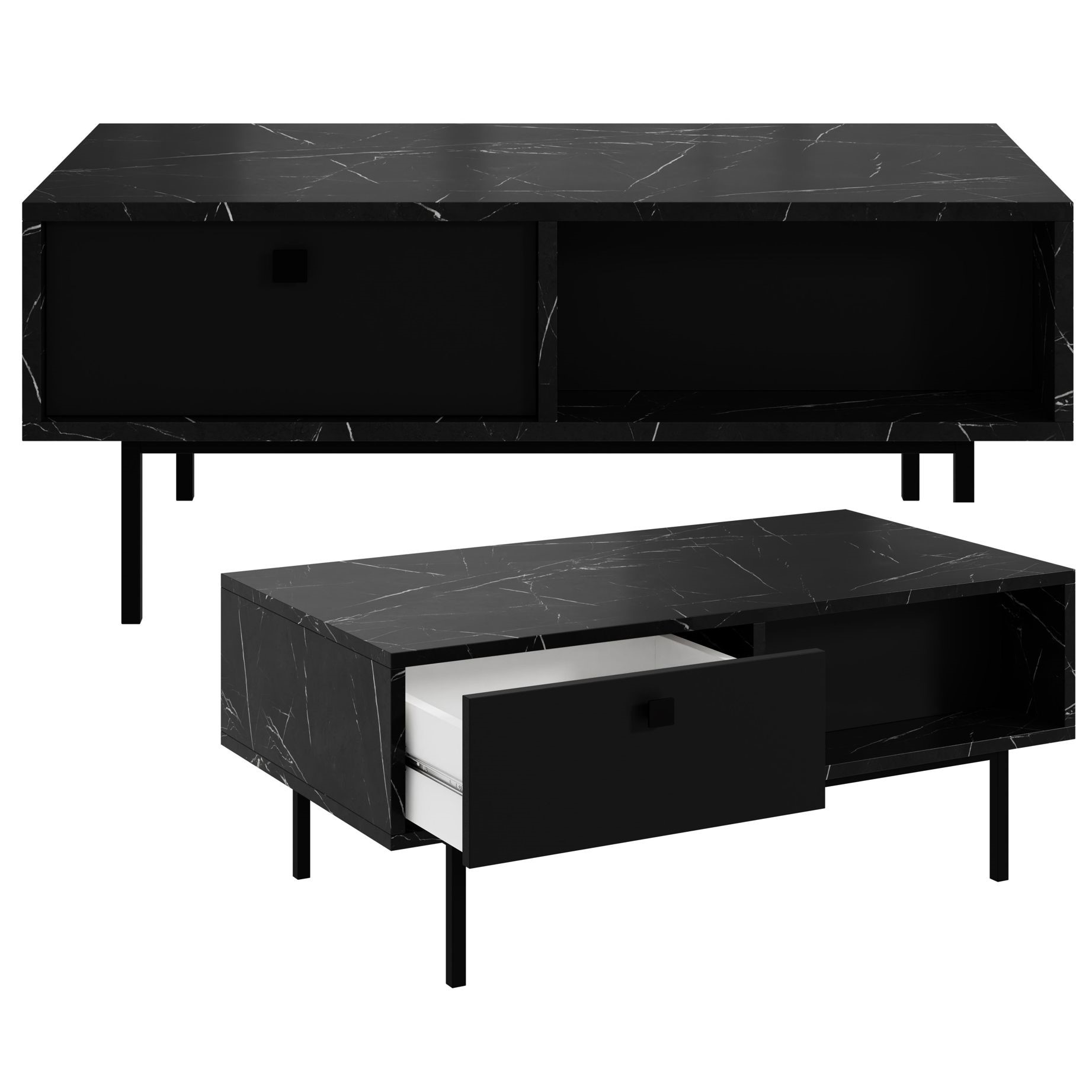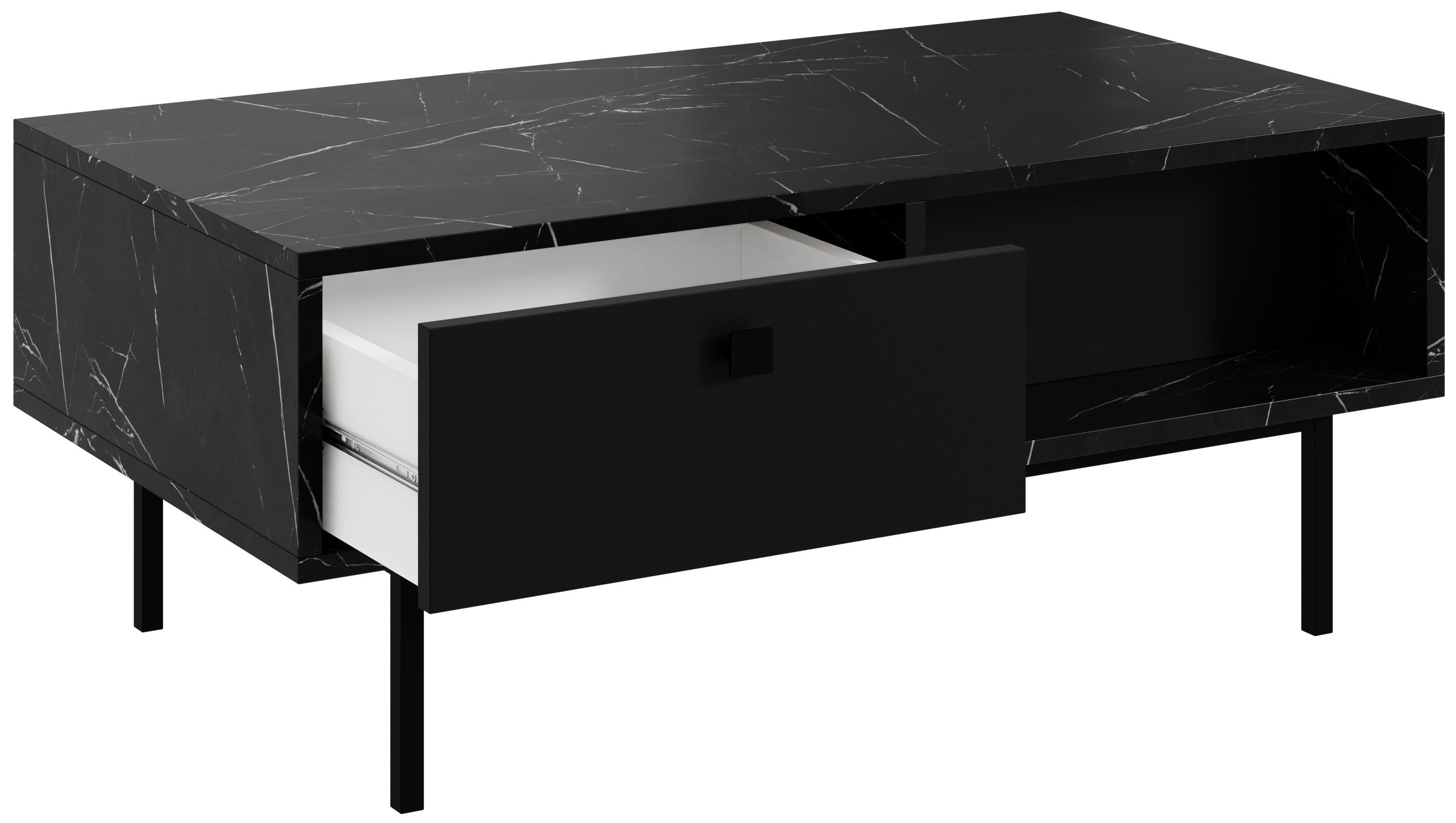 Nowoczesny, prostokątny stolik kawowy w kolorze marmur royal z elementami w kolorze czarnym i złotym. Mebel posiada 2 otwarte komory oraz 2 szuflady.