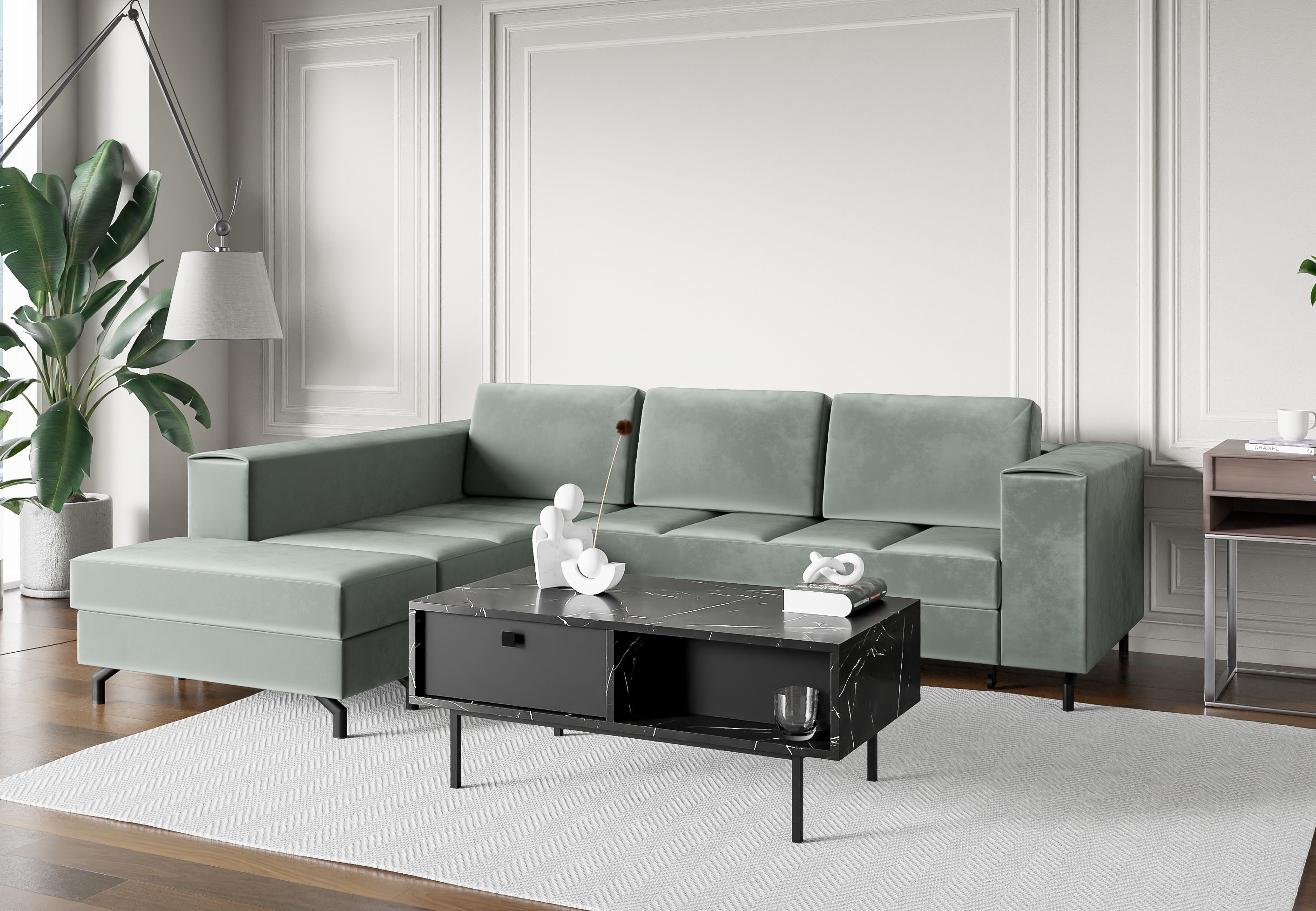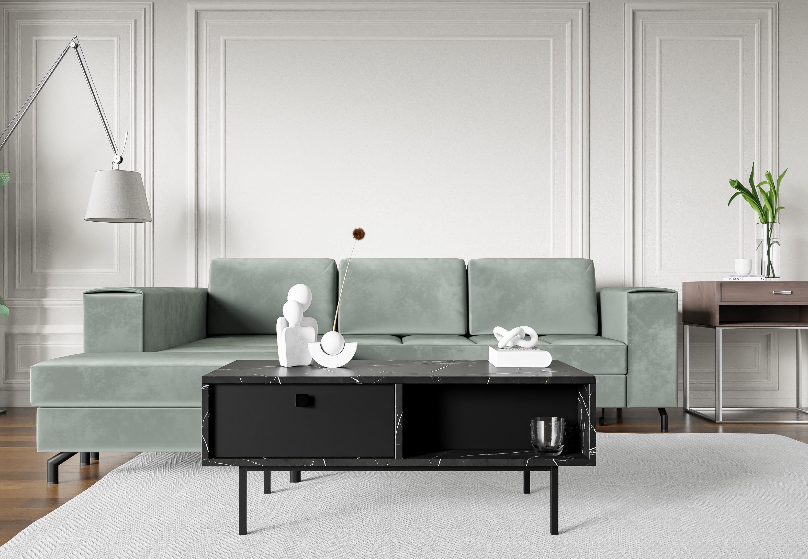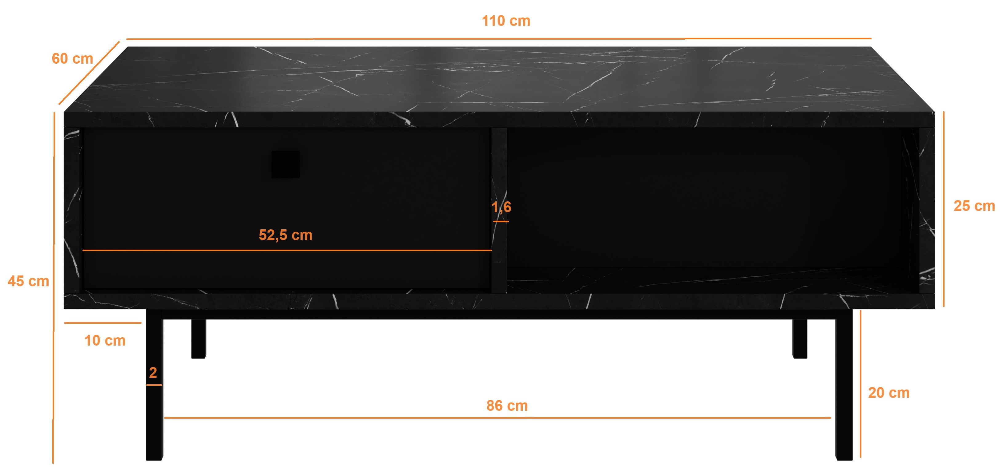 Nowoczesny, prostokątny stolik kawowy w kolorze marmur royal z elementami w kolorze czarnym i złotym. Mebel posiada 2 otwarte komory oraz 2 szuflady.