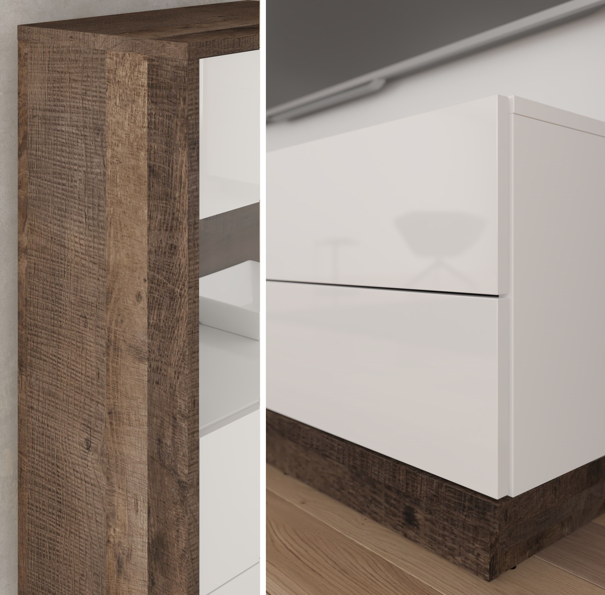 W meblach zastosowana została płyta wiórowa o grubości 16mm i 25mm oklejona obrzeżem ABS. Drzwi posiadają otwieranie push to open. Postument ma wysokość 8,5 cm.