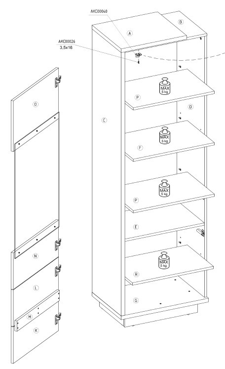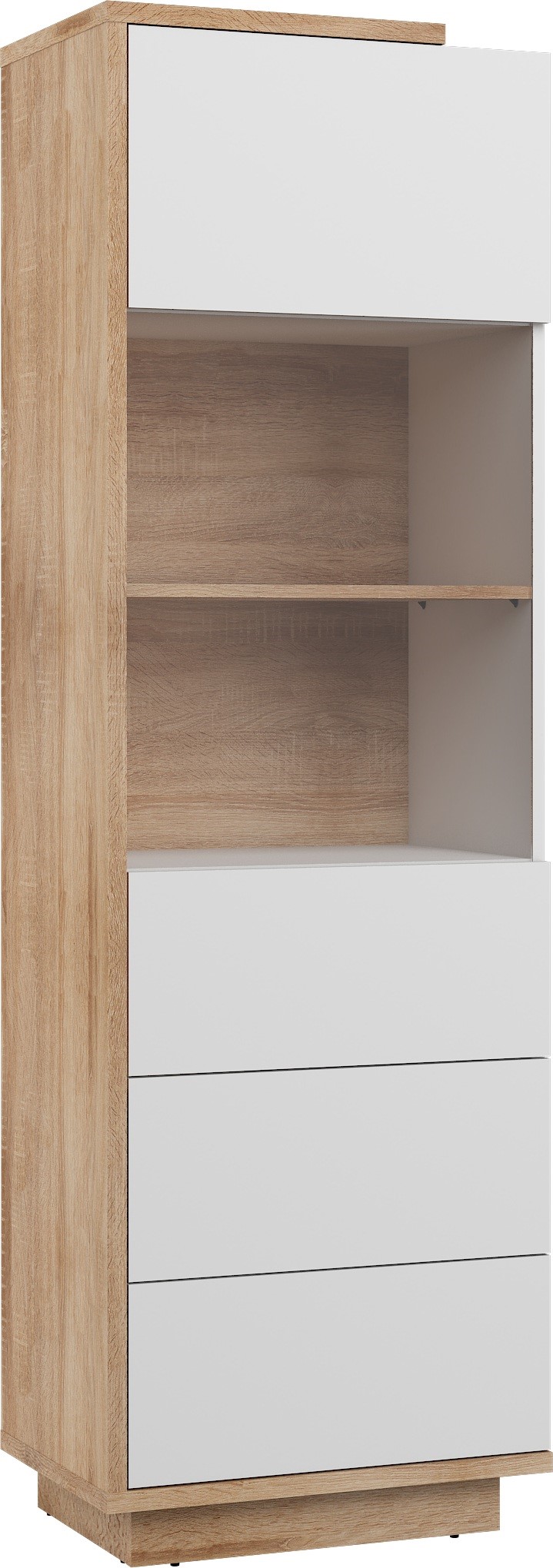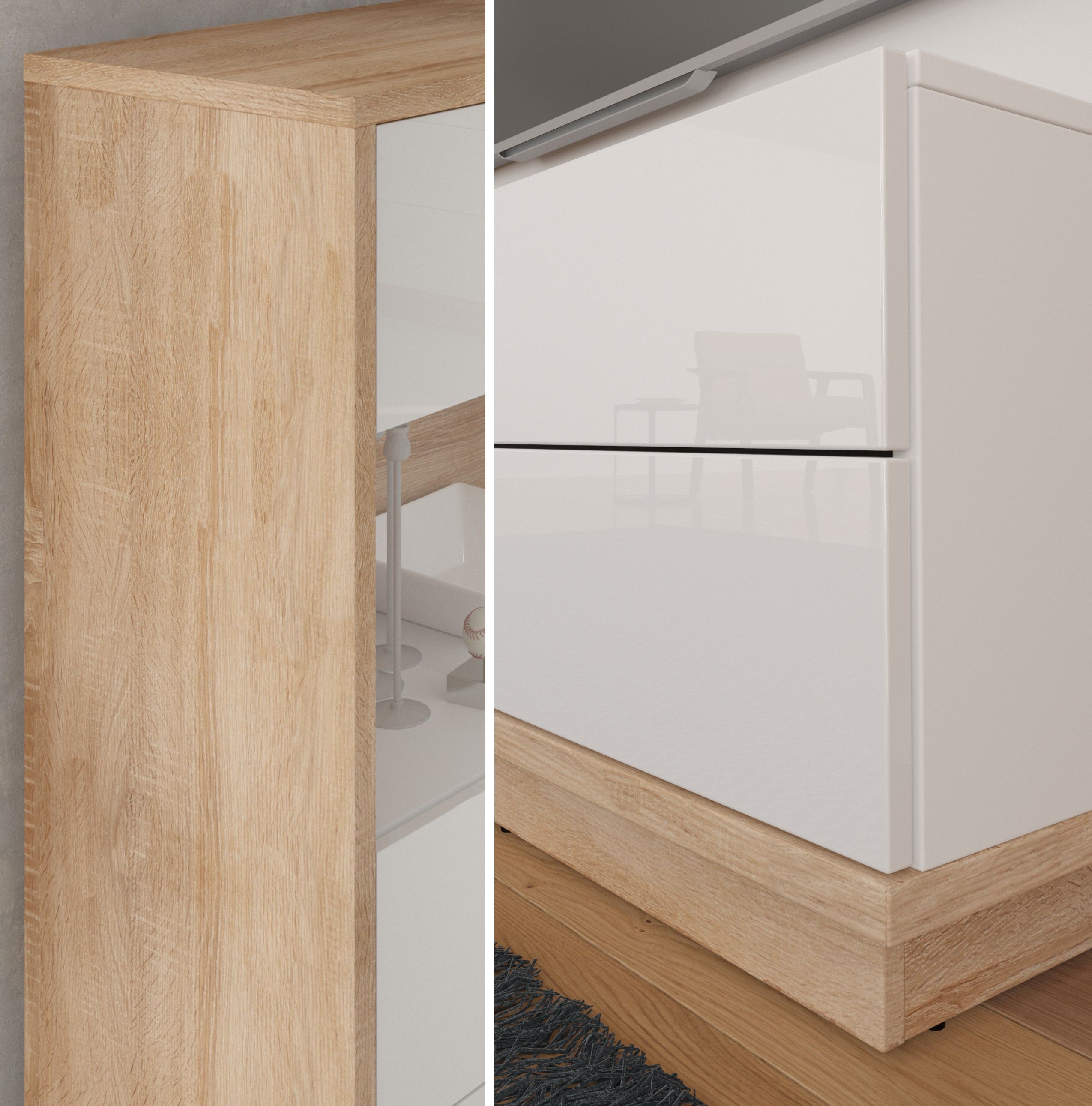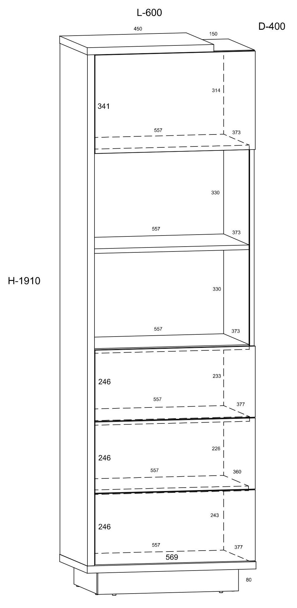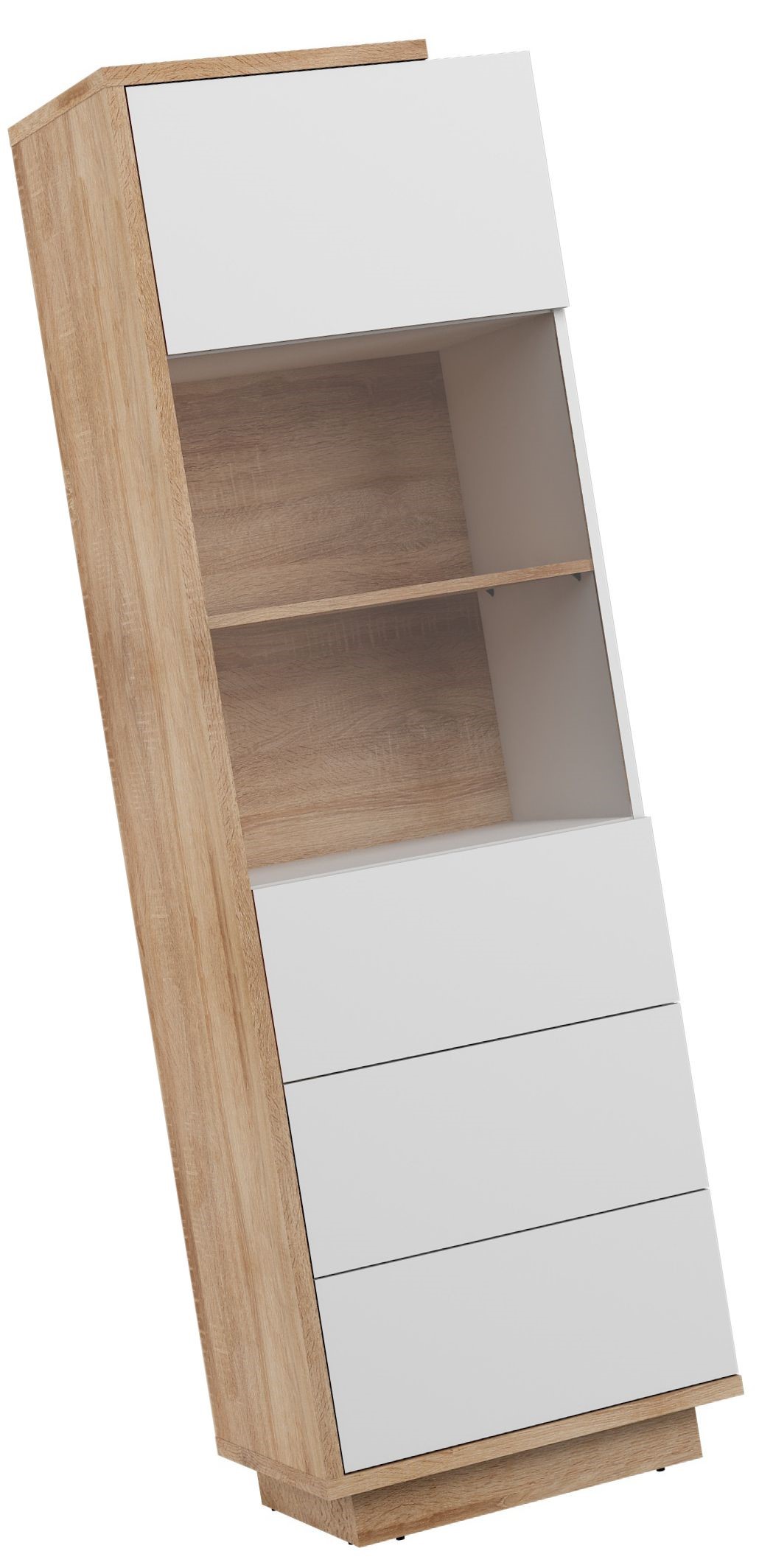 W meblach zastosowana została płyta wiórowa o grubości 16mm i 25mm oklejona obrzeżem ABS. Drzwi posiadają otwieranie push to open. Postument ma wysokość 8,5 cm.