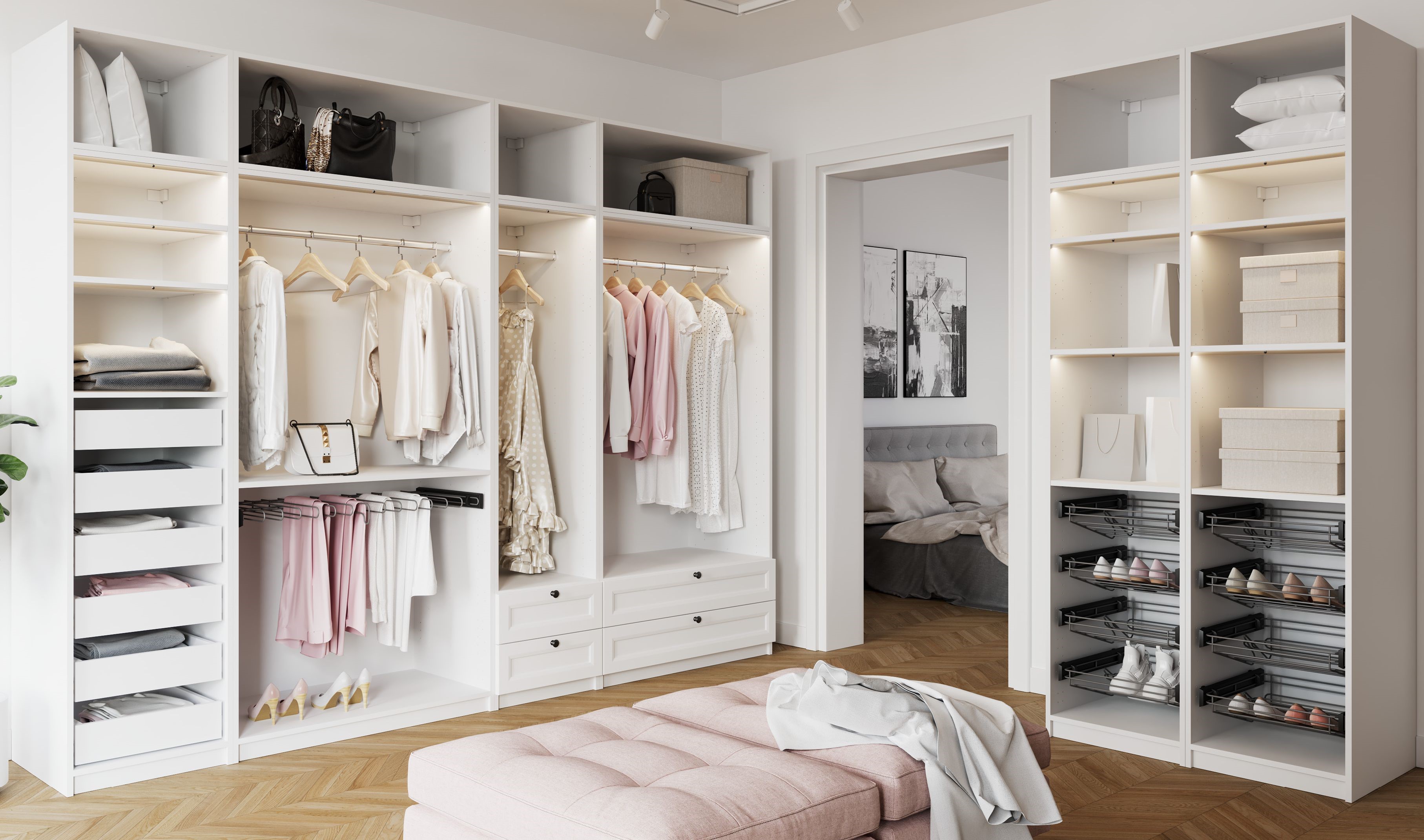 Przemyślany układ półek, szuflad i drążków zapewnia maksymalną funkcjonalność — od miejsca na sukienki i koszule, przez półki na torebki, aż po dolne segmenty na obuwie. Każdy element został zaprojektowany tak, aby ułatwiać codzienne wybory i utrzymywać idealny porządek.
