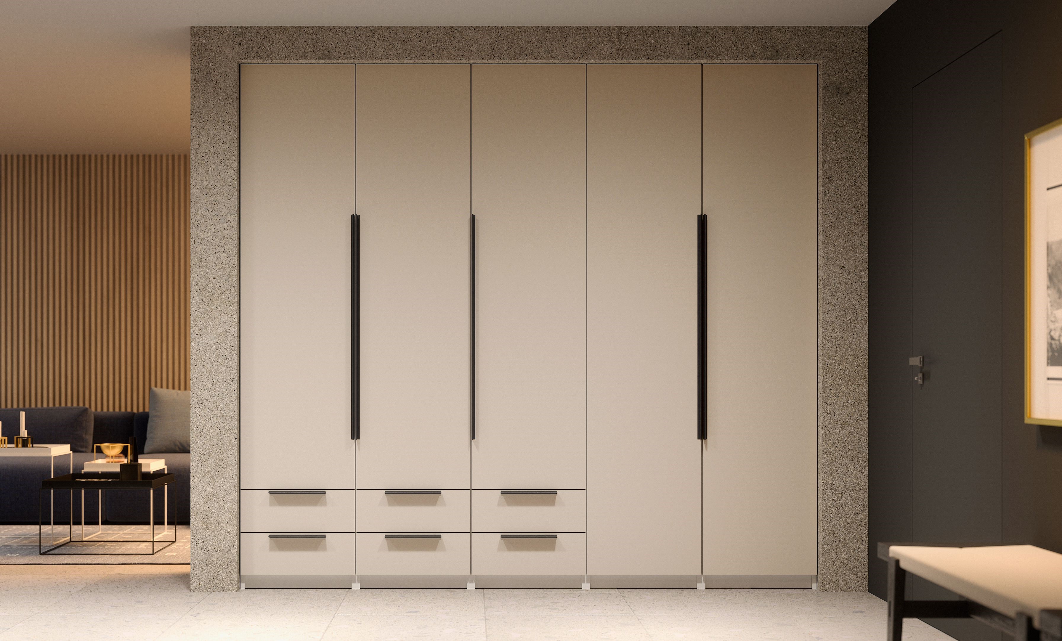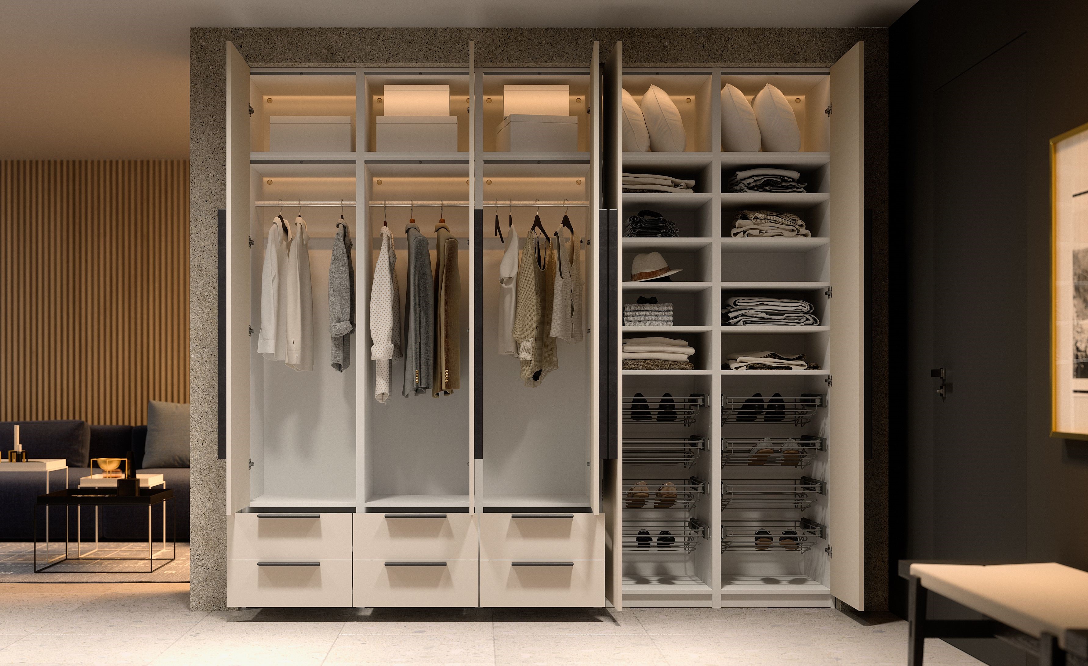 Nowoczesna, funkcjonalna garderoba z oświetleniem LED to idealne rozwiązanie dla osób ceniących porządek i elegancki design. Szafa została podzielona na praktyczne strefy: sekcje z drążkami na ubrania, półki na złożone rzeczy, wysuwane szuflady oraz miejsce na buty. W górnych częściach znajdują się pojemne boxy do przechowywania sezonowych akcesoriów. Starannie ułożone koszule, marynarki i swetry podkreślają minimalistyczny styl wnętrza, a wysuwane półki na obuwie zapewniają wygodny dostęp do wszystkich par. Garderoba świetnie sprawdzi się w nowoczesnym mieszkaniu, oferując maksymalne wykorzystanie przestrzeni i estetyczny wygląd.