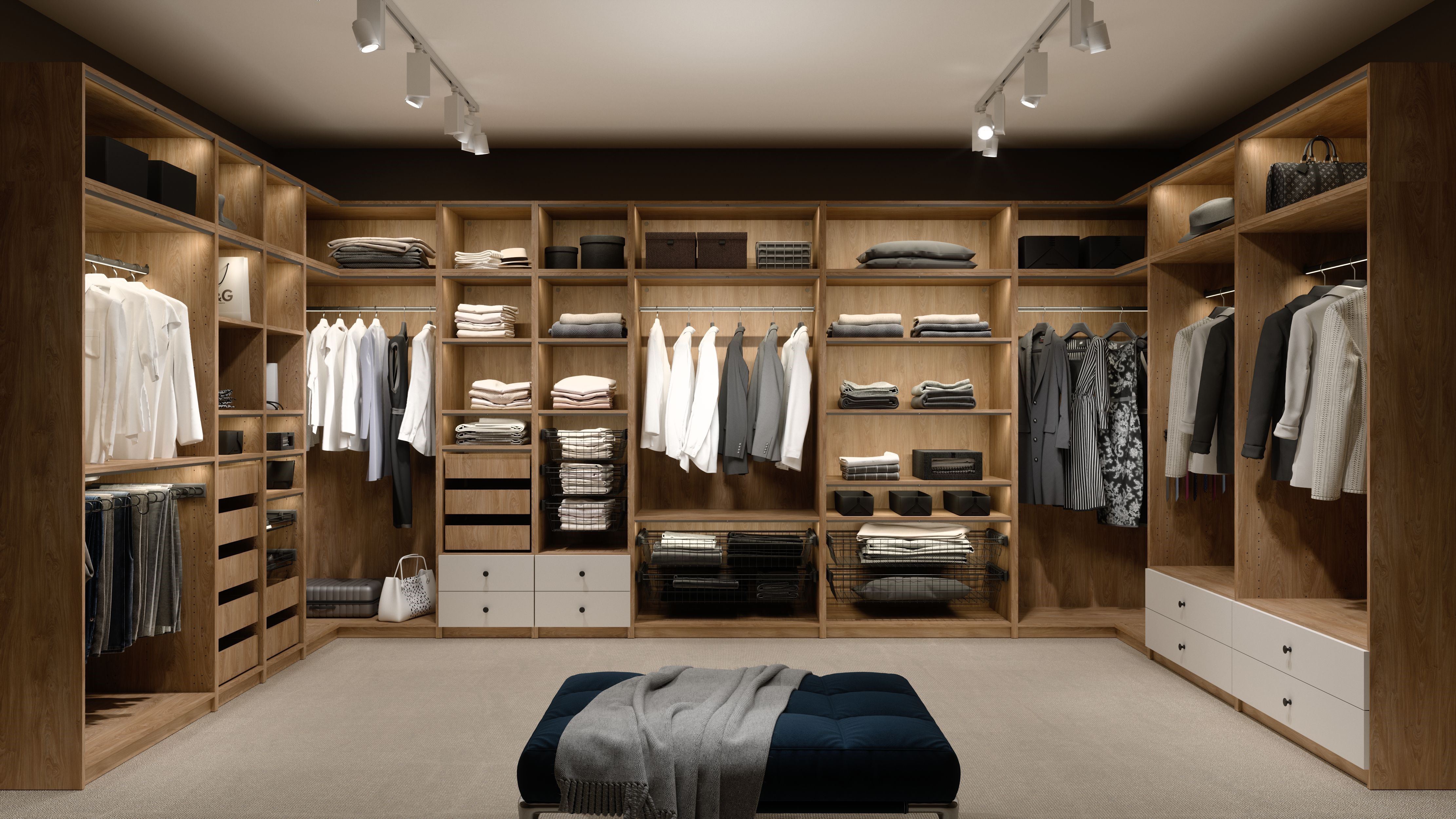 Stwórz idealnie uporządkowaną przestrzeń dzięki nowoczesnej garderobie z zabudową na wymiar. Model łączy eleganckie, drewniane wykończenie z maksymalną funkcjonalnością, oferując liczne półki, drążki na ubrania, pojemne szuflady oraz zamykane moduły na akcesoria. Przemyślany układ ułatwia segregację odzieży i dodatków, a centralna ławka zwiększa komfort codziennego użytkowania.Garderoba doskonale sprawdzi się w nowoczesnych wnętrzach, zapewniając estetykę, wygodę i perfekcyjną organizację. To idealny wybór dla osób, które chcą wprowadzić do swojego domu luksusowy, butikowy klimat.