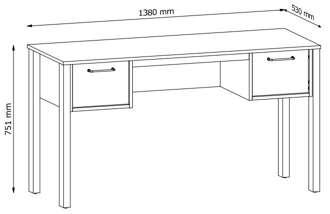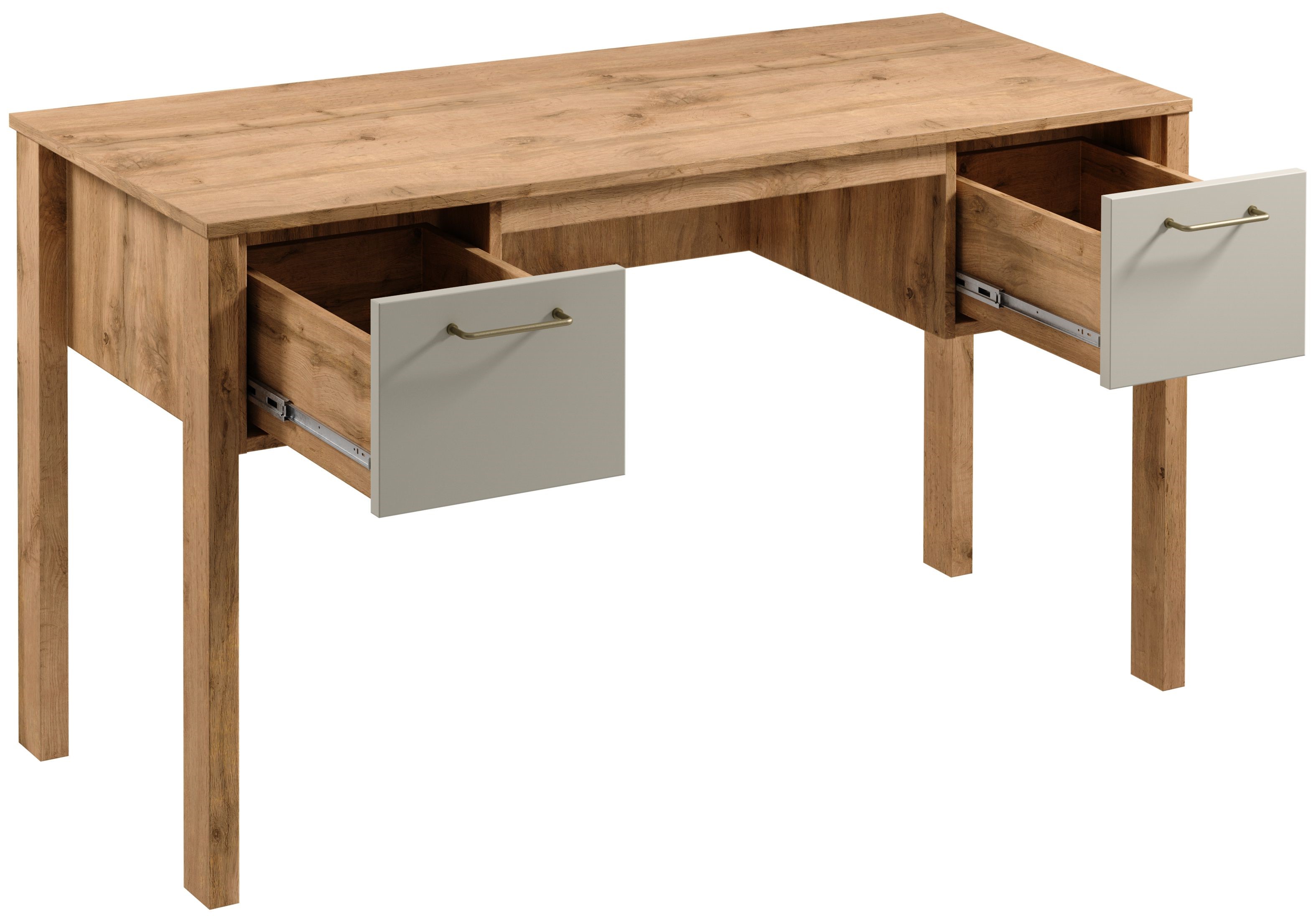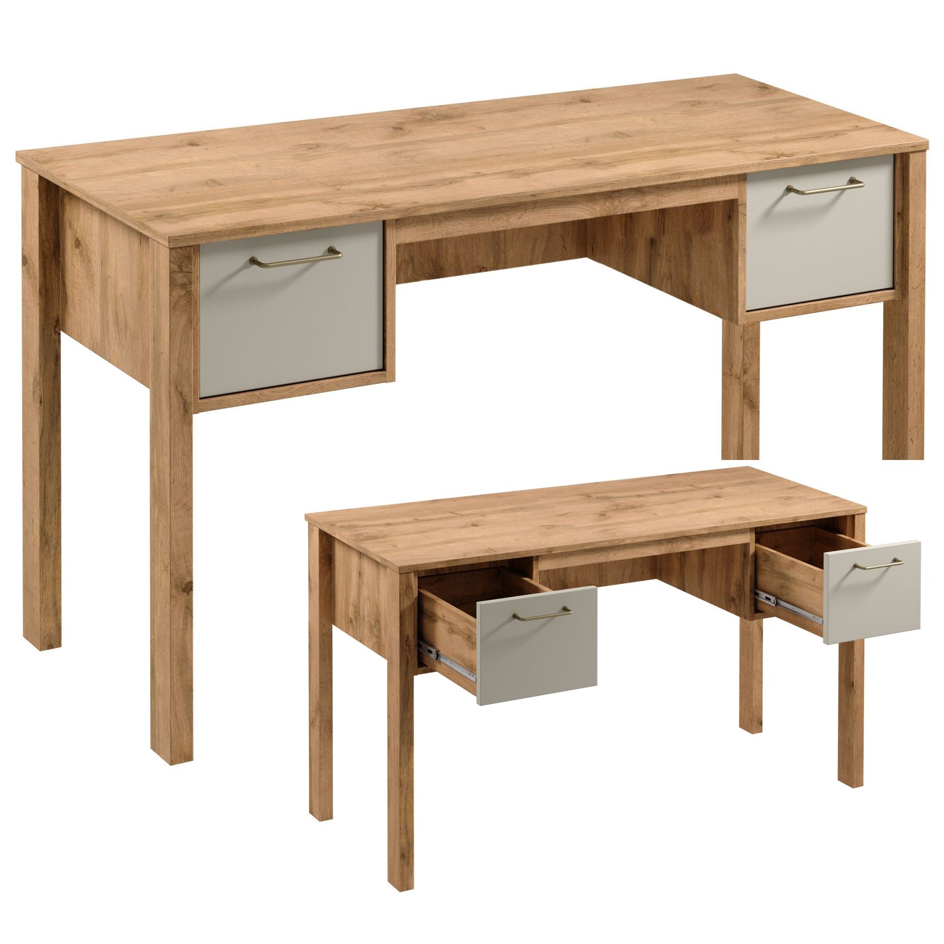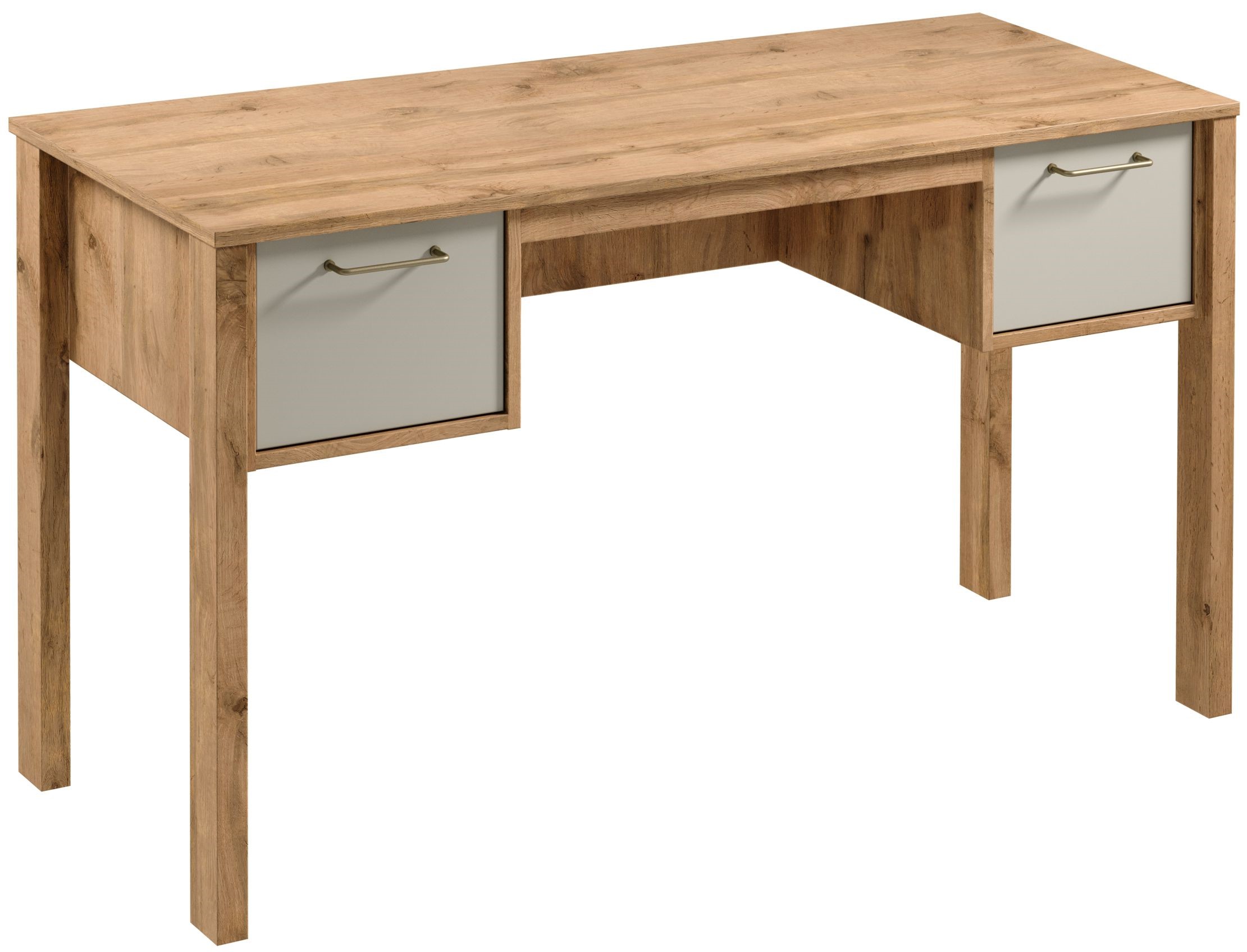 Praktyczne biurko z dużą powierzchnia blatu do pracy. Dwie szuflady z funkcją pełnego wysuwu co znacznie ułatwia dostęp do przedmiotów znajdujących się w środku. Metalowe uchwyty w złotym kolorze i o ergonomicznym kształcie nadają elegancji. Naturalna kolorystyka ciepłego dekoru Dąb Wotan na korpusie mebla w połączeniu z mono- kolorem beżu sprawia, że kolekcja jest naturalnie piękna.