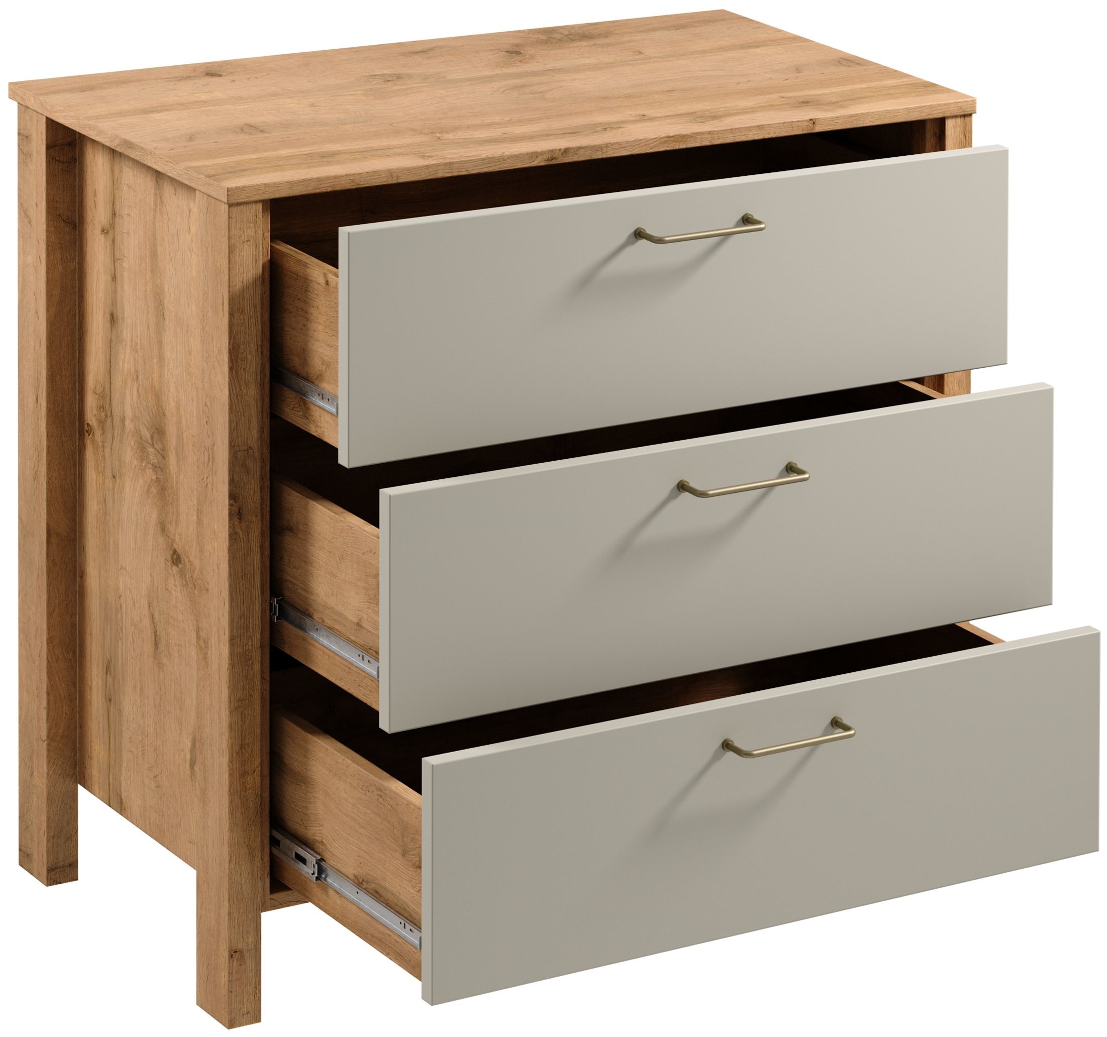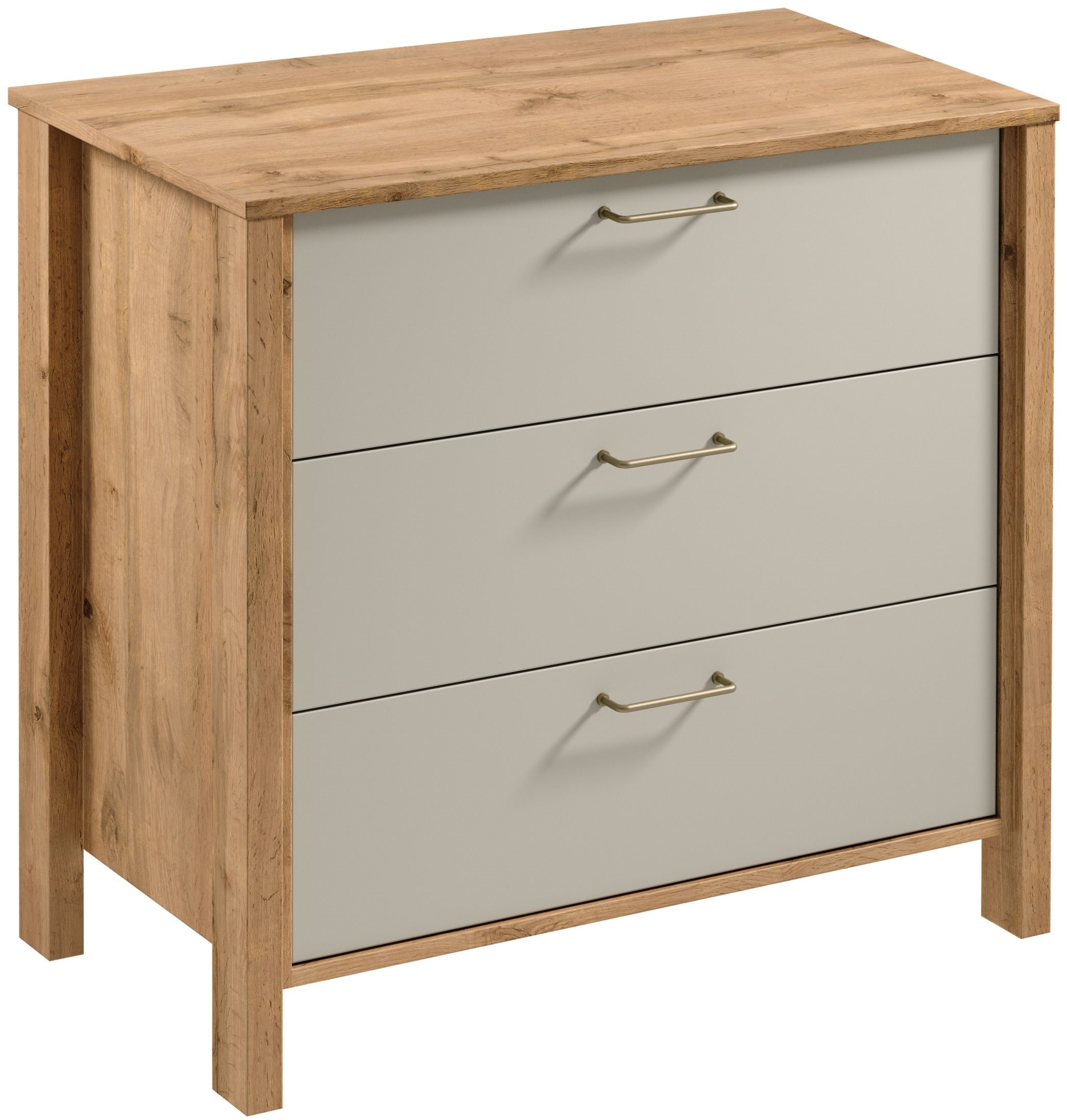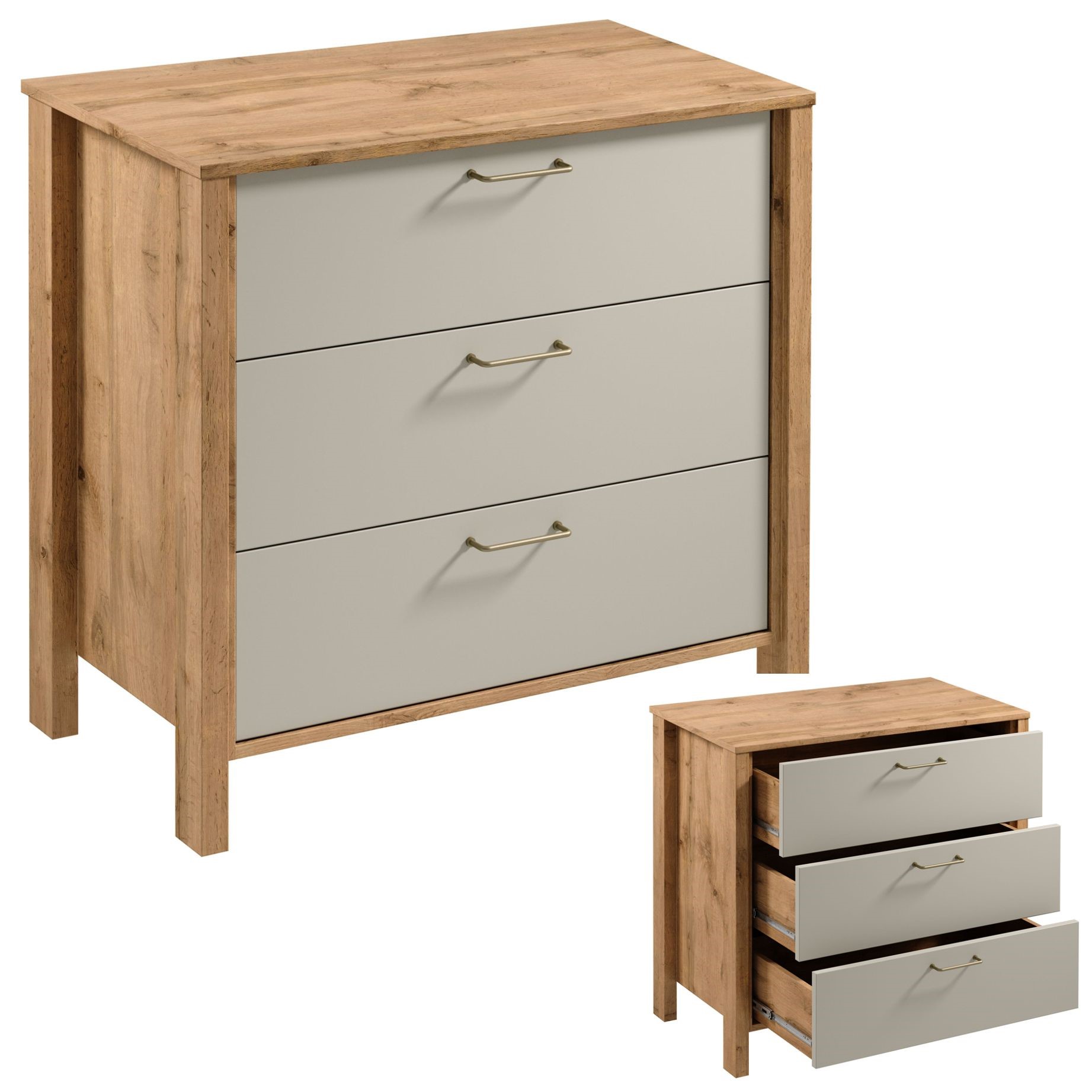 Komoda K3S z trzema pojemnymi szufladami z pełnym wysuwem co znacznie ułatwia dostęp do przedmiotów znajdujących się w niej. Szuflady będą odpowiednim miejscem na mniejsze drobiazgi, sprzęt elektroniczny czy dokumenty. Powierzchnia blatu pozwala na wyeksponowanie dekoracji a wysokie umożliwiają łatwy dostęp robotom sprzątającym . Metalowe uchwyty w matowo złotym kolorze i o ergonomicznym kształcie nadają elegancji. Naturalna kolorystyka ciepłego dekoru Dąb Wotan na korpusie mebla w połączeniu z mono- kolorem beżu sprawia, że kolekcja jest naturalnie piękna.