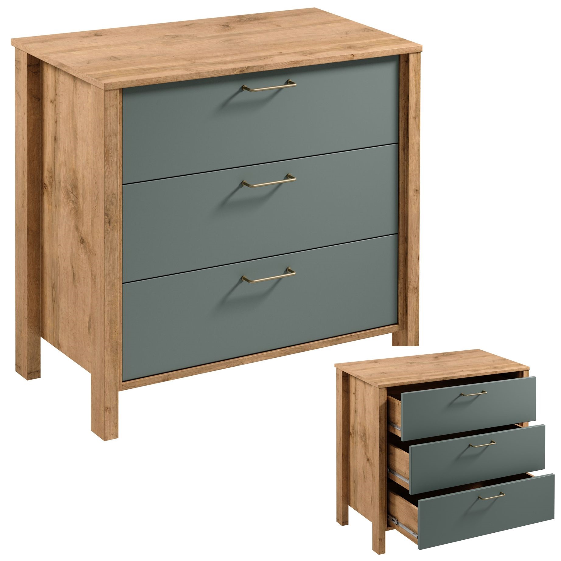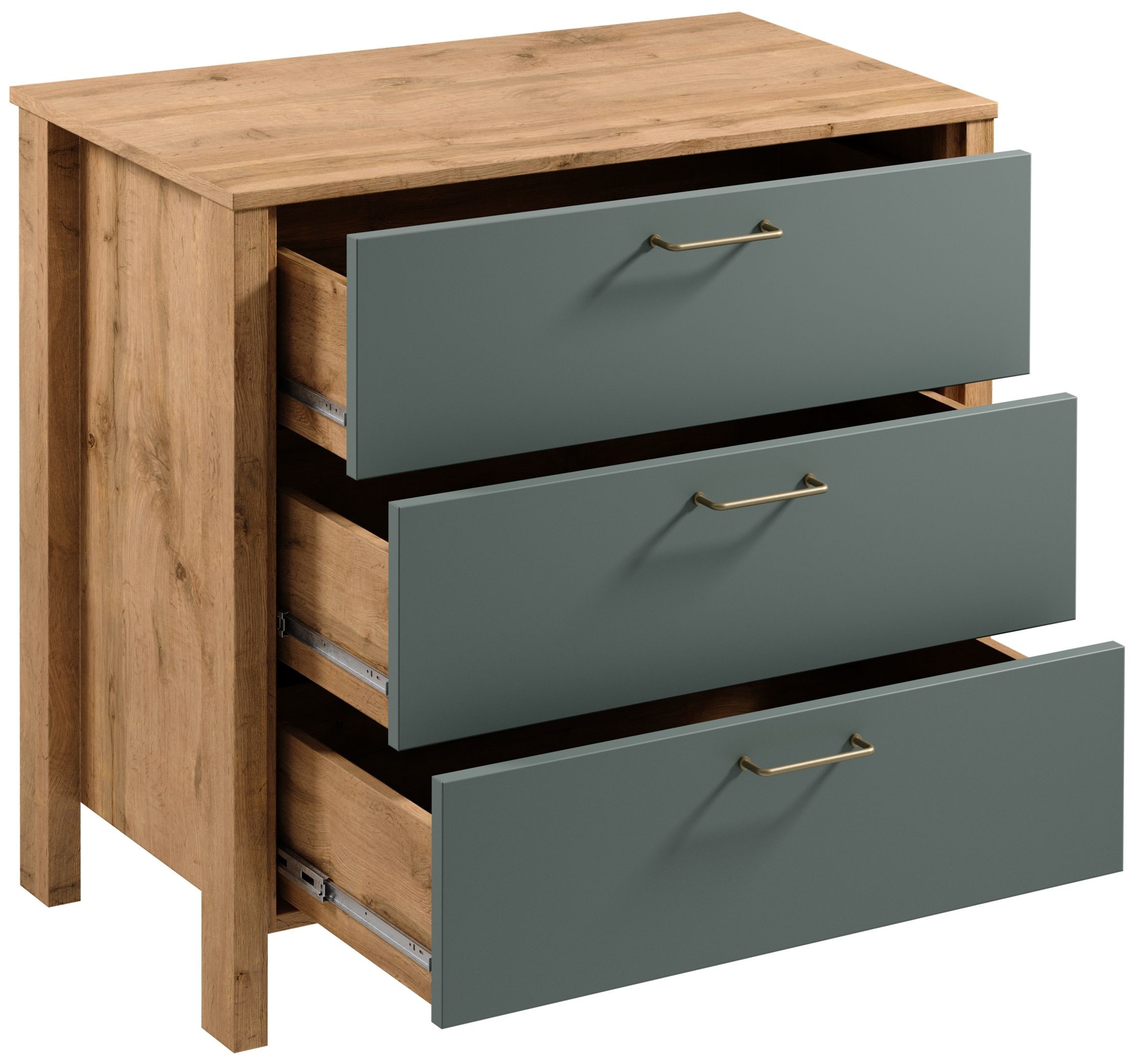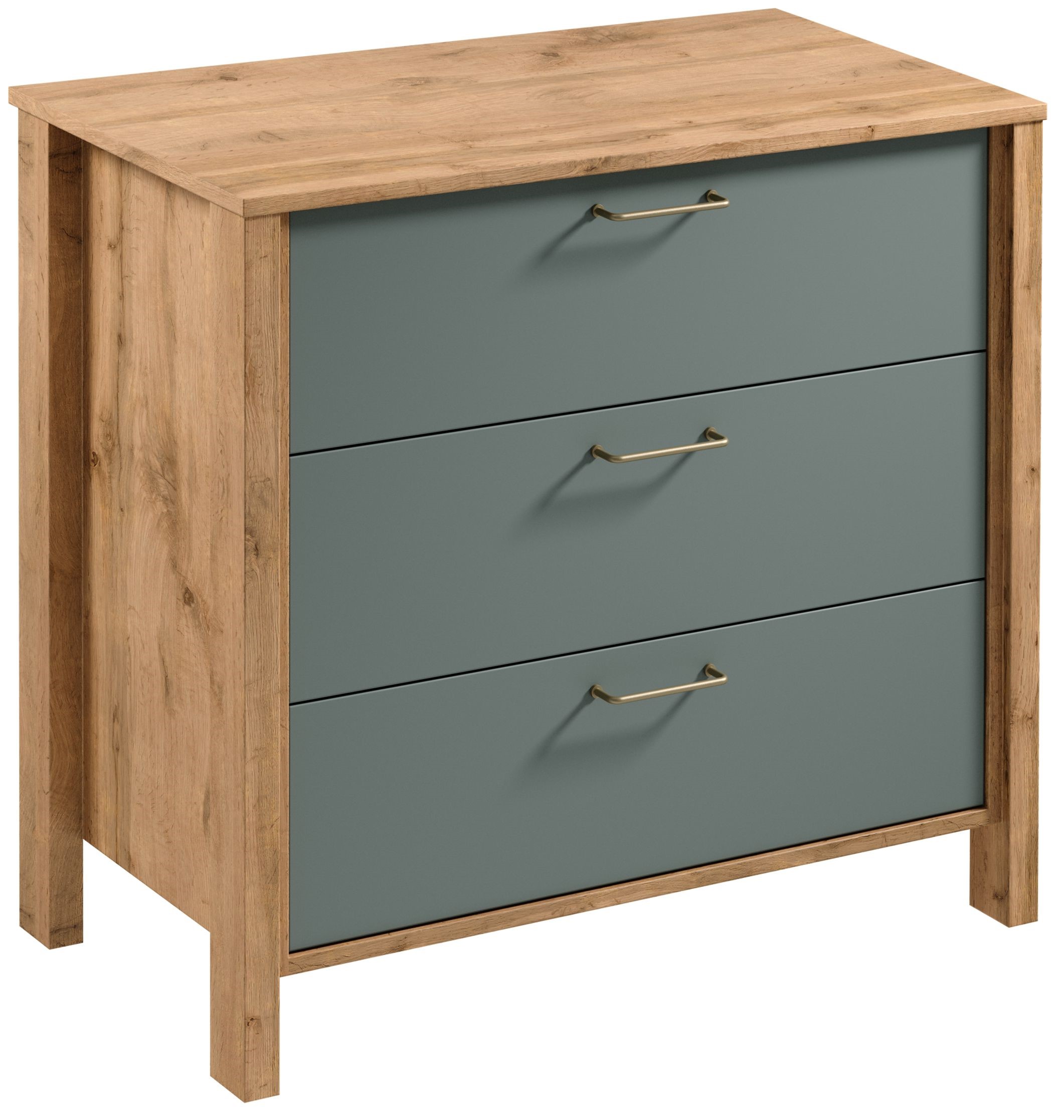 Komoda K3S z trzema pojemnymi szufladami z pełnym wysuwem co znacznie ułatwia dostęp do przedmiotów znajdujących się w niej. Szuflady będą odpowiednim miejscem na mniejsze drobiazgi, sprzęt elektroniczny czy dokumenty. Powierzchnia blatu pozwala na wyeksponowanie dekoracji a wysokie umożliwiają łatwy dostęp robotom sprzątającym . Metalowe uchwyty w matowo złotym kolorze i o ergonomicznym kształcie nadają elegancji. Naturalna kolorystyka ciepłego dekoru Dąb Wotan na korpusie mebla w połączeniu z mono- kolorem zieleni sprawia, że kolekcja jest naturalnie piękna.