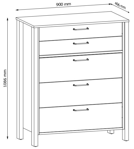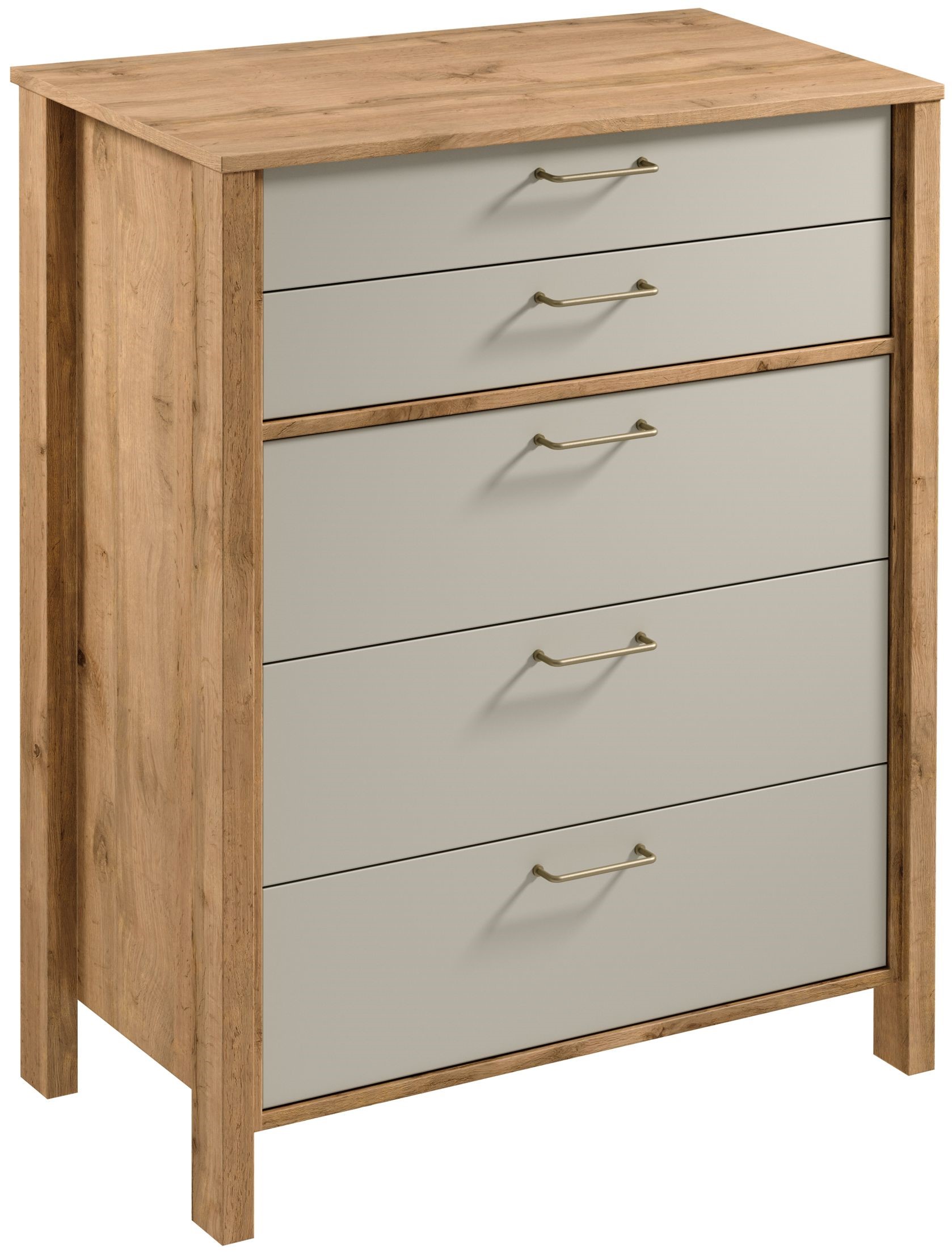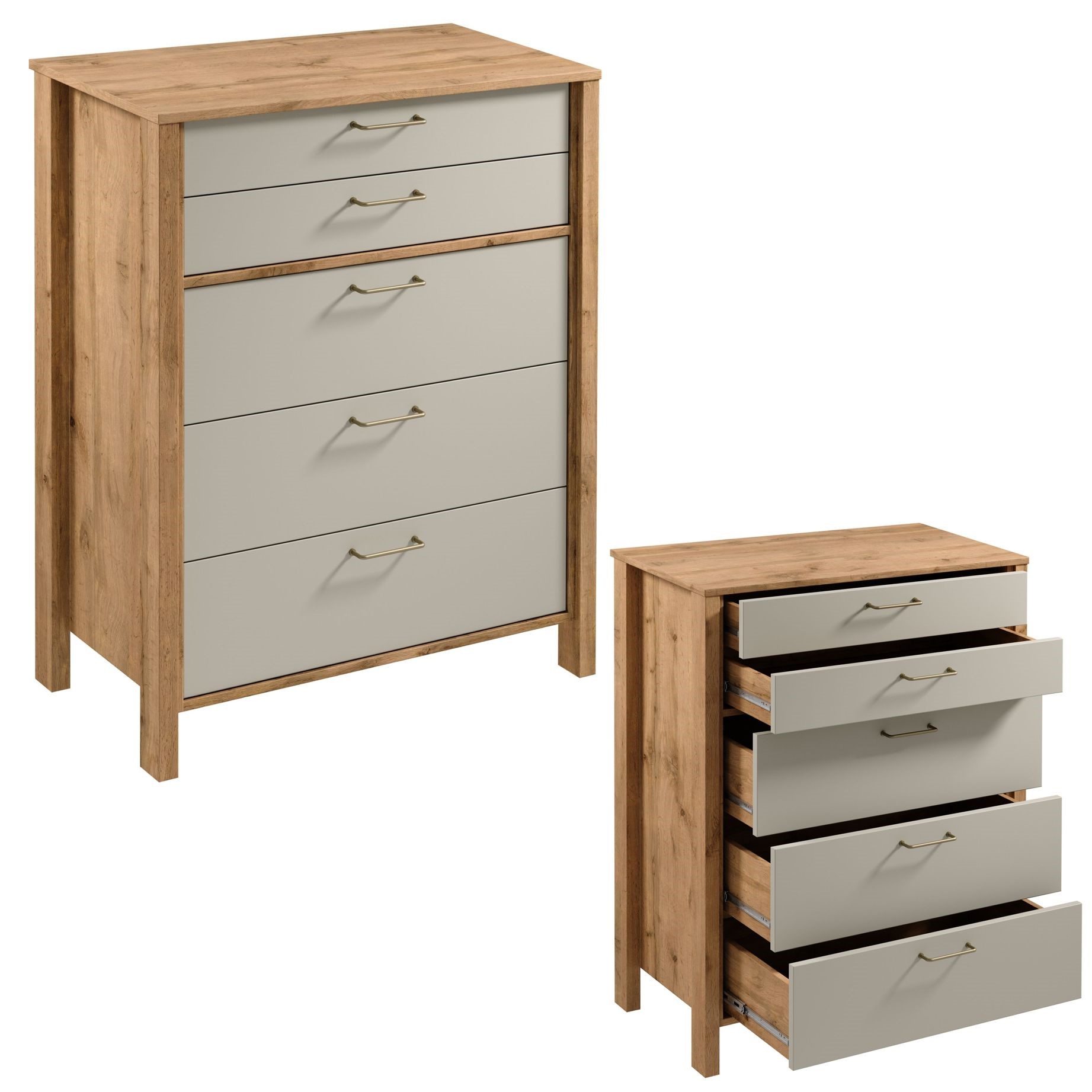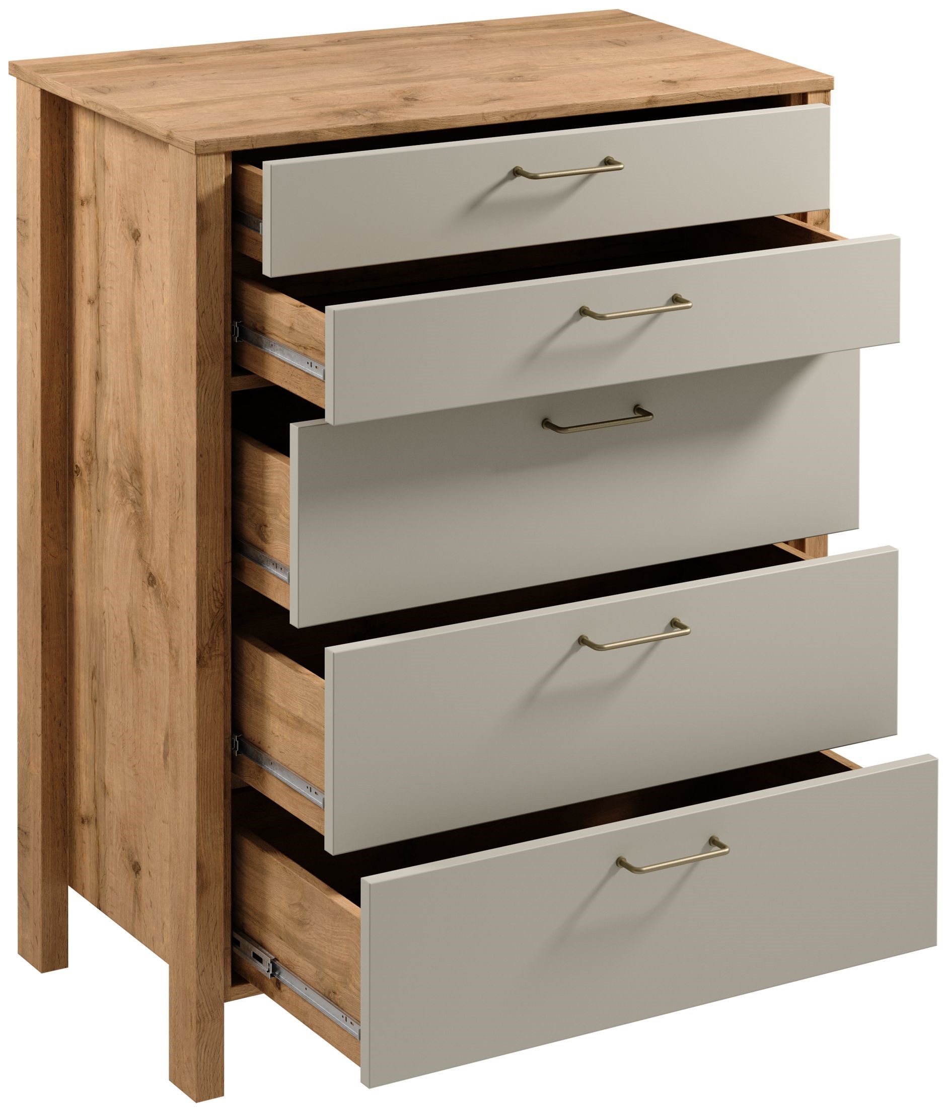 Komoda K5S z trzema pojemnymi szufladami, które świetnie sprawdzą się na drobne elementy garderoby, a dwie mniejsze szuflady będą doskonałym uzupełnieniem na drobiazgi. Szuflady posiadają funkcję pełnego wysuwu co znacznie ułatwia dostęp do przedmiotów znajdujących się w środku. Powierzchnia blatu pozwala na wyeksponowanie dekoracji a wysokie umożliwiają łatwy dostęp robotom sprzątającym . Metalowe uchwyty w matowo złotym kolorze i o ergonomicznym kształcie nadają elegancji. Naturalna kolorystyka ciepłego dekoru Dąb Wotan na korpusie mebla w połączeniu z mono- kolorem beżu sprawia, że kolekcja jest naturalnie piękna.