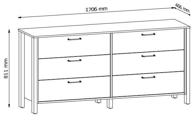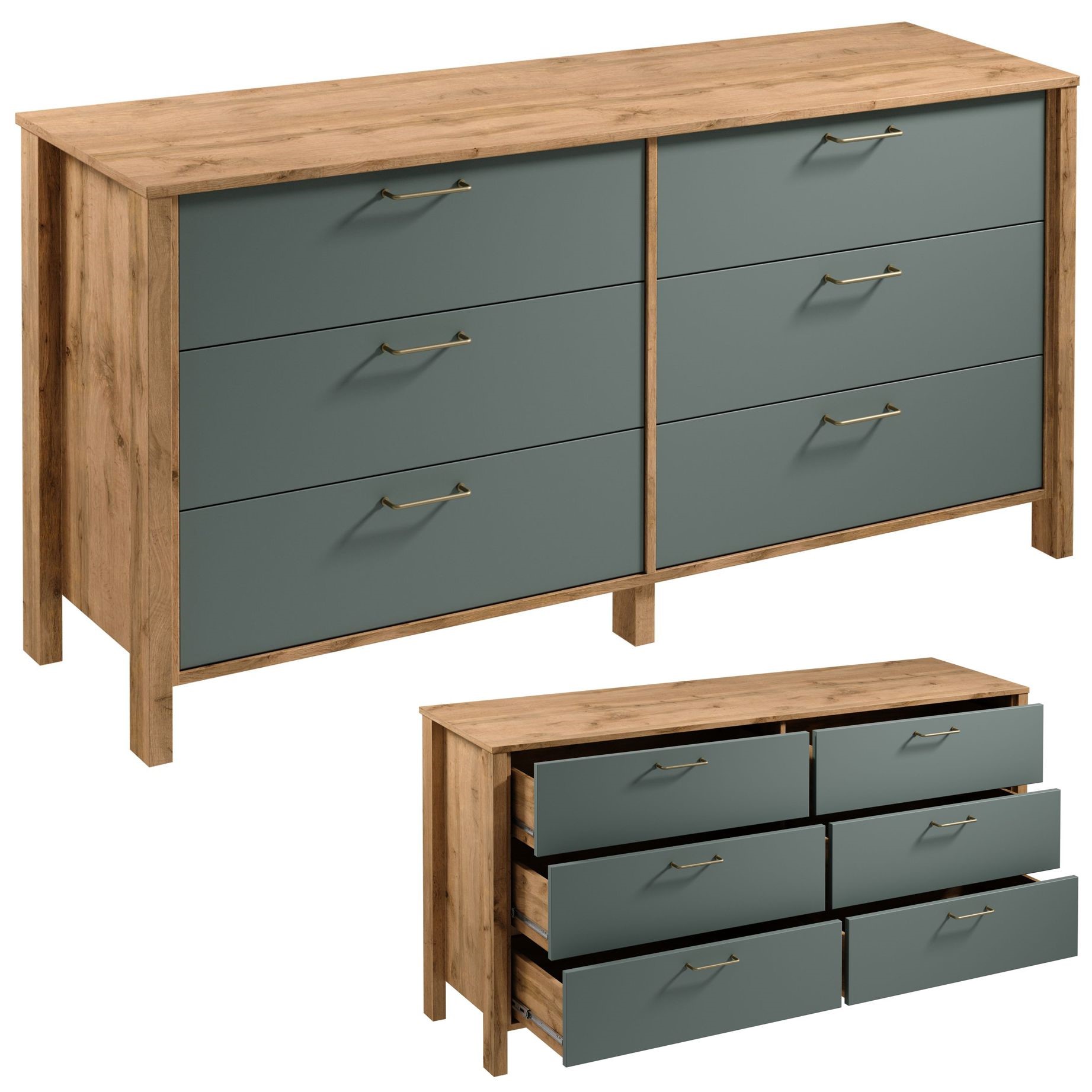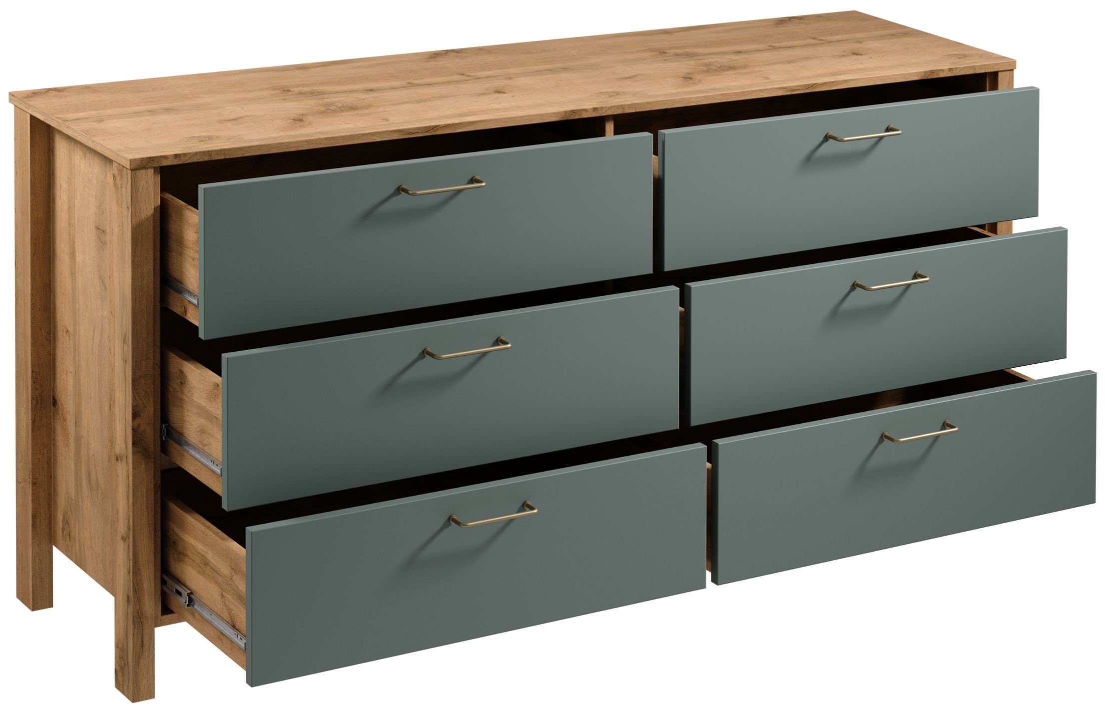 Komoda K6S to idealna propozycja dla ludzi ceniących ład i porządek. Posiada sześć pojemnych szuflad z pełnym wysuwem co ułatwia dostęp do przedmiotów znajdujących się w niej. Szuflady będą odpowiednim miejscem na mniejsze drobiazgi, sprzęt elektroniczny czy dokumenty. Duża powierzchnia blatu pozwala na wyeksponowanie dekoracji, a wysokie nózki umożliwiają łatwy dostęp robotom sprzątającym . Metalowe uchwyty w matowo złotym kolorze i o ergonomicznym kształcie nadają elegancji. Naturalna kolorystyka ciepłego dekoru Dąb Wotan na korpusie mebla w połączeniu z mono- kolorem zieleni sprawia, że kolekcja jest naturalnie piękna.