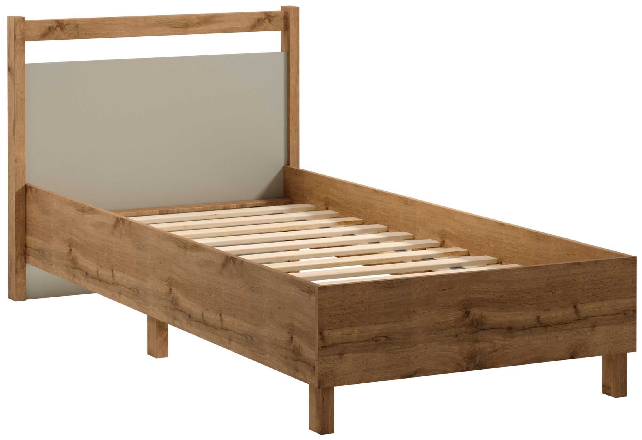 L90 rama łóżka ze stelażem z drewna sosnowego. Powierzchnia spania 90x 200. Naturalna kolorystyka ciepłego dekoru Dąb Wotan jako baza meble w połączeniu z mono- kolorem beżu sprawia, że kolekcja jest naturalnie piękna.