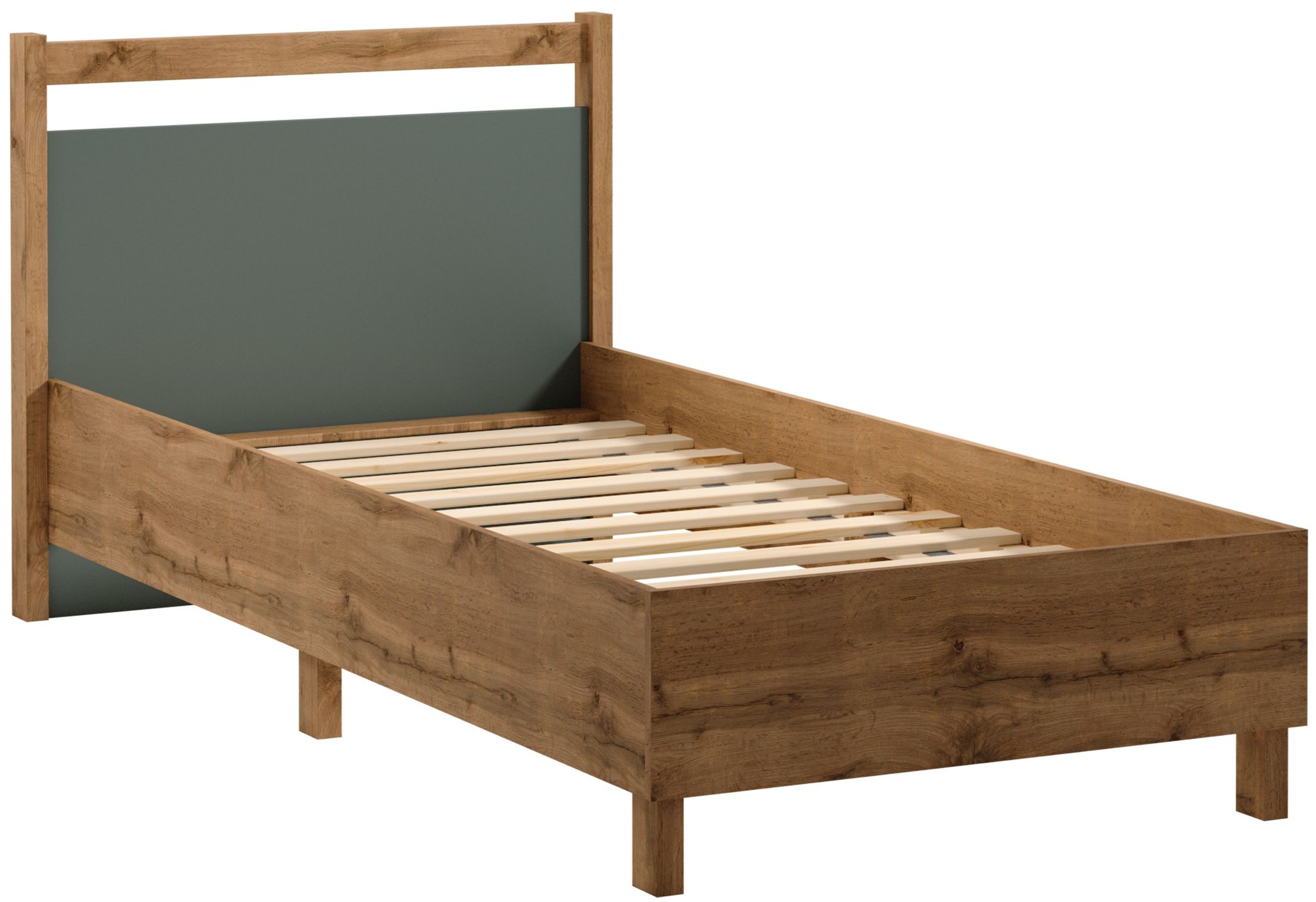 L90 rama łóżka ze stelażem z drewna sosnowego. Powierzchnia spania 90x 200. Naturalna kolorystyka ciepłego dekoru Dąb Wotan jako baza meble w połączeniu z mono- kolorem zieleni sprawia, że kolekcja jest naturalnie piękna.