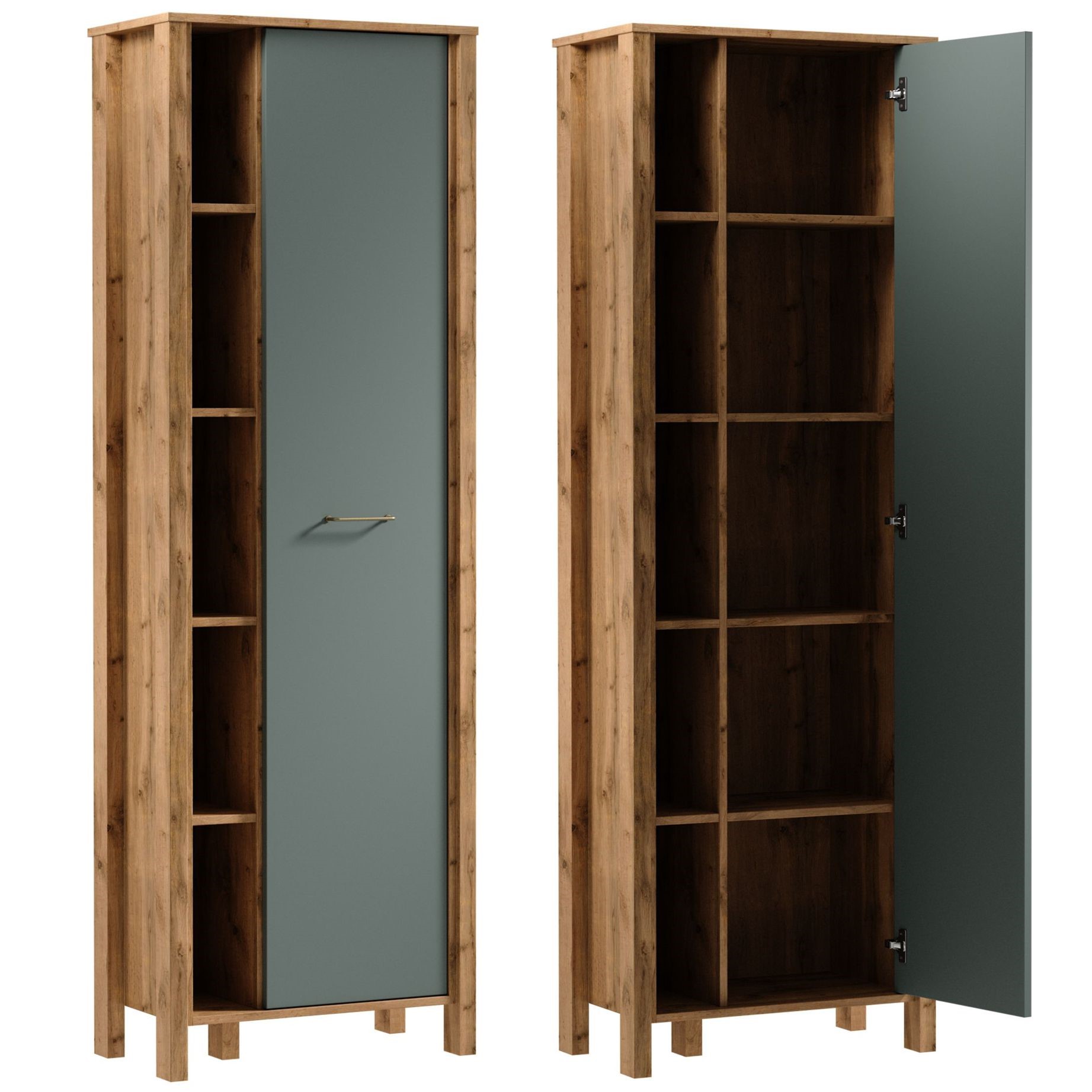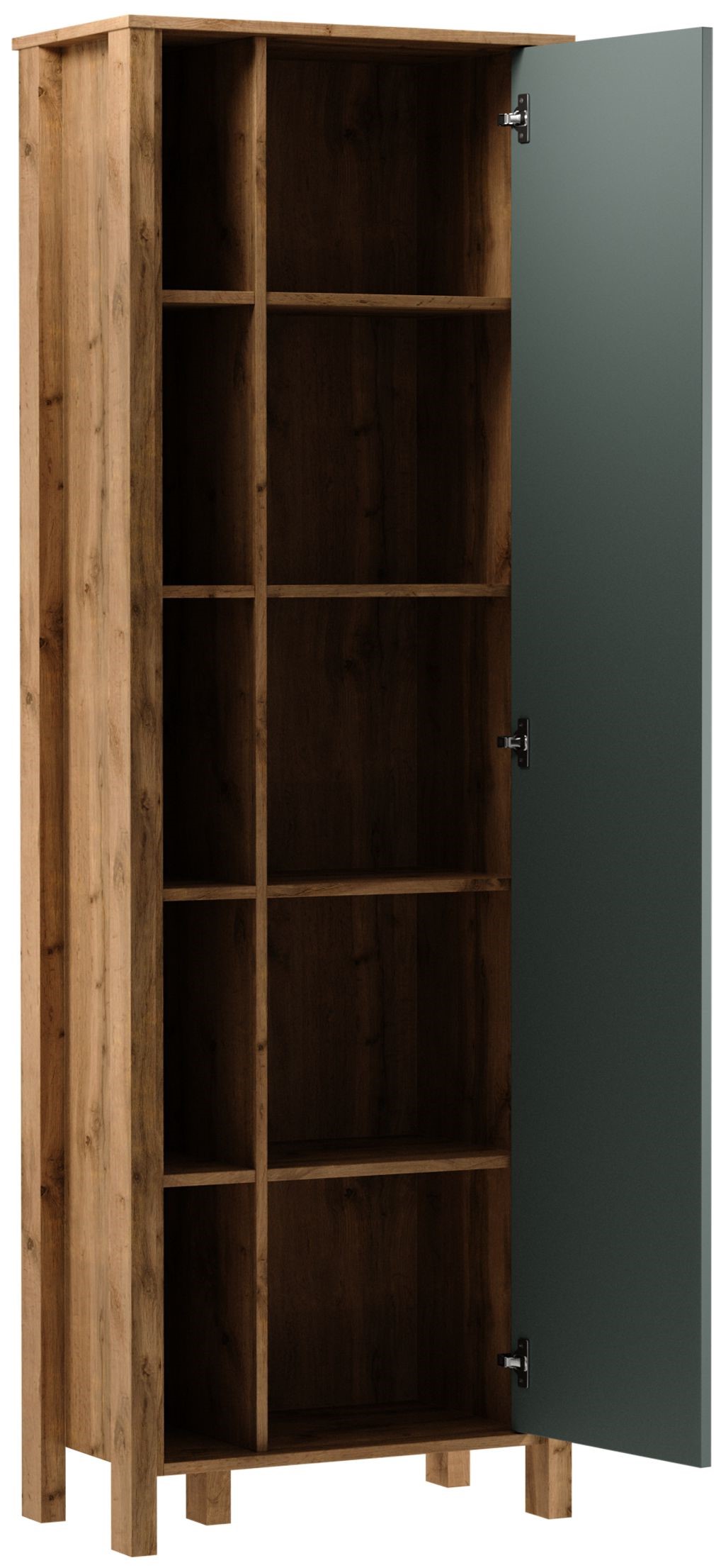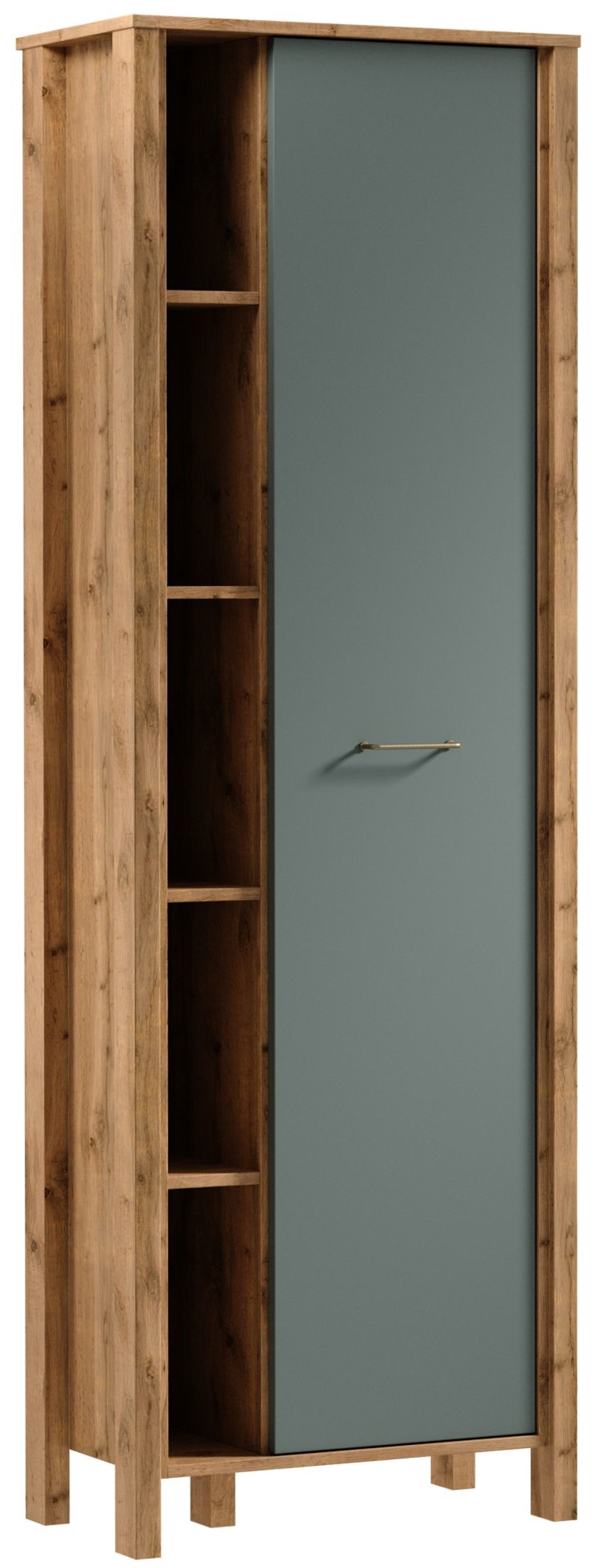 R1D regał na dekoracje, pamiątki z podróży i wszystko to co chcemy wyeksponować a także z miejscem do przechowywania za zamkniętymi drzwiami. Uchwyt w matowo złotym kolorze dodaje elegancji. Naturalna kolorystyka ciepłego dekoru Dąb Wotan na korpusie mebla w połączeniu z mono- kolorem zieleni sprawia, że kolekcja jest naturalnie piękna.