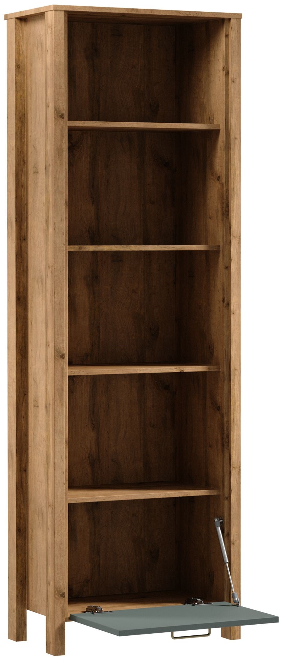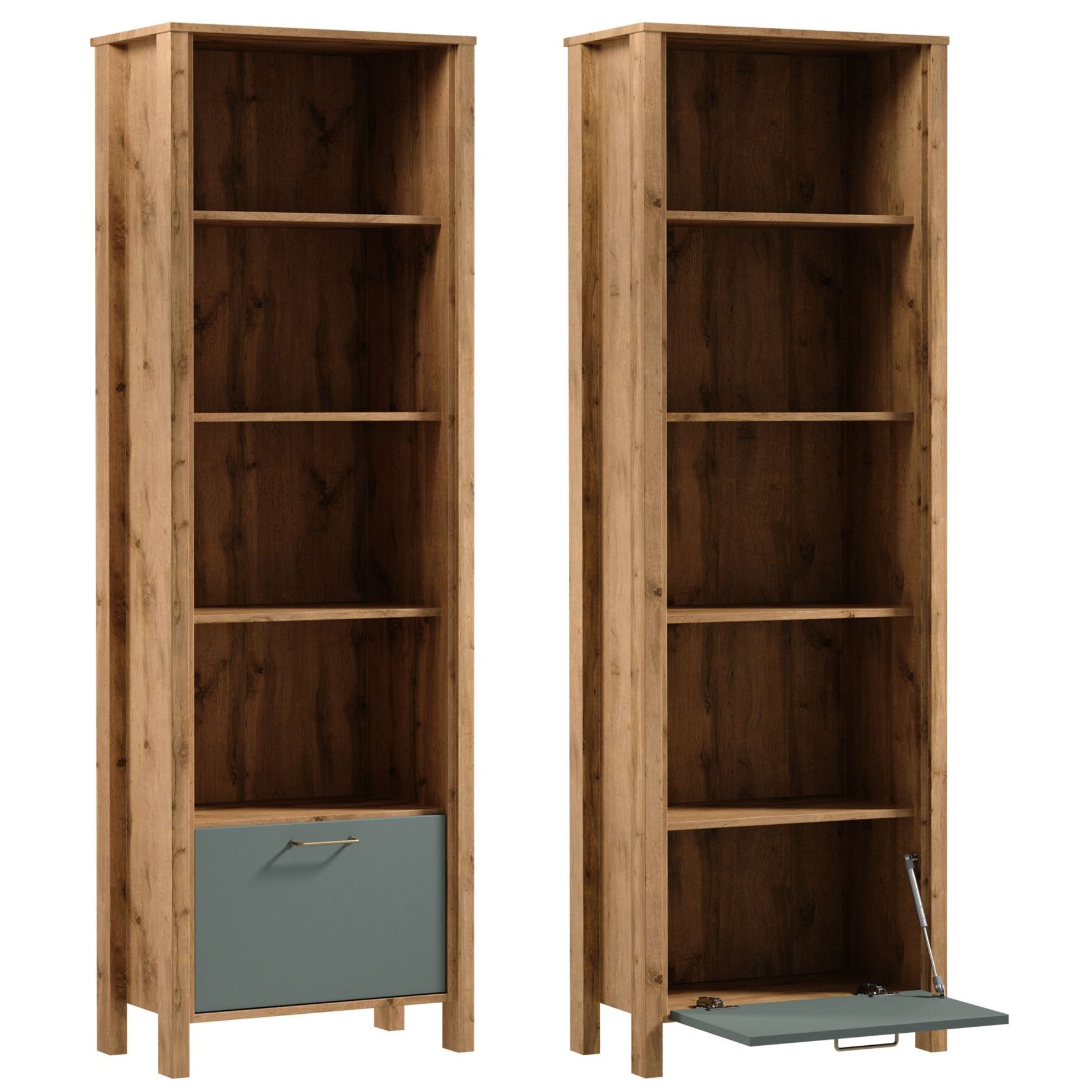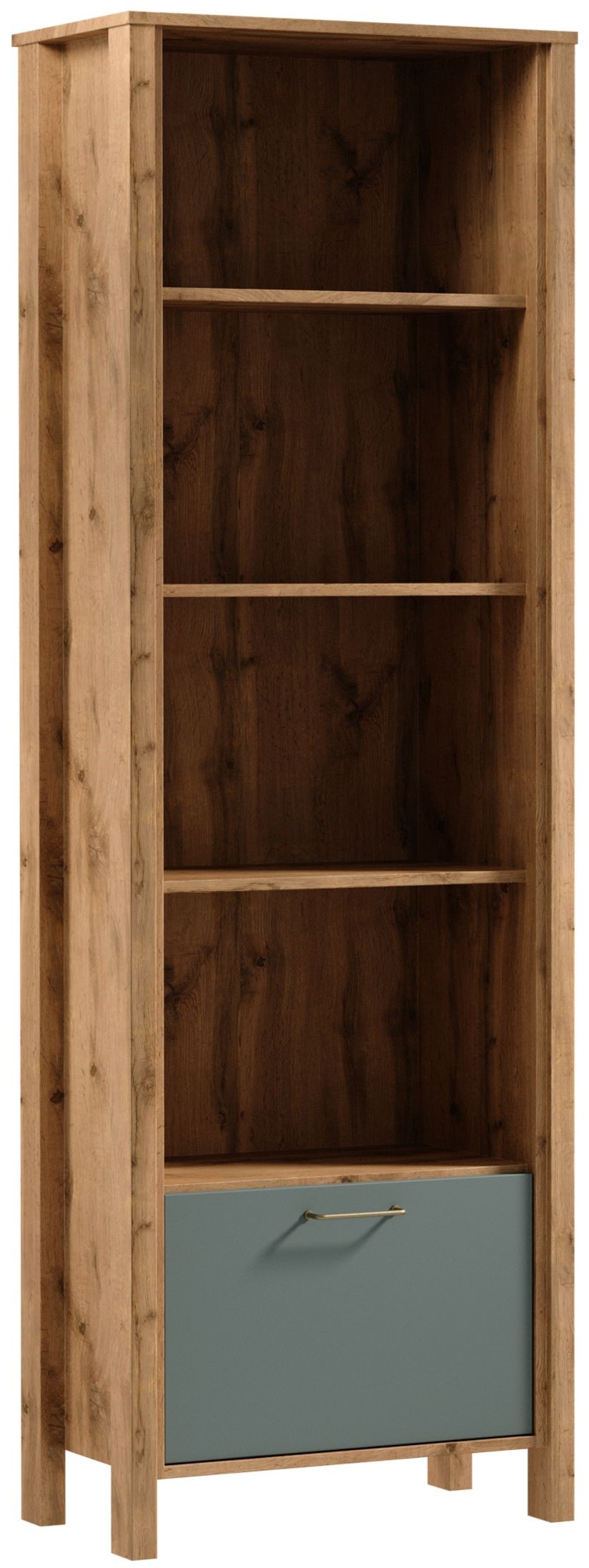 R1K regał na dekoracje, pamiątki z podróży i wszystko to co chcemy wyeksponować a także szafka z miejscem do przechowywania za zamkniętymi drzwiczkami. Uchwyt w matowo złotym kolorze dodaje elegancji. Naturalna kolorystyka ciepłego dekoru Dąb Wotan na korpusie mebla w połączeniu z mono- kolorem zieleni sprawia, że kolekcja jest naturalnie piękna.