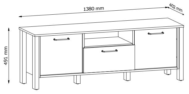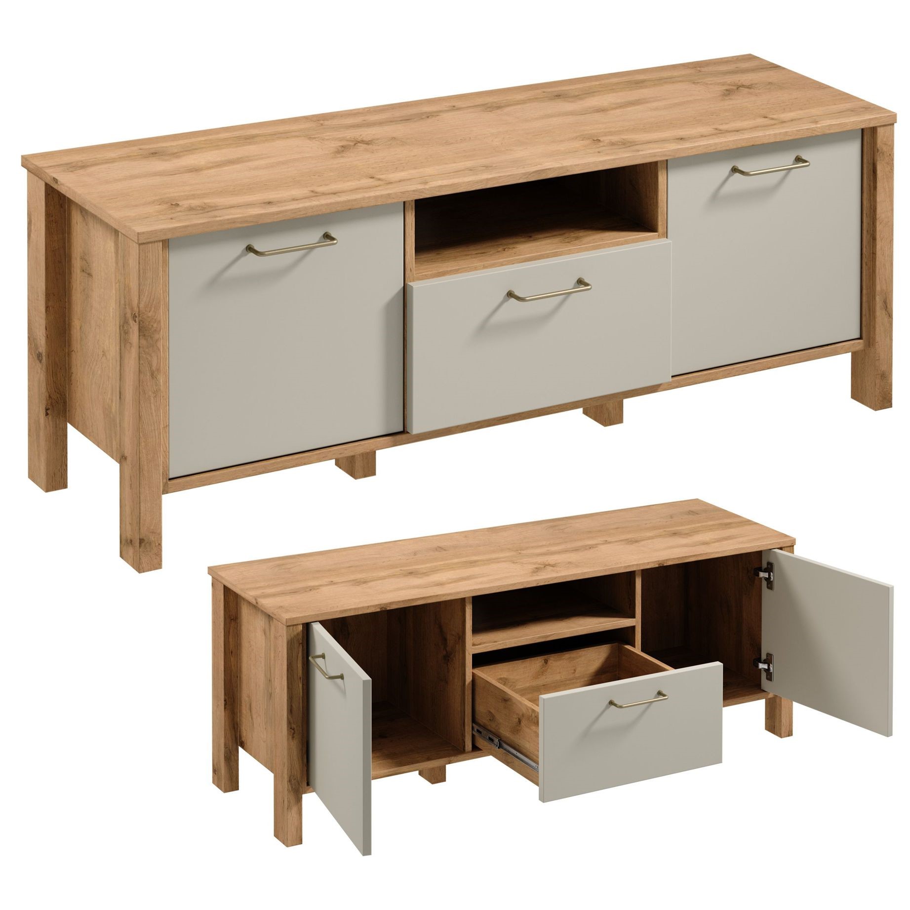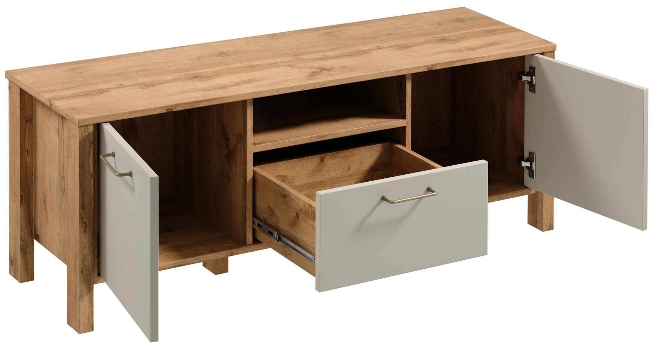 Szafka RTV1S z trójwymiarowym efektem dzięki wpuszczanym frontom szafek i wyeksponowanej szufladzie, która świetnie sprawdzi się na drobne akcesoria RTV, dwie szafki, które oferują dodatkową przestrzeń do przechowywania. Szuflady posiadają funkcję pełnego wysuwu co znacznie ułatwia dostęp do przedmiotów znajdujących się w środku. Wysokie nóżki umożliwiają łatwy dostęp robotom sprzątającym. Metalowe uchwyty w matowo złotym kolorze i o ergonomicznym kształcie nadają elegancji. Naturalna kolorystyka ciepłego dekoru Dąb Wotan na korpusie mebla w połączeniu z mono- kolorem beżu sprawia, że kolekcja jest naturalnie piękna.
