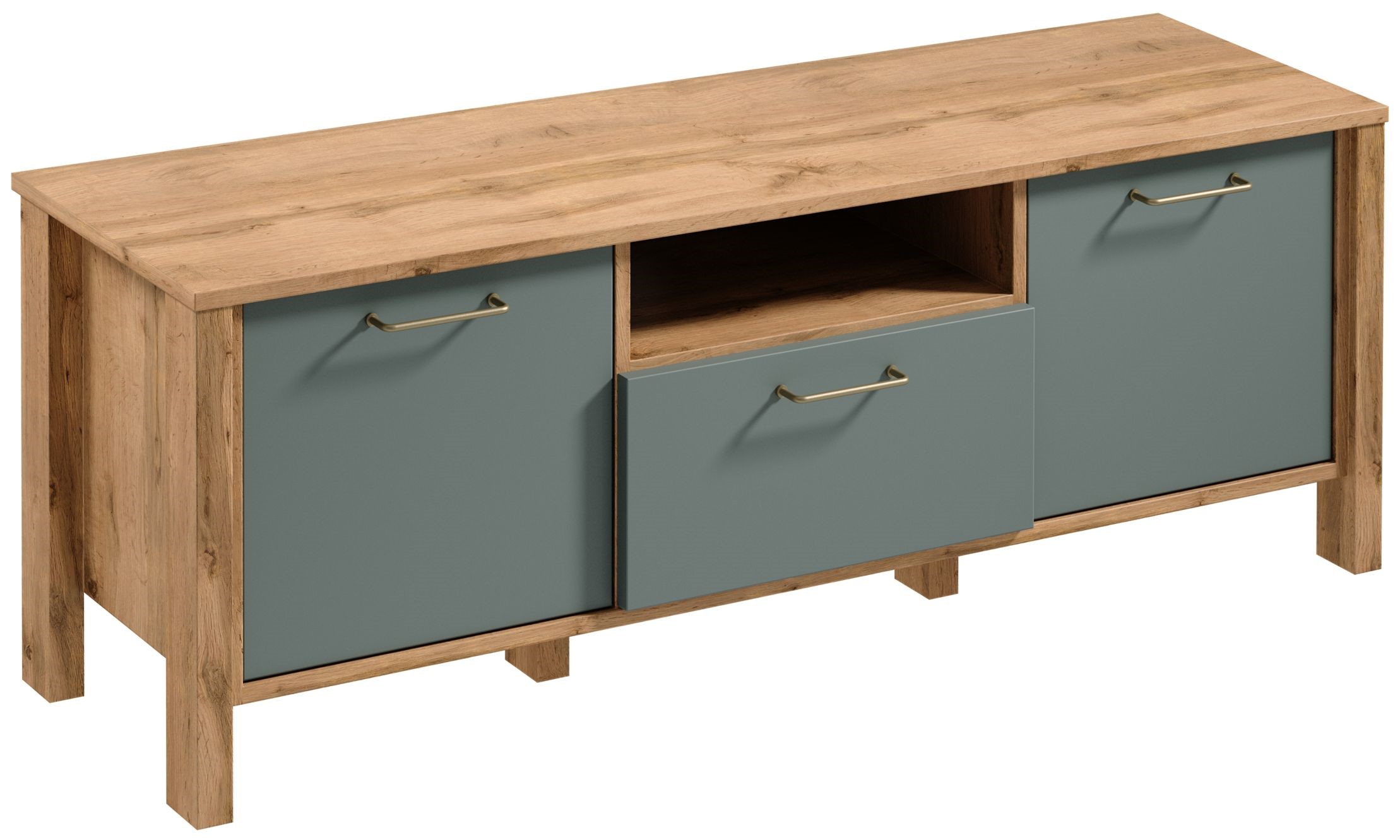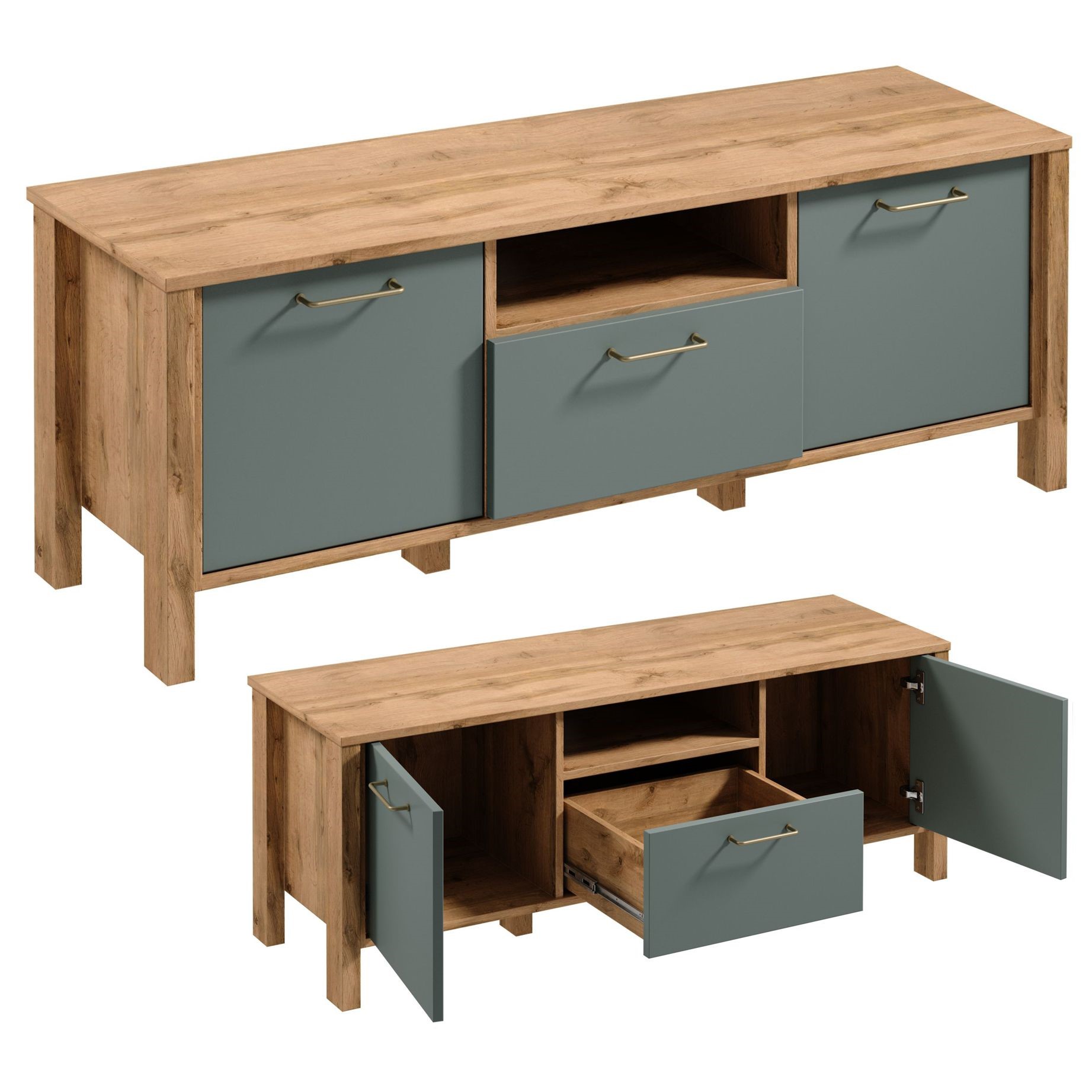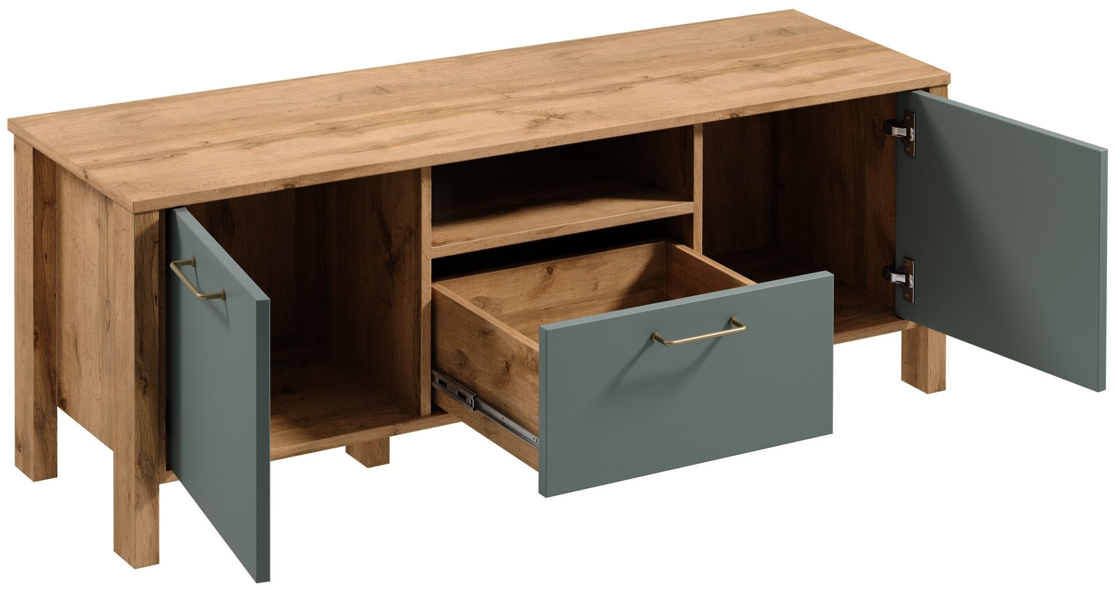Szafka RTV1S z trójwymiarowym efektem dzięki wpuszczanym frontom szafek i wyeksponowanej szufladzie, która świetnie sprawdzi się na drobne akcesoria RTV, dwie szafki, które oferują dodatkową przestrzeń do przechowywania. Szuflady posiadają funkcję pełnego wysuwu co znacznie ułatwia dostęp do przedmiotów znajdujących się w środku. Wysokie nóżki umożliwiają łatwy dostęp robotom sprzątającym. Metalowe uchwyty w matowo złotym kolorze i o ergonomicznym kształcie nadają elegancji. Naturalna kolorystyka ciepłego dekoru Dąb Wotan na korpusie mebla w połączeniu z mono- kolorem zieleni sprawia, że kolekcja jest naturalnie piękna.
