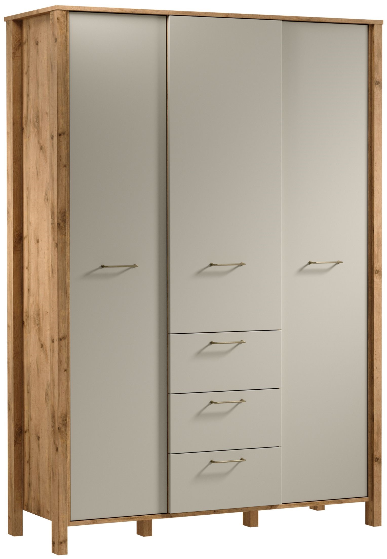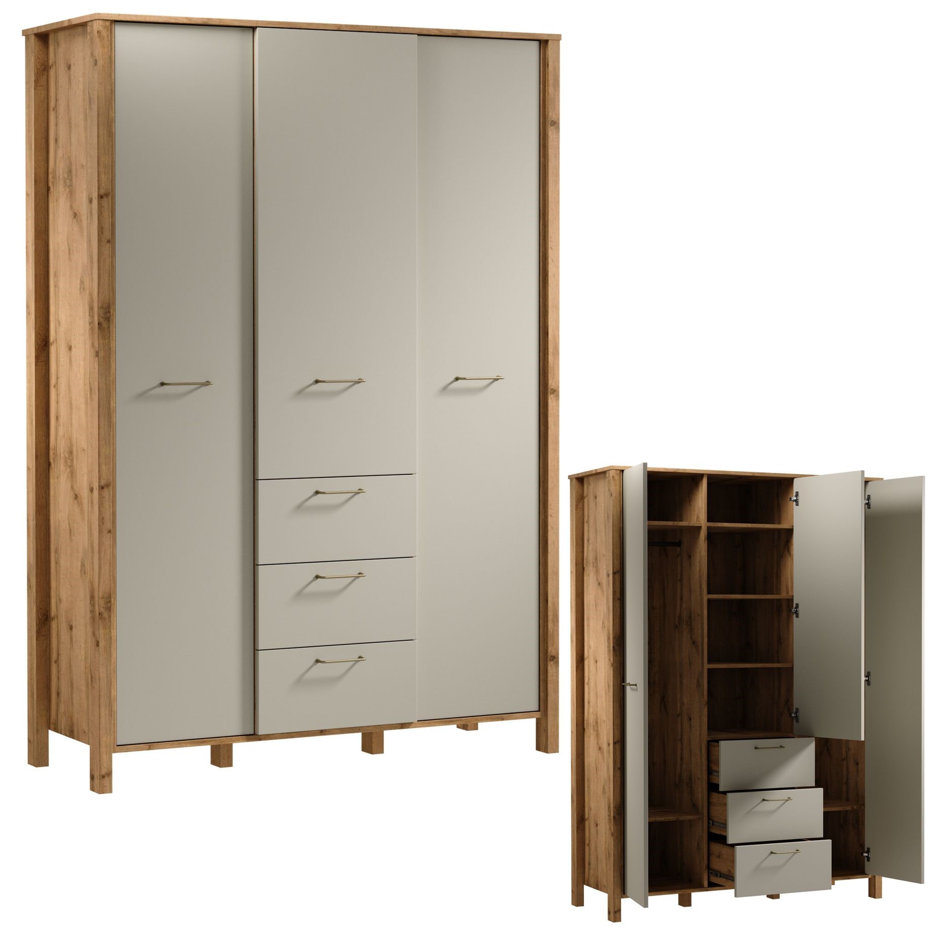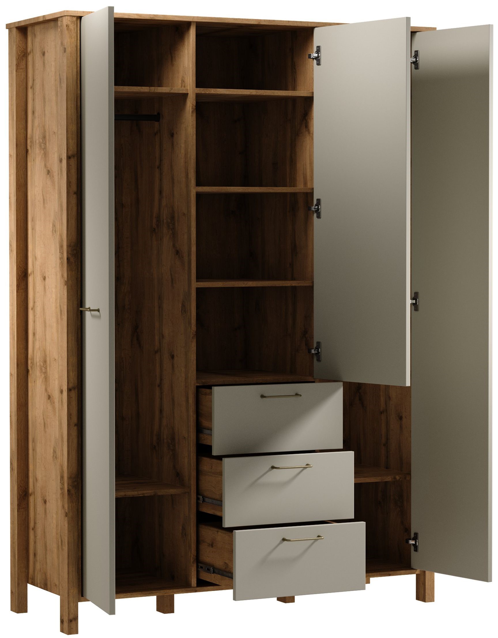 S3D3S szafa z trójwymiarowym efektem dzięki wpuszczanym frontom szafek i wyeksponowanym szufladom, które świetnie sprawdzą się na drobne elementy garderoby. Szuflady posiadają funkcję pełnego wysuwu co znacznie ułatwia dostęp do przedmiotów znajdujących się w środku. W bocznych częściach szafy drążki do zawieszania ubrań i półki do organizacji przestrzeni. Uchwyty w matowo złotym kolorze dodaje elegancji. Naturalna kolorystyka ciepłego dekoru Dąb Wotan na korpusie mebla w połączeniu z mono- kolorem beżu sprawia, że kolekcja jest naturalnie piękna.