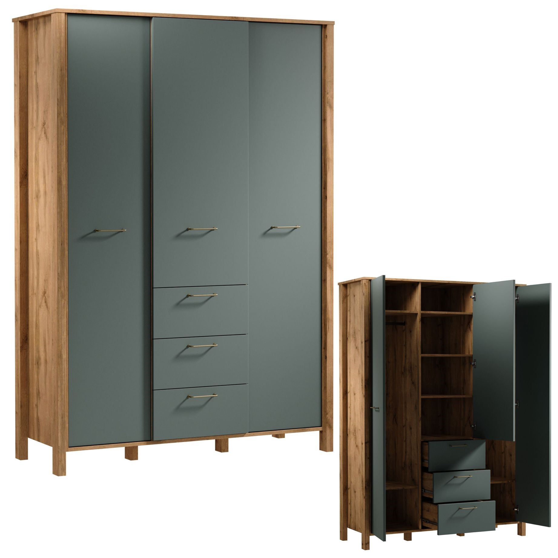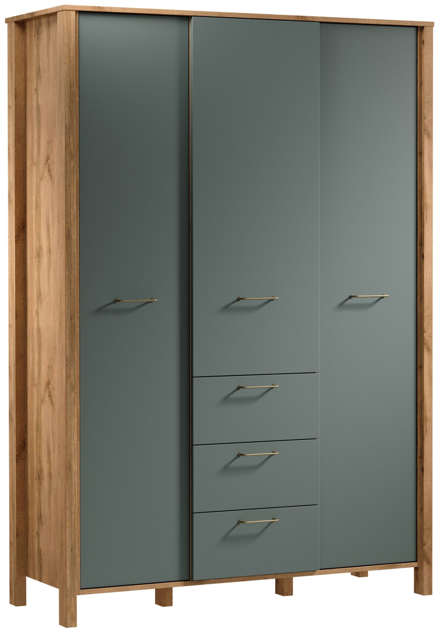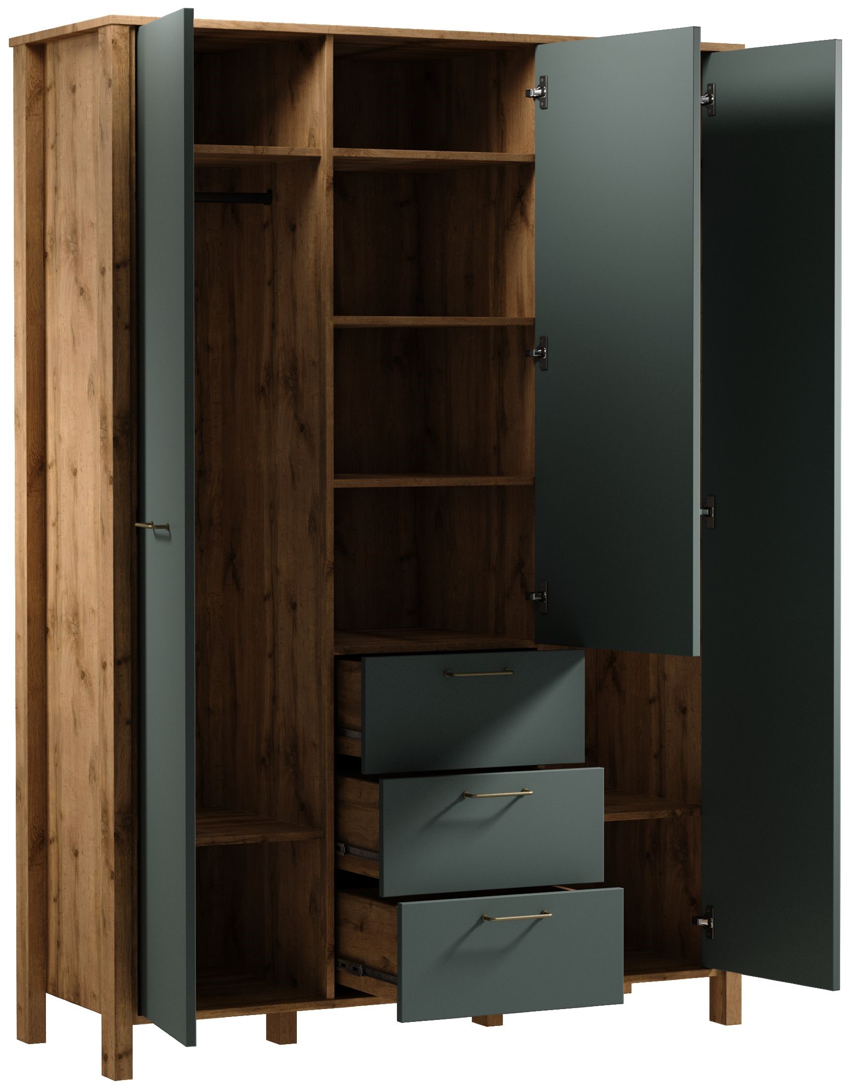 S3D3S szafa z trójwymiarowym efektem dzięki wpuszczanym frontom szafek i wyeksponowanym szufladom, które świetnie sprawdzą się na drobne elementy garderoby. Szuflady posiadają funkcję pełnego wysuwu co znacznie ułatwia dostęp do przedmiotów znajdujących się w środku. W bocznych częściach szafy drążki do zawieszania ubrań i półki do organizacji przestrzeni. Uchwyty w matowo złotym kolorze dodaje elegancji. Naturalna kolorystyka ciepłego dekoru Dąb Wotan na korpusie mebla w połączeniu z mono- kolorem zieleni sprawia, że kolekcja jest naturalnie piękna.