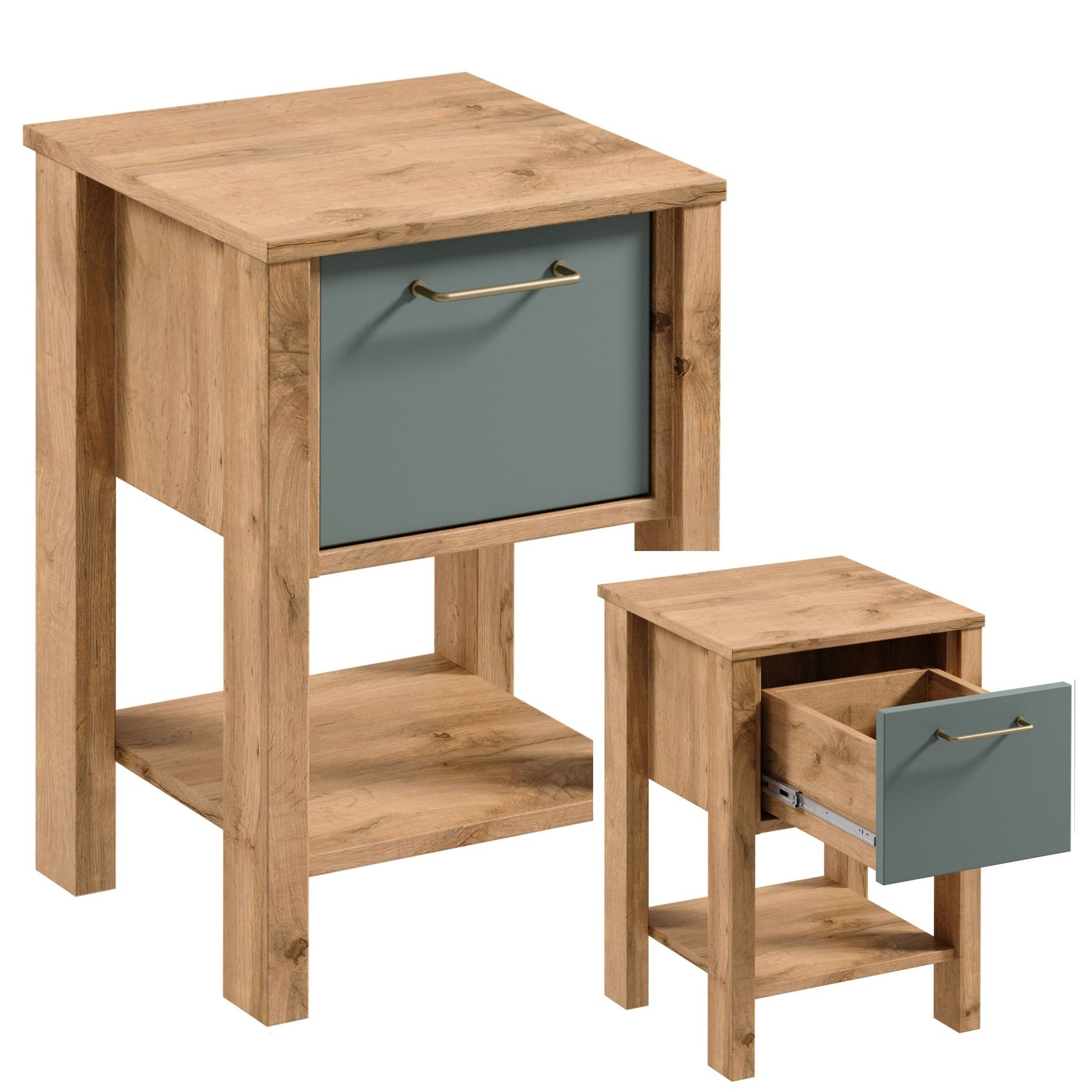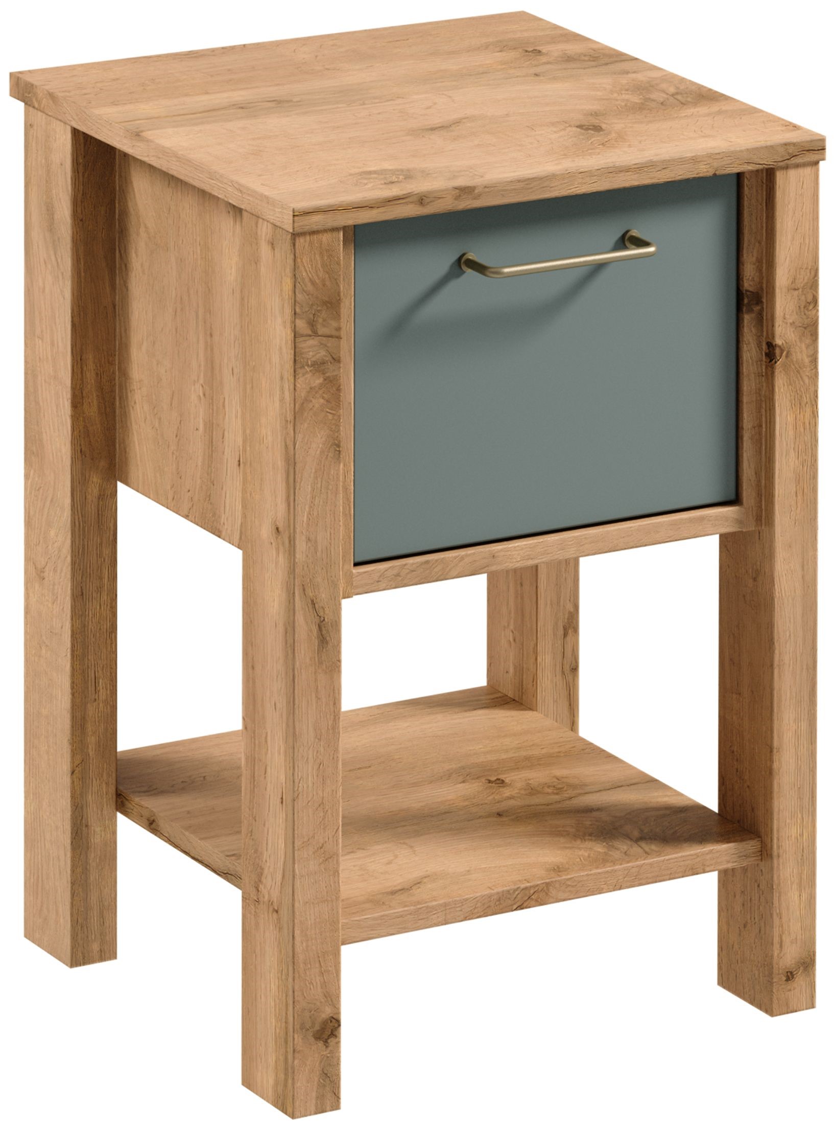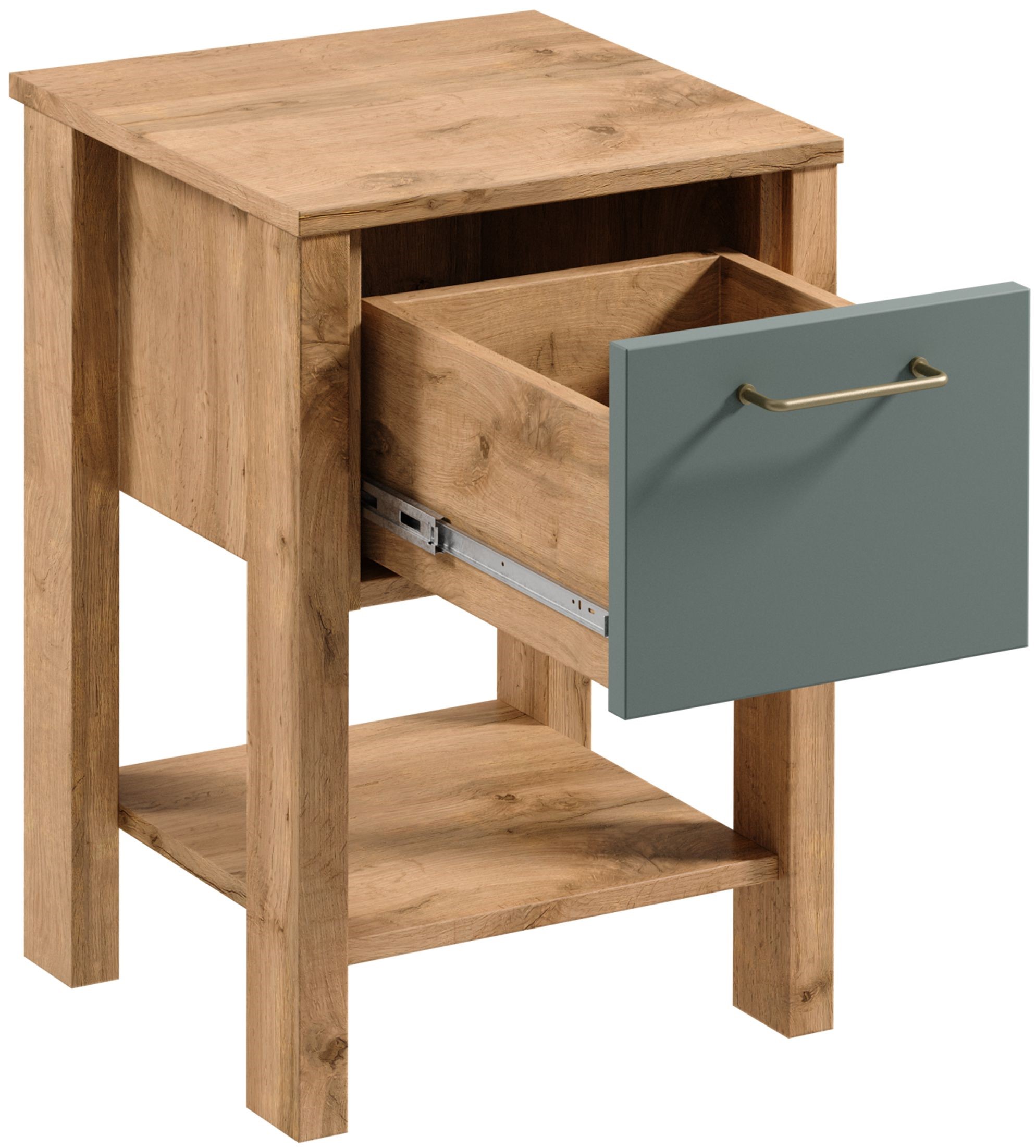 Stolik nocny SN to doskonałe uzupełnienie części sypialnianej , praktyczna szuflada na drobiazgi lub podręczna półka na książkę. Uchwyt w matowo złotym kolorze nadaje elegancji. Naturalna kolorystyka ciepłego dekoru Dąb Wotan jako baza meble w połączeniu z mono- kolorem zieleni sprawia, że kolekcja jest naturalnie piękna.