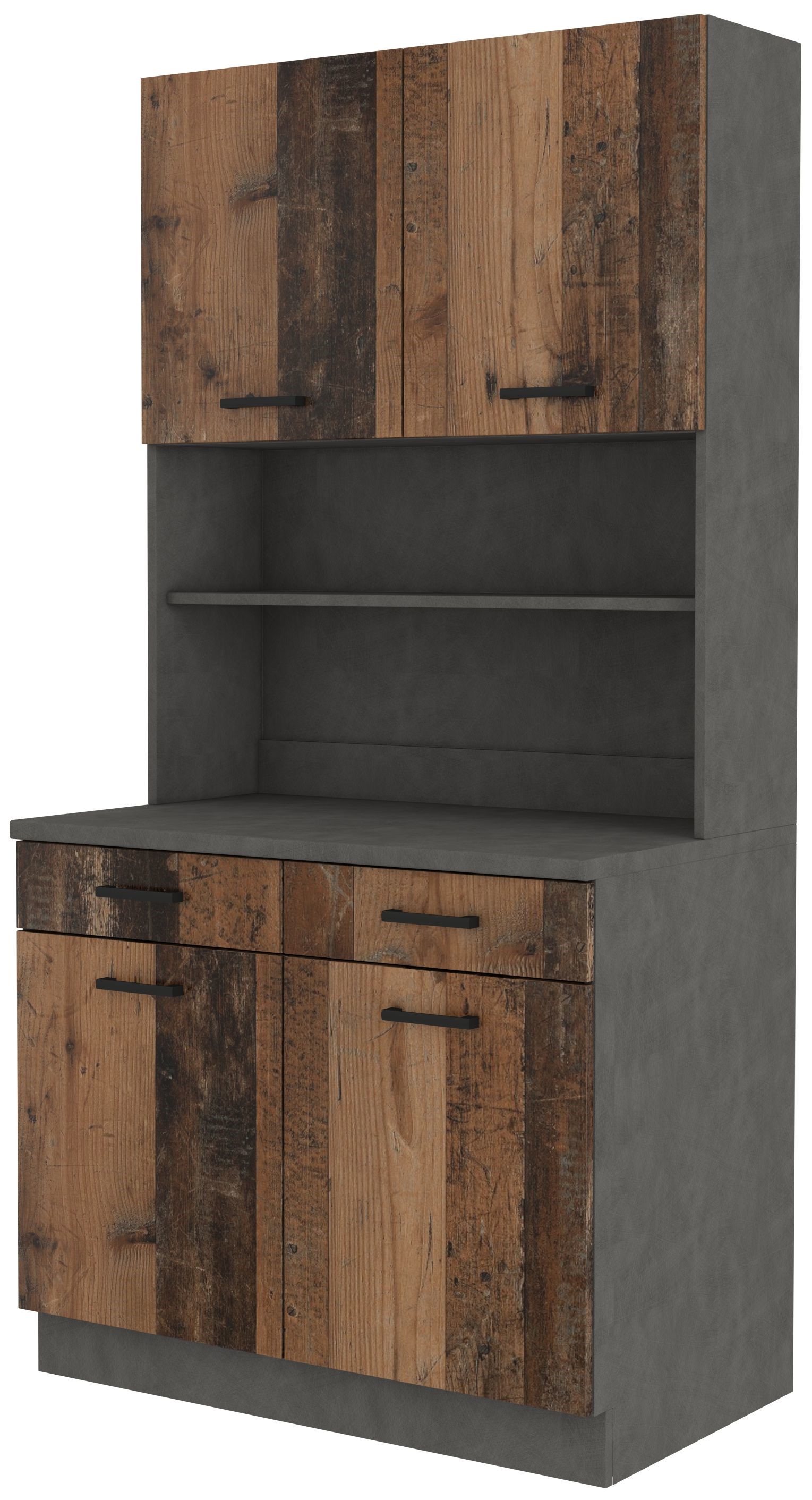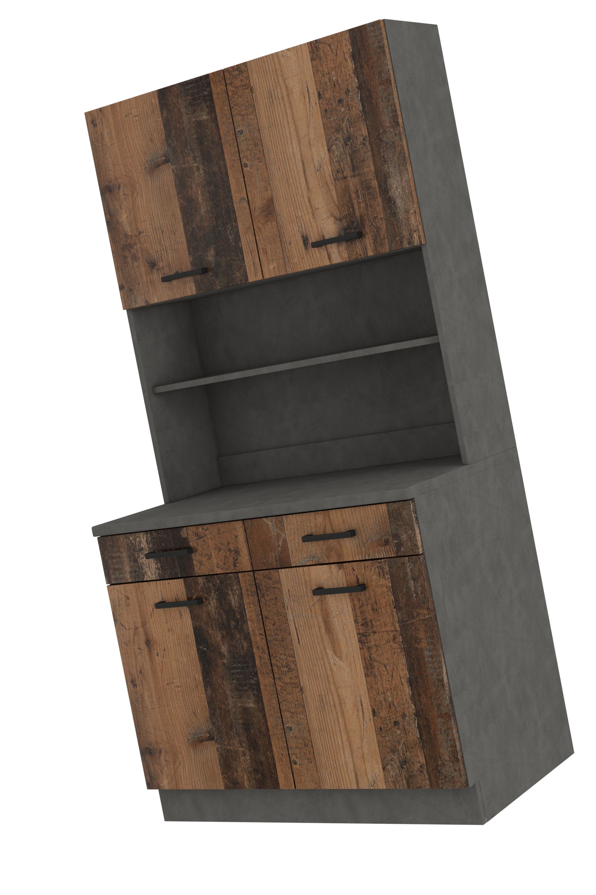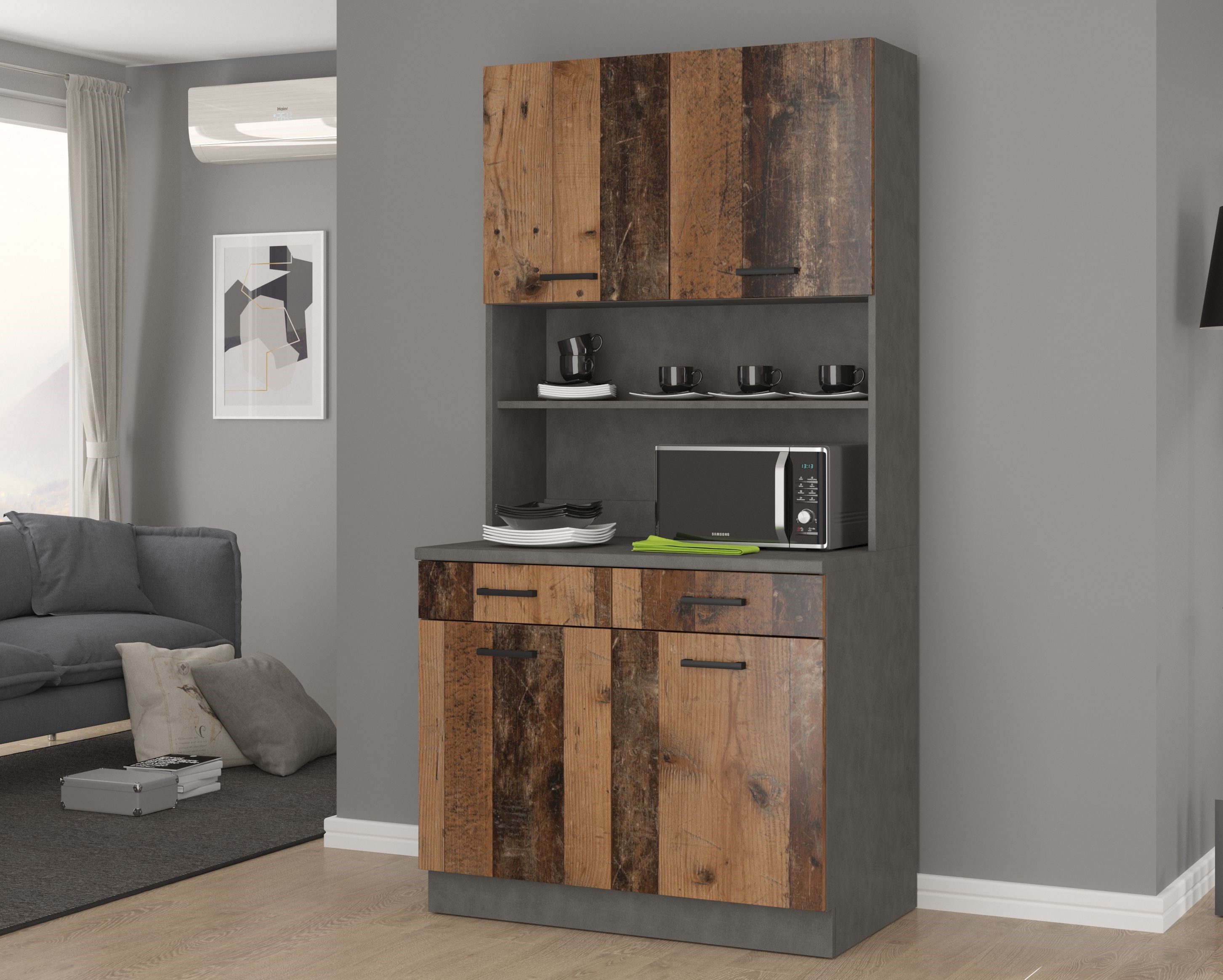 Centralna, otwarta półka pełni funkcję eleganckiej ekspozycji — idealnej na kubki, talerze i dodatki, które podkreślą charakter Twojej kuchni lub aneksu. Blat zapewnia miejsce na mikrofalówkę i codzienne akcesoria, zachowując jednocześnie wizualną harmonię i porządek. Pojemne szafki górne i dolne gwarantują wygodne przechowywanie, a minimalistyczne czarne uchwyty dodają całości nowoczesnej, luksusowej lekkości.