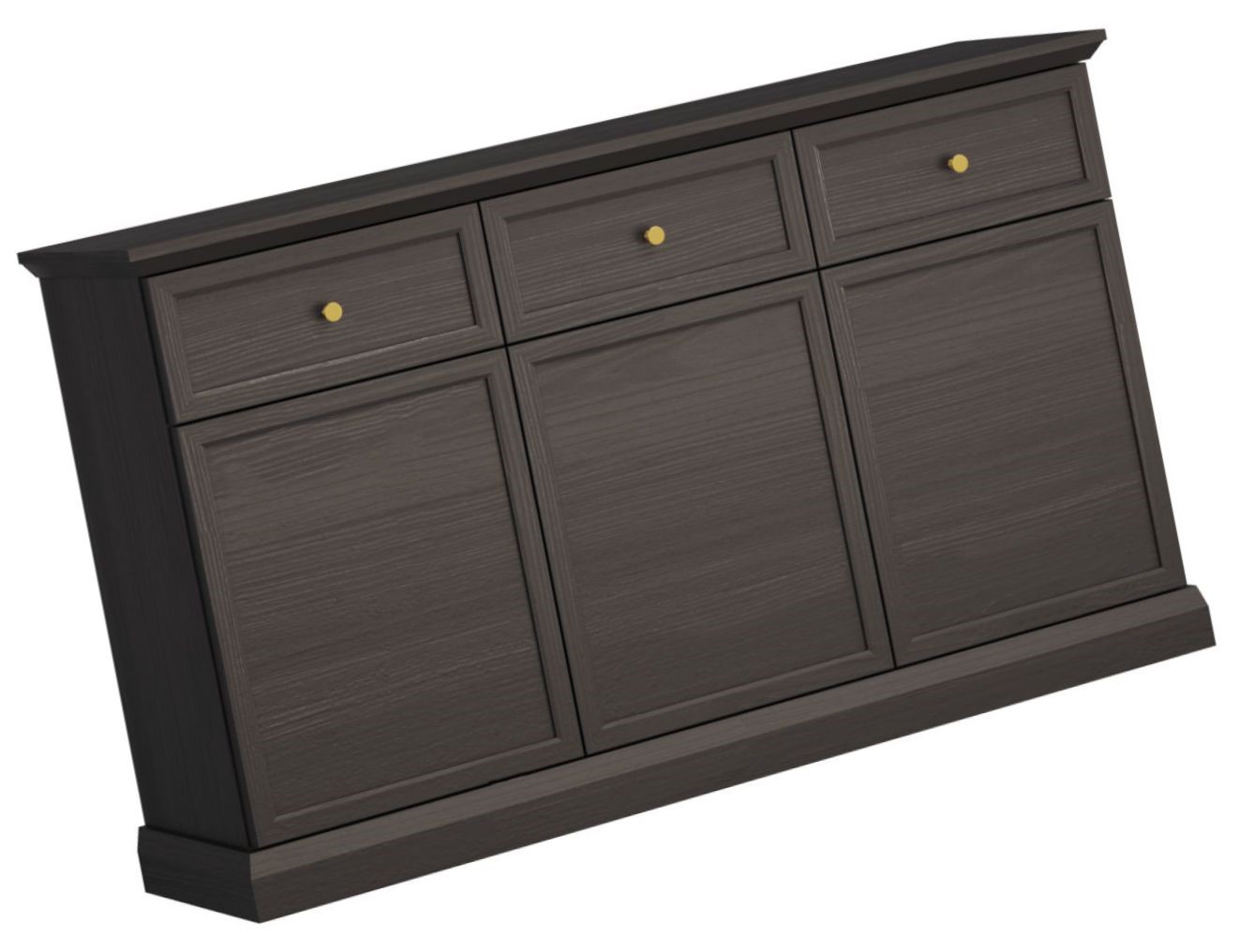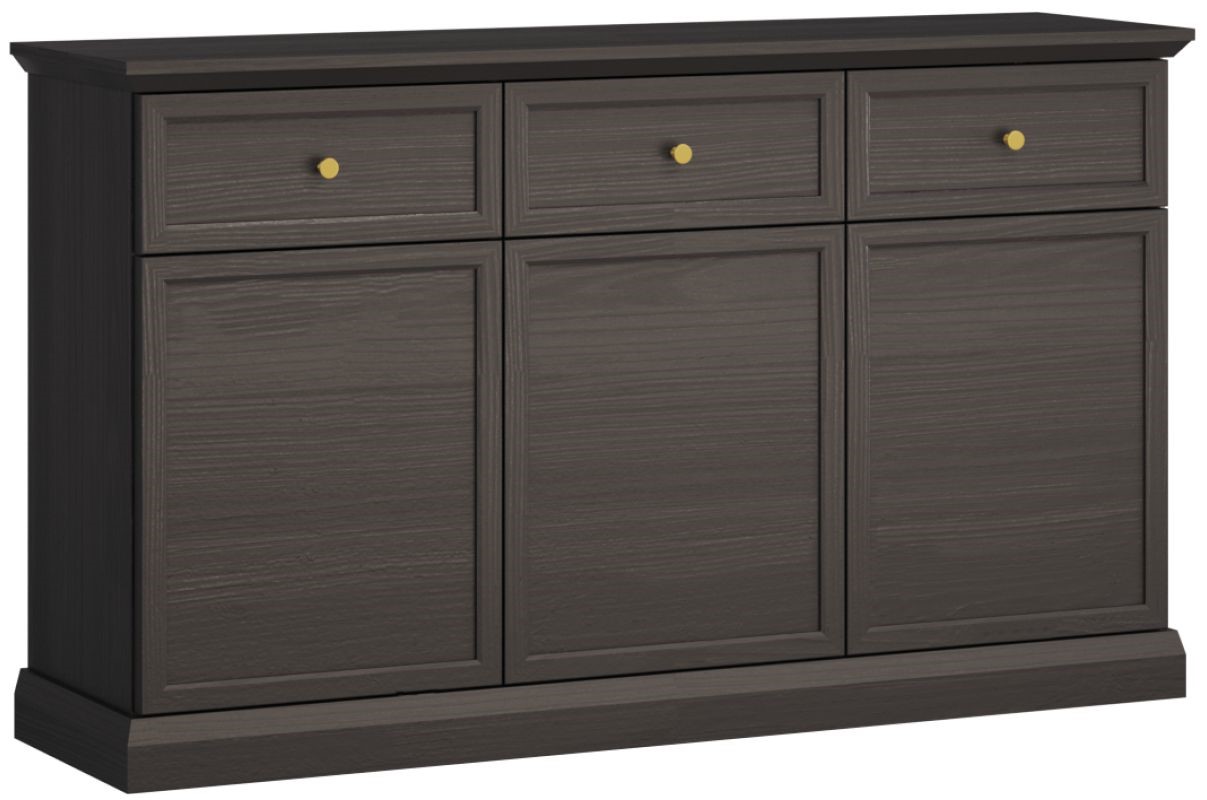 Praktyczna komoda z trzema pojemnymi szufladami oraz 3 pakownymi szafkami, bogato zdobione korony i cokoły, metalowe uchwyty w kolorze szlachetnego złota, duża powierzchnia blatu. Dekor w kolorze czerni z głębokimi naturalnymi porami drewna o różnym stopniu połysku wygląda niezwykle dynamicznie i bardzo zróżnicowanie, doskonale łącząc w sobie naturalne piękno. Estetyka kolekcji Lucca pozwala na swobodne mieszanie stylu klasycznego z nowoczesnym.