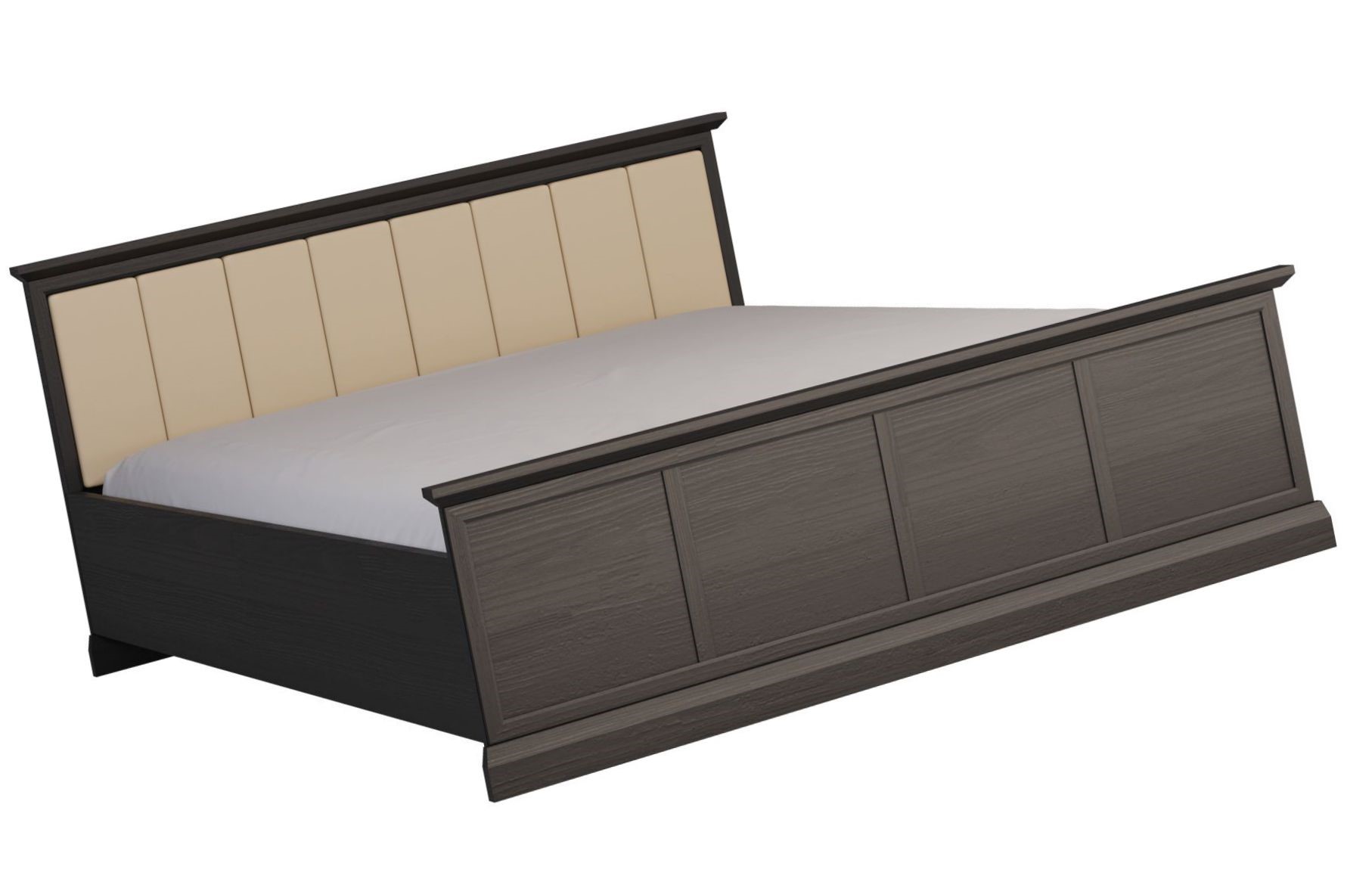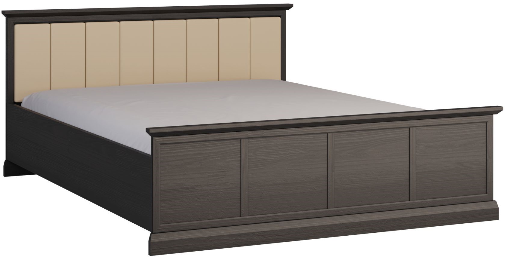 Masywne łóżko z miękkim tapicerowanym zagłówkiem. bogato zdobione korony i cokoły, Dekor w kolorze czerni z głębokimi naturalnymi porami drewna o różnym stopniu połysku wygląda niezwykle dynamicznie i bardzo zróżnicowanie, doskonale łącząc w sobie naturalne piękno.Estetyka kolekcji Lucca pozwala na swobodne mieszanie stylu klasycznego z nowoczesnym.