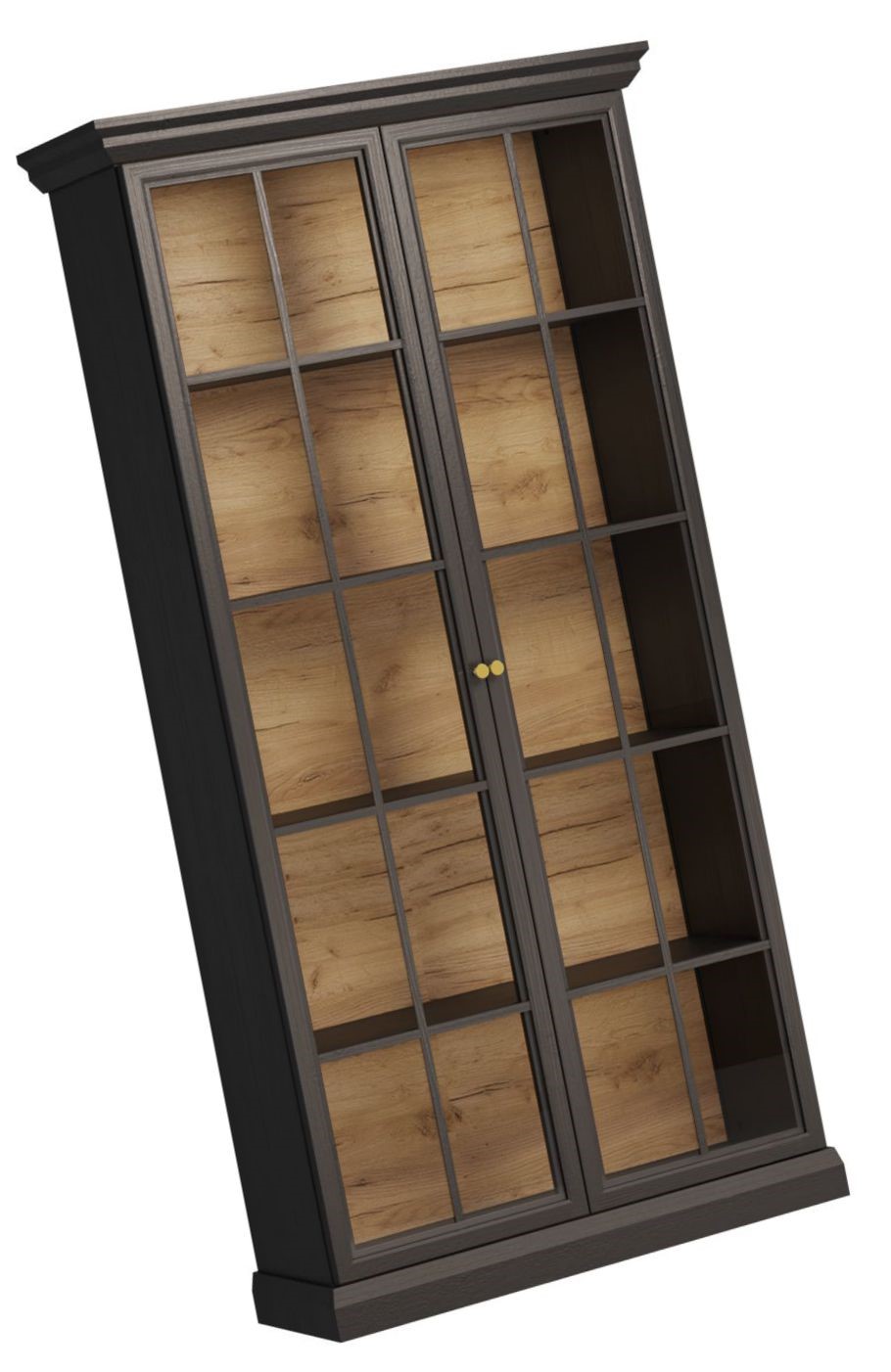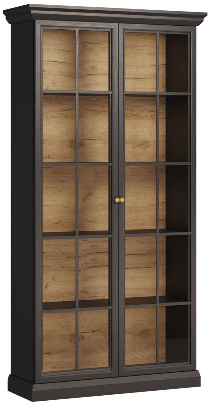 Praktyczna witryna z przeszklonymi frontami i oświetleniem LED- owym w opcji do zakupienia. W środku pięć półek na książki lub pamiątki z podróży, które dzięki oświetleniu LED będą doskonale wyeksponowane. Bogato zdobione korony i cokoły, metalowe uchwyty w kolorze szlachetnego złota. Dekor w kolorze czerni z głębokimi naturalnymi porami drewna o różnym stopniu połysku wygląda niezwykle dynamicznie i bardzo zróżnicowanie, doskonale łącząc w sobie naturalne piękno. Hdf w ciepłym wybarwieniu Dąb Craft. Estetyka kolekcji Lucca pozwala na swobodne mieszanie stylu klasycznego z nowoczesnym.