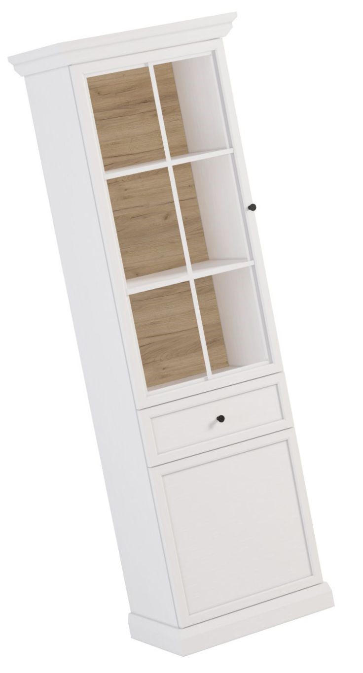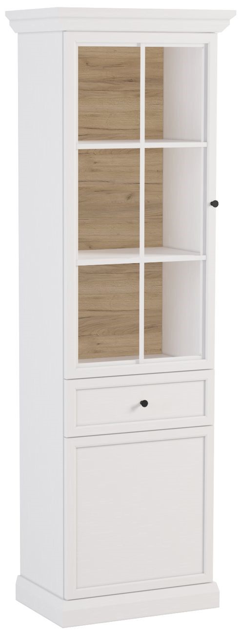 Praktyczna witryna z przeszklonymi frontami i oświetleniem LED w opcji do zakupu. W środku trzy półki na książki lub pamiątki z podróży, które dzięki oświetleniu LED będą doskonale wyeksponowane, szuflada na drobiazgi i pojemna szafka. Bogato zdobione korony i cokoły, metalowe uchwyty w kolorze szlachetnego złota. Dekor w kolorze czystej bieli z głębokimi naturalnymi porami drewna o różnym stopniu połysku wygląda niezwykle dynamicznie i bardzo zróżnicowanie, doskonale łącząc w sobie naturalne piękno. Hdf w ciepłym wybarwieniu Dąb Craft. Estetyka kolekcji Lucca pozwala na swobodne mieszanie stylu klasycznego z nowoczesnym.