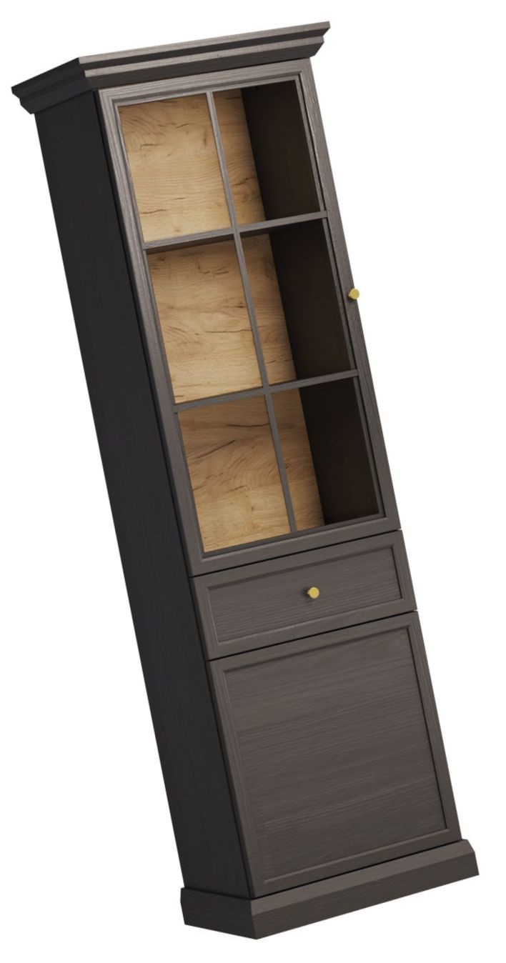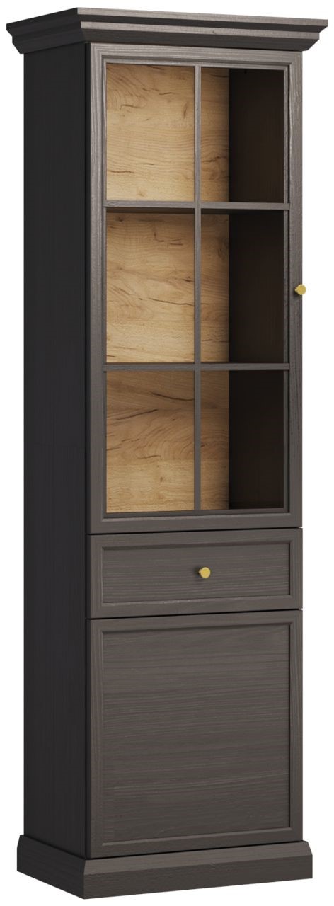Praktyczna witryna z przeszklonymi frontami i oświetleniem LED w opcji do zakupu. W środku trzy półki na książki lub pamiątki z podróży, które dzięki oświetleniu LED będą doskonale wyeksponowane, szuflada na drobiazgi i pojemna szafka. Bogato zdobione korony i cokoły, metalowe uchwyty w kolorze szlachetnego złota. Dekor w kolorze czerni z głębokimi naturalnymi porami drewna o różnym stopniu połysku wygląda niezwykle dynamicznie i bardzo zróżnicowanie, doskonale łącząc w sobie naturalne piękno. Hdf w ciepłym wybarwieniu Dąb Craft. Estetyka kolekcji Lucca pozwala na swobodne mieszanie stylu klasycznego z nowoczesnym.