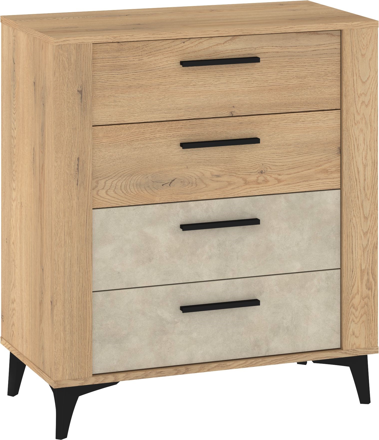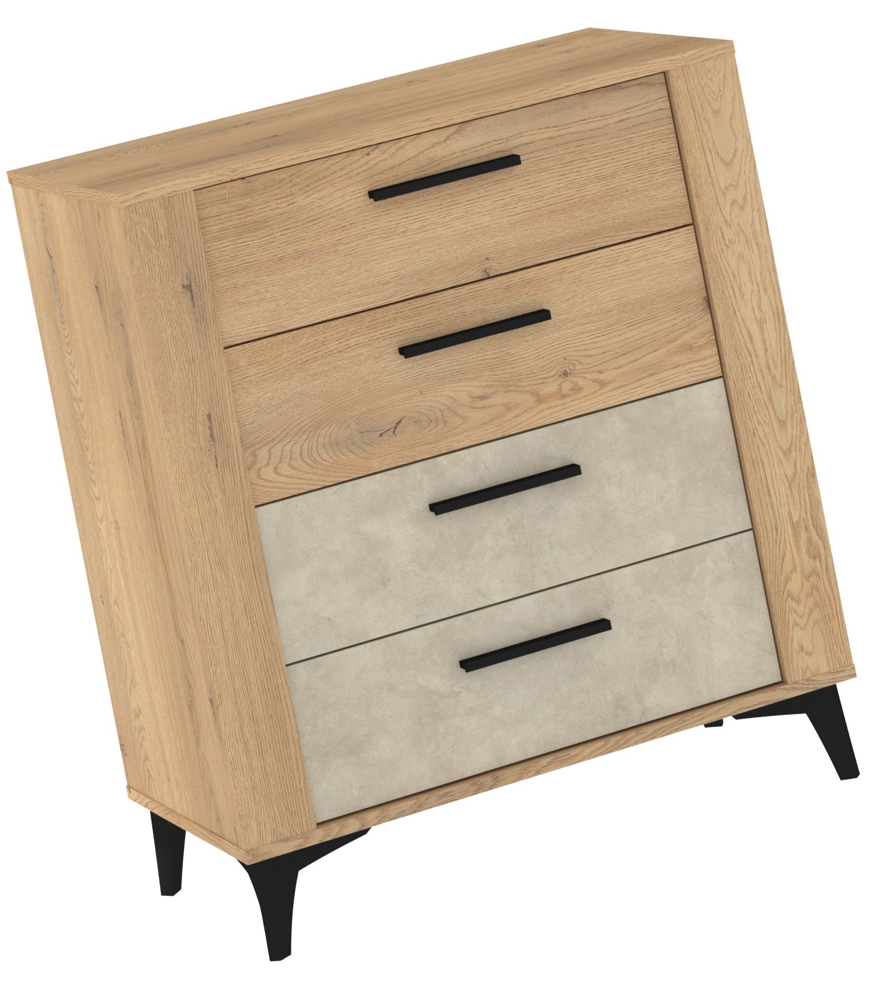 Mebel wyróżnia się efektownym połączeniem jasnych, drewnianych frontów w górnej części z dolnymi szufladami w jasnoszarym, kamiennym wykończeniu, co tworzy modny, dwukolorowy kontrast. Każda szuflada wyposażona jest w smukły, czarny uchwyt, który podkreśla minimalistyczny design i zapewnia wygodne użytkowanie.