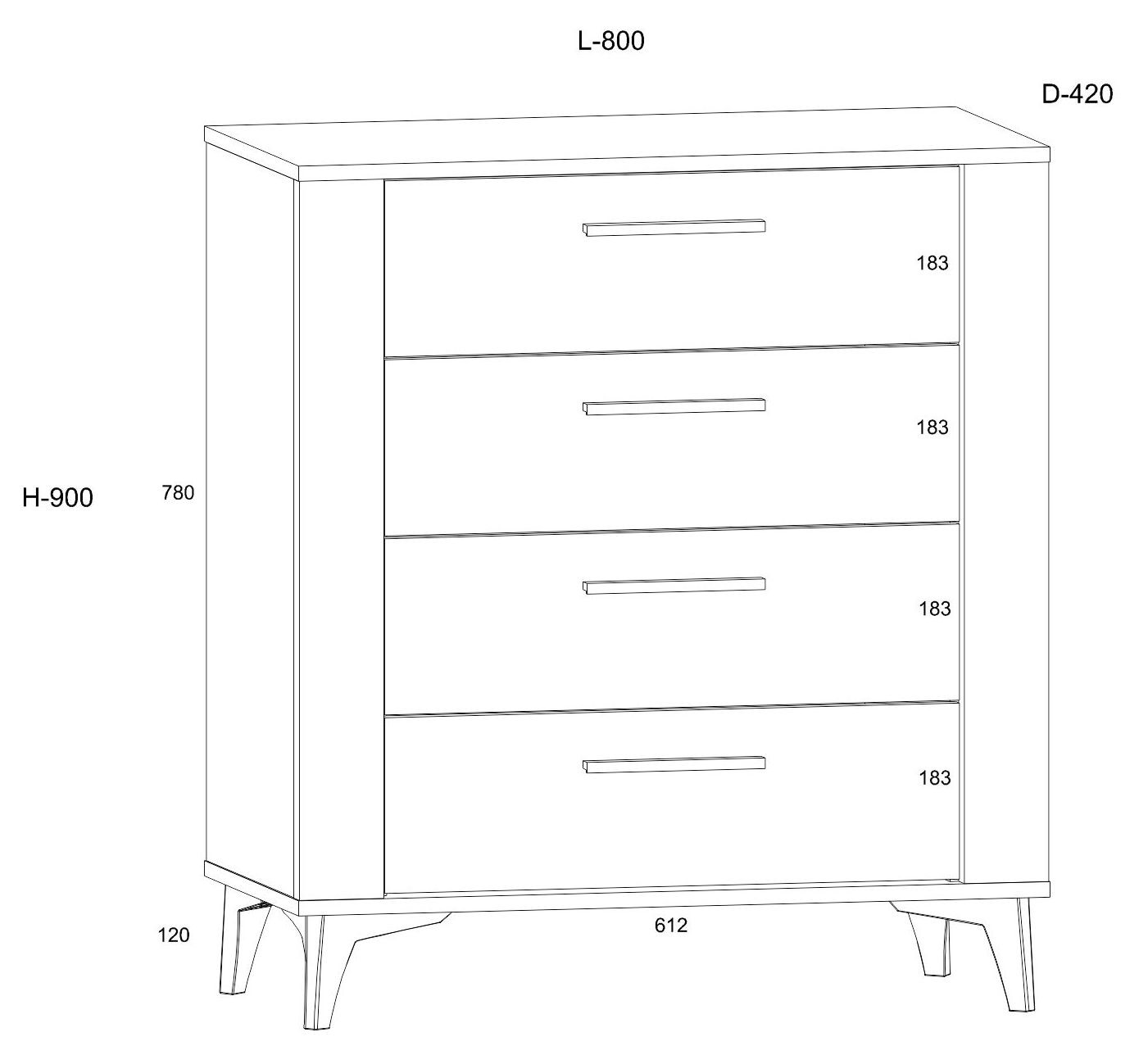 Komoda stoi na stabilnych nogach w czarnym kolorze, dzięki czemu prezentuje się lekko i nowocześnie, a jednocześnie oferuje dużą pojemność. Cztery przestronne szuflady świetnie sprawdzą się do przechowywania ubrań, dokumentów, tekstyliów oraz akcesoriów domowych.