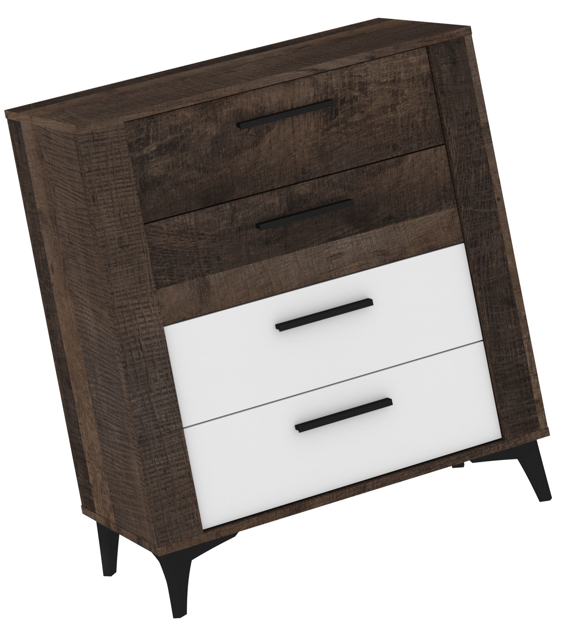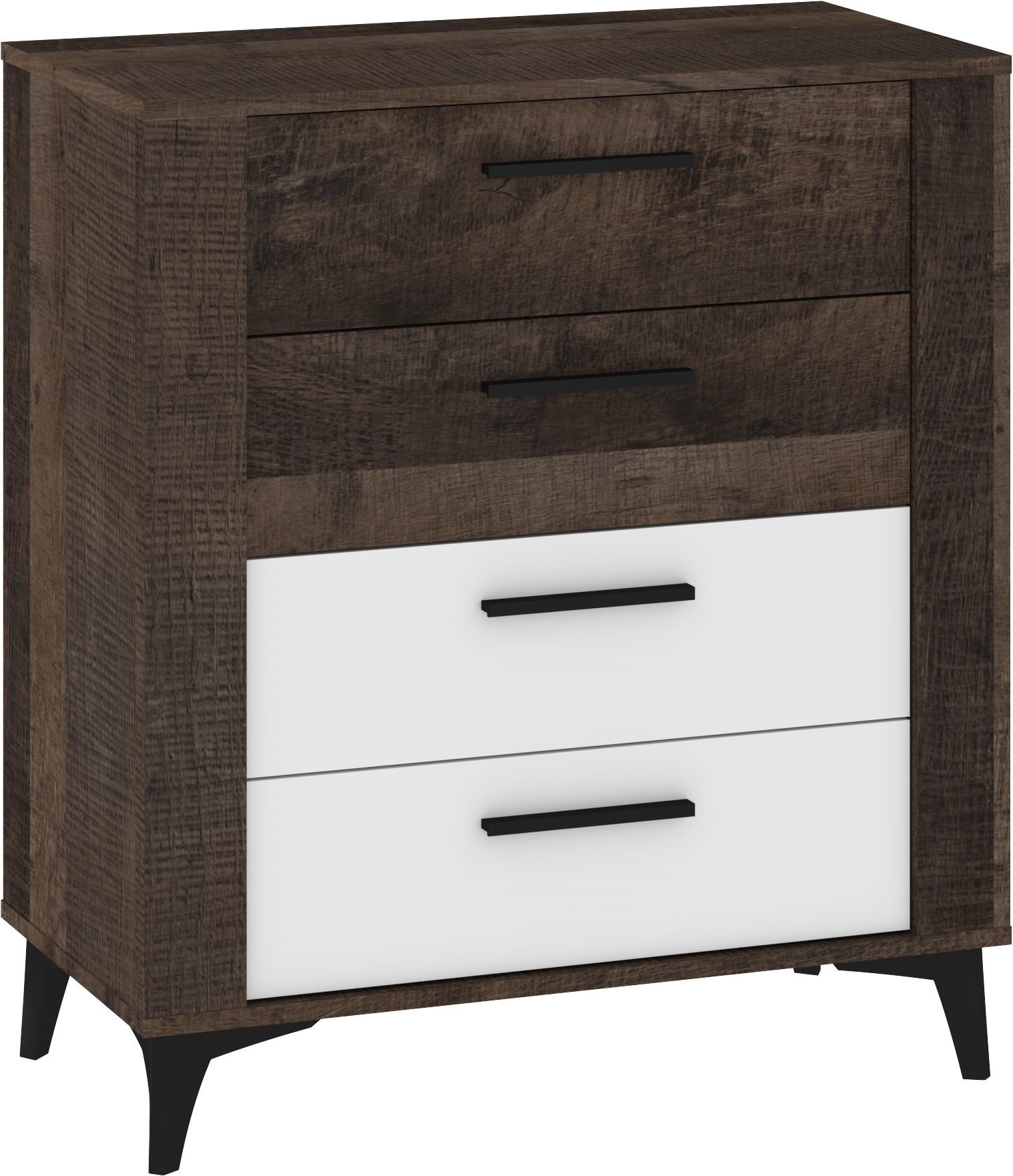 Nowoczesna komoda z czterema szufladami to praktyczny i stylowy mebel, który doskonale sprawdzi się w salonie, sypialni, przedpokoju lub domowym biurze. Jej design opiera się na połączeniu frontów w kolorze ciemnego drewna o wyrazistym usłojeniu z dolnymi szufladami w białym, gładkim wykończeniu, co tworzy elegancki, dwukolorowy kontrast idealny do wnętrz w stylu modern, skandynawskim i loftowym.