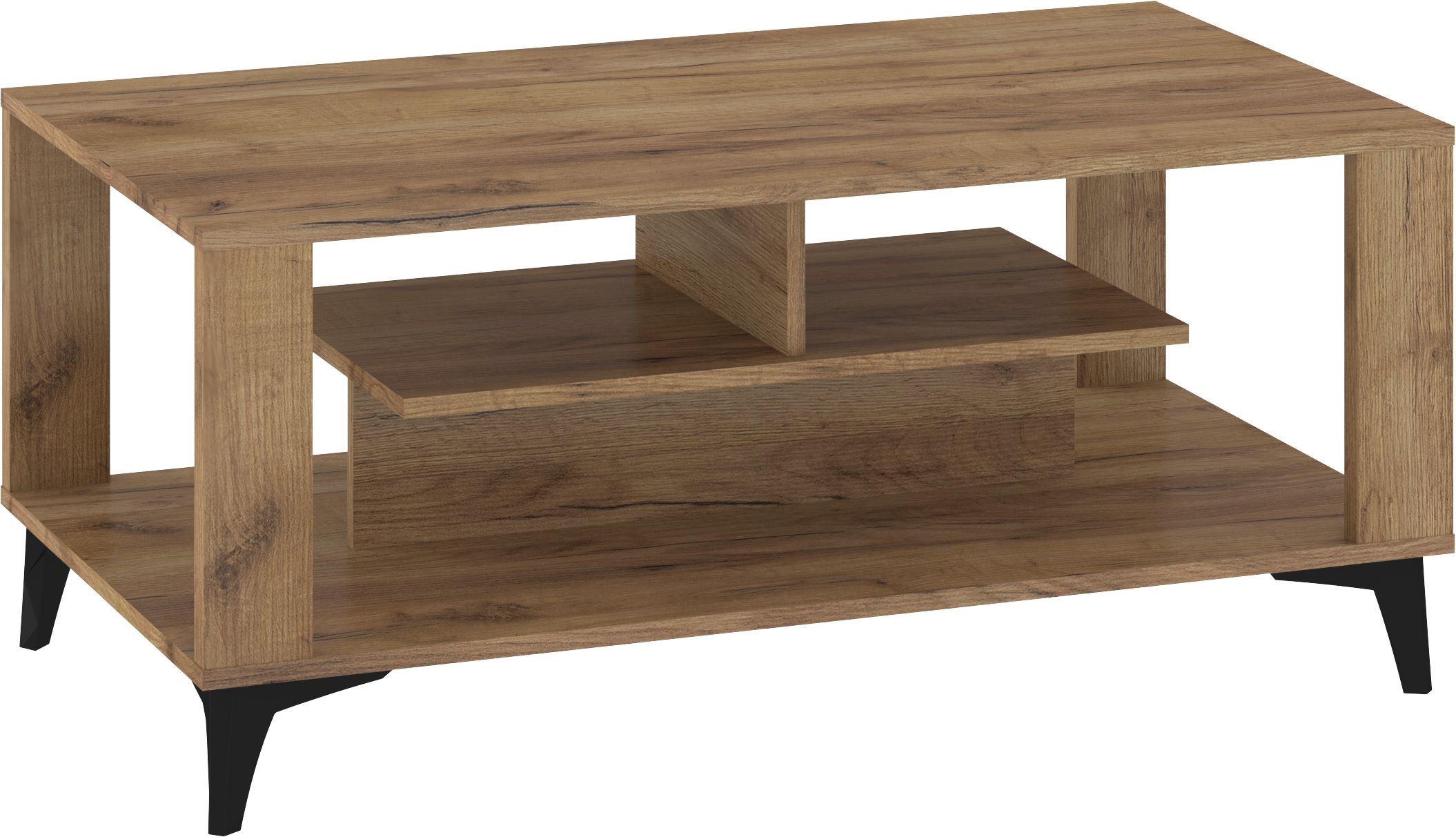 Nowoczesny stolik kawowy o prostokątnym blacie to funkcjonalny i stylowy element wyposażenia, który świetnie sprawdzi się w każdym współczesnym salonie. Wykonany w kolorze naturalnego drewna o wyrazistym usłojeniu, wprowadza do wnętrza ciepło i subtelną elegancję, jednocześnie zachowując minimalistyczny charakter.
