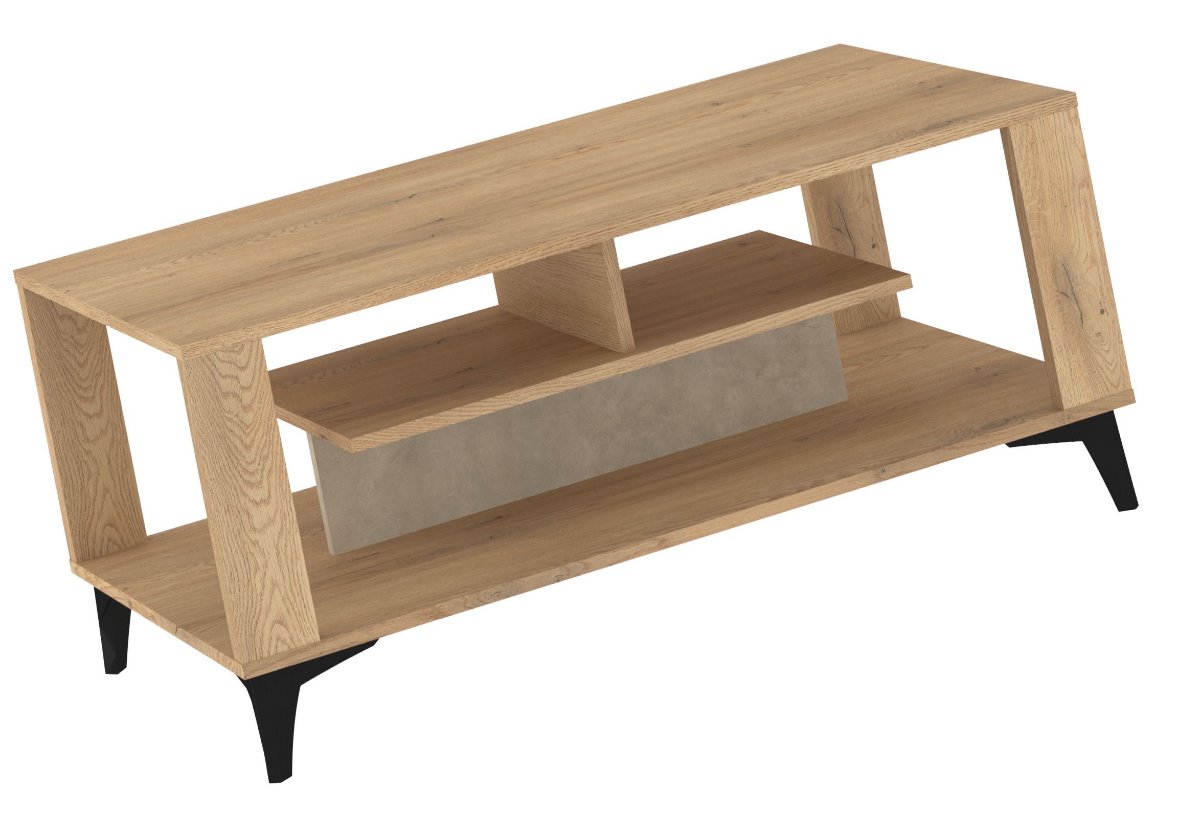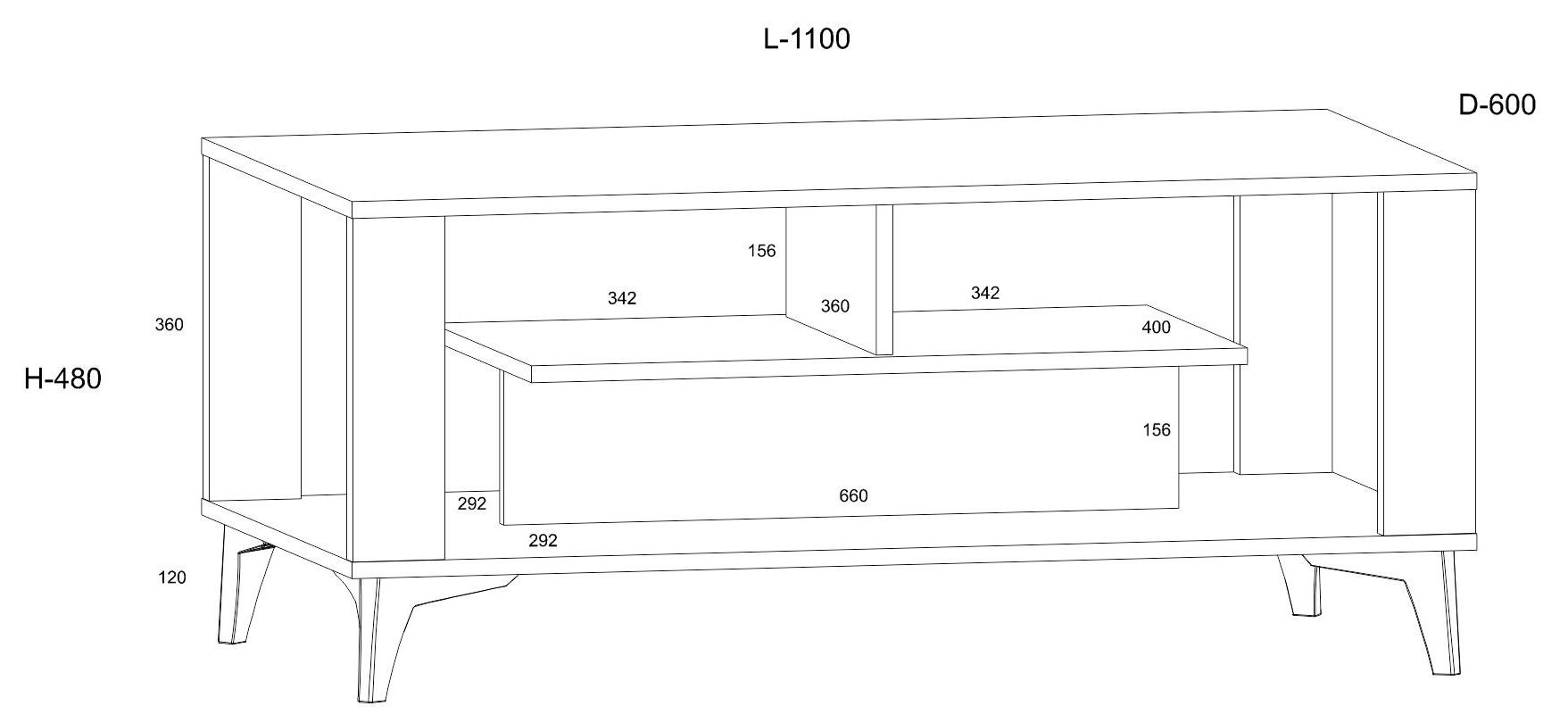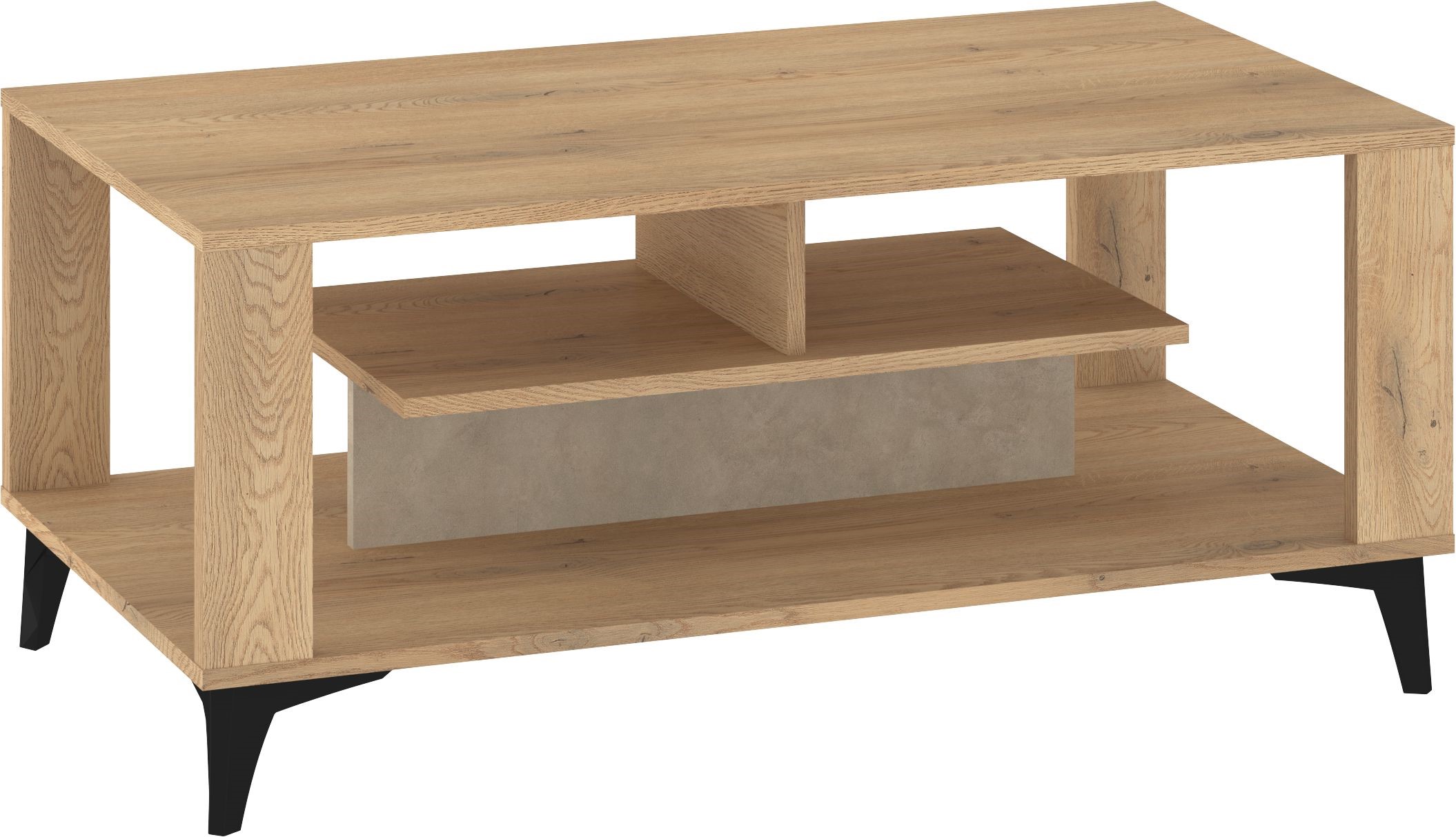Stolik oferuje funkcjonalną, otwartą przestrzeń do przechowywania, podzieloną pionowym i poziomym elementem, co ułatwia organizację książek, dekoracji czy akcesoriów codziennego użytku. Kontrastowy panel w odcieniu granada migdał dodaje całości nowoczesnego, industrialnego charakteru i podkreśla designerski styl mebla.