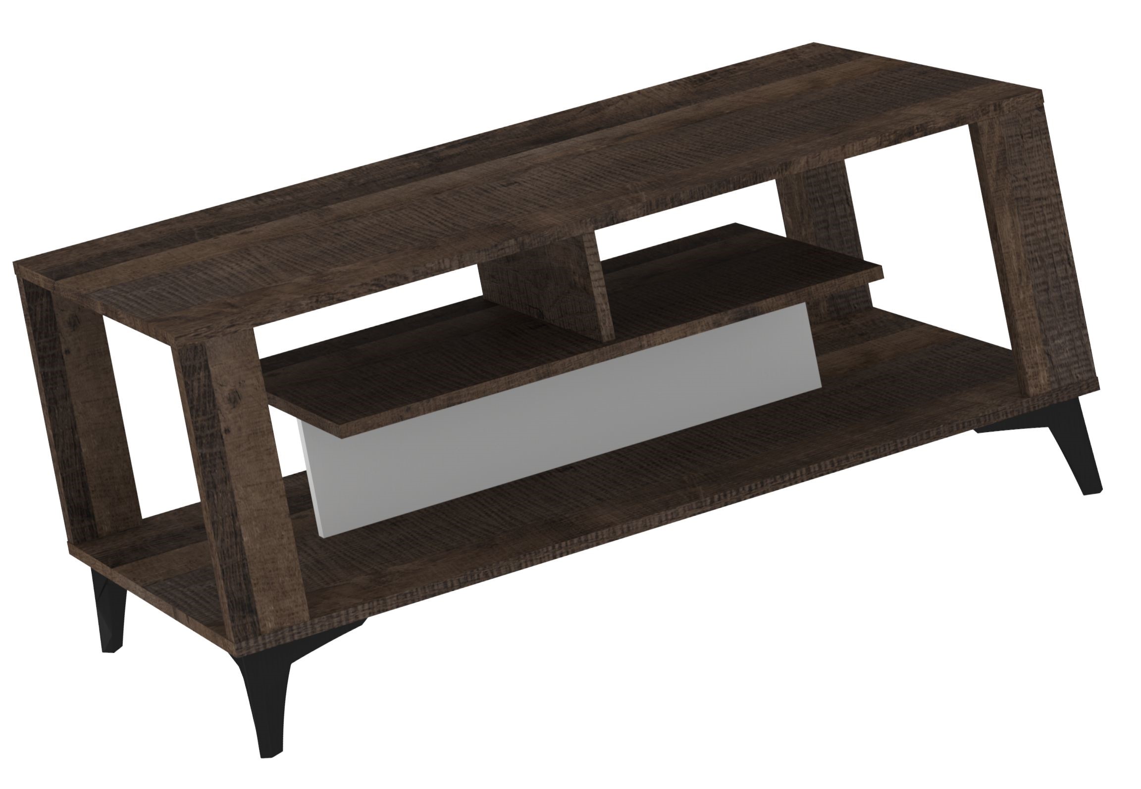 Model wyposażono w otwartą półkę z pionowym podziałem, która zapewnia wygodne miejsce na książki, dekoracje lub akcesoria codziennego użytku. Kontrastowy, biały panel umieszczony pod półką dodaje całości lekkości i nowoczesnego akcentu, przełamując głęboką barwę drewna.