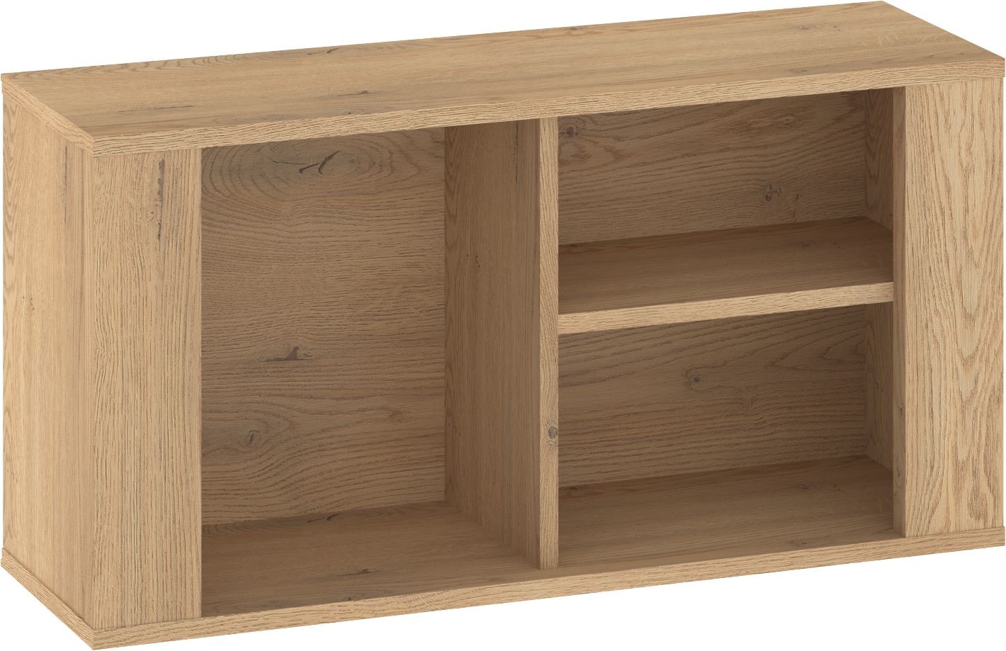 Mebel oferuje trzy funkcjonalne przestrzenie do przechowywania — szeroką, otwartą wnękę po lewej stronie oraz dwie mniejsze półki po prawej. Taka konstrukcja pozwala wygodnie eksponować dekoracje, książki, rośliny lub akcesoria codziennego użytku, jednocześnie zachowując porządek w pomieszczeniu.
