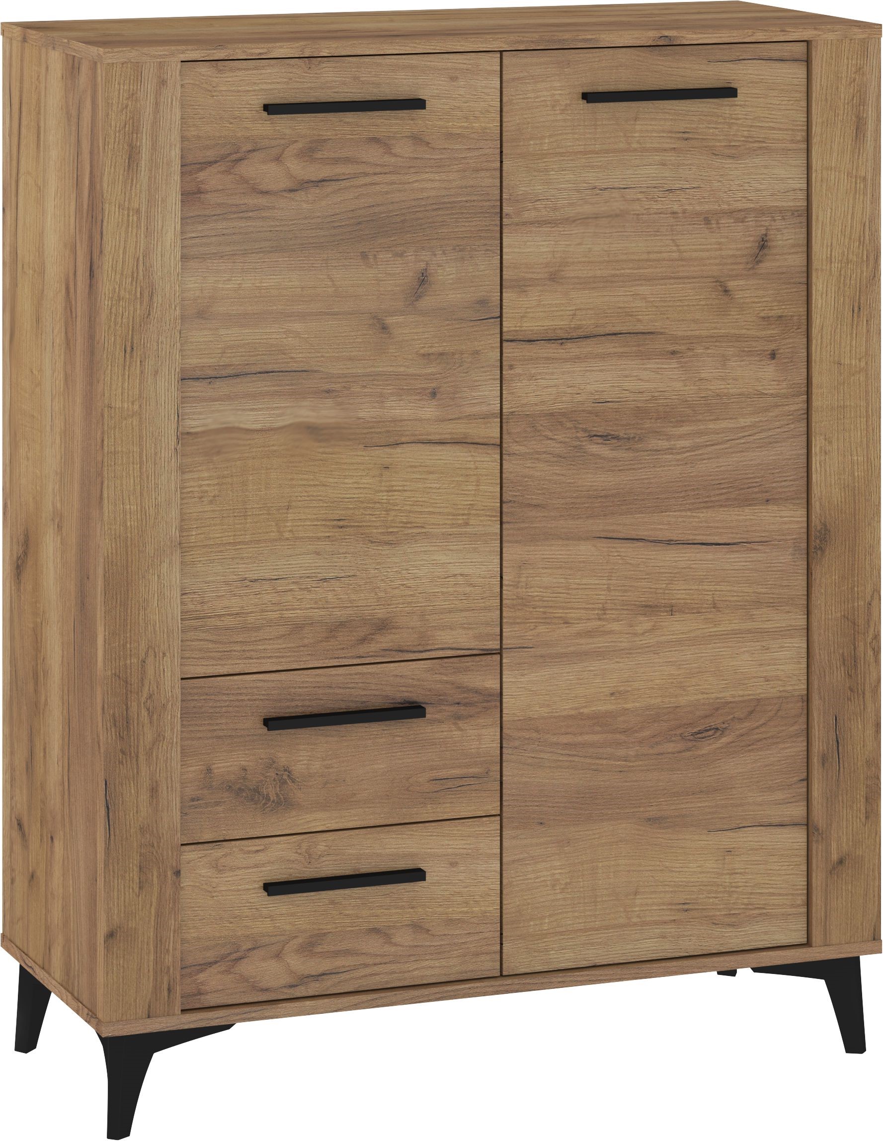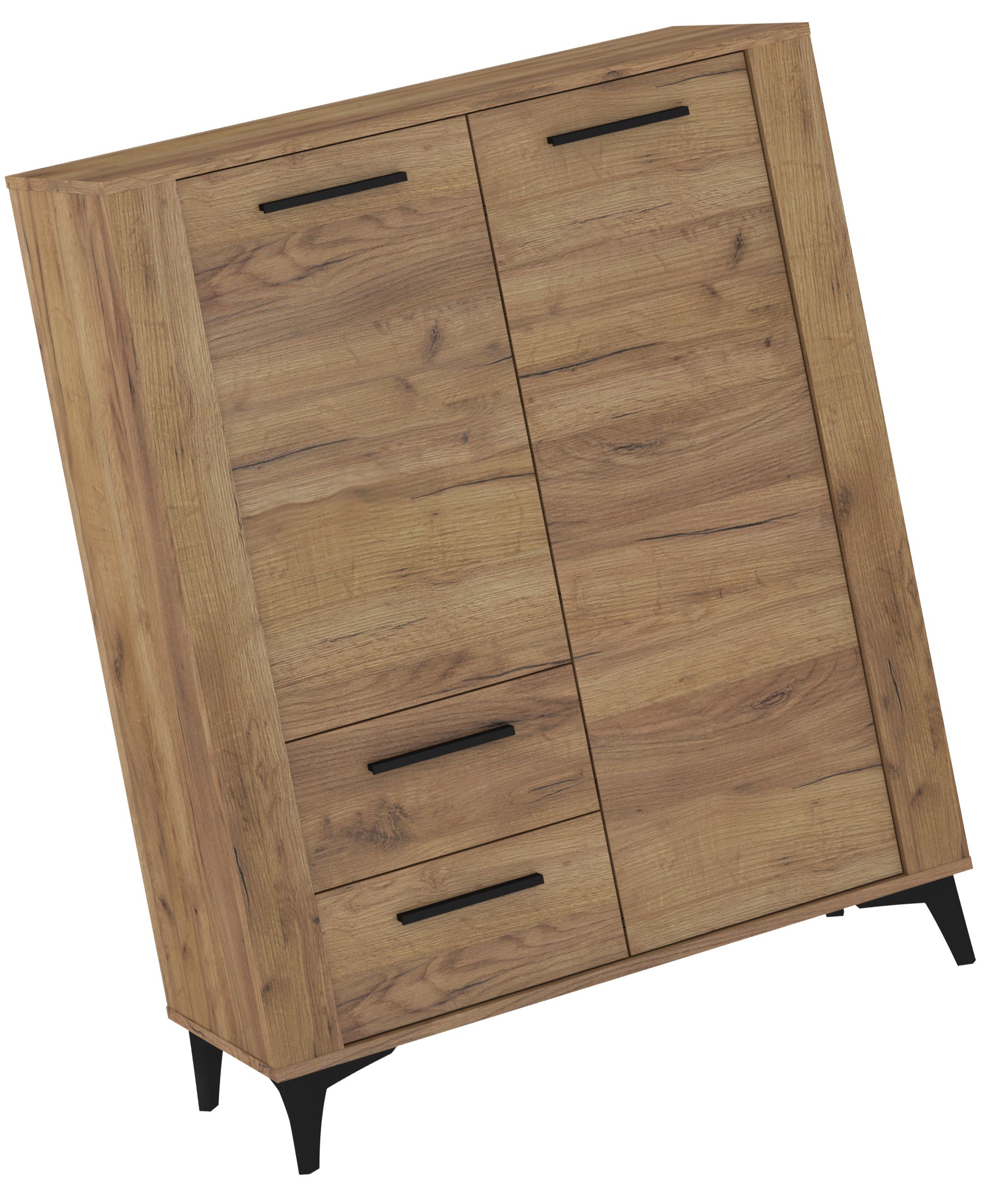 Model wyposażono w dwoje drzwi w górnej części oraz dwie pojemne szuflady po lewej stronie, co zapewnia wygodne przechowywanie dokumentów, tekstyliów, akcesoriów i drobnych przedmiotów. Czarne, poziome uchwyty dodają całości nowoczesnego akcentu i podkreślają elegancką linię mebla.