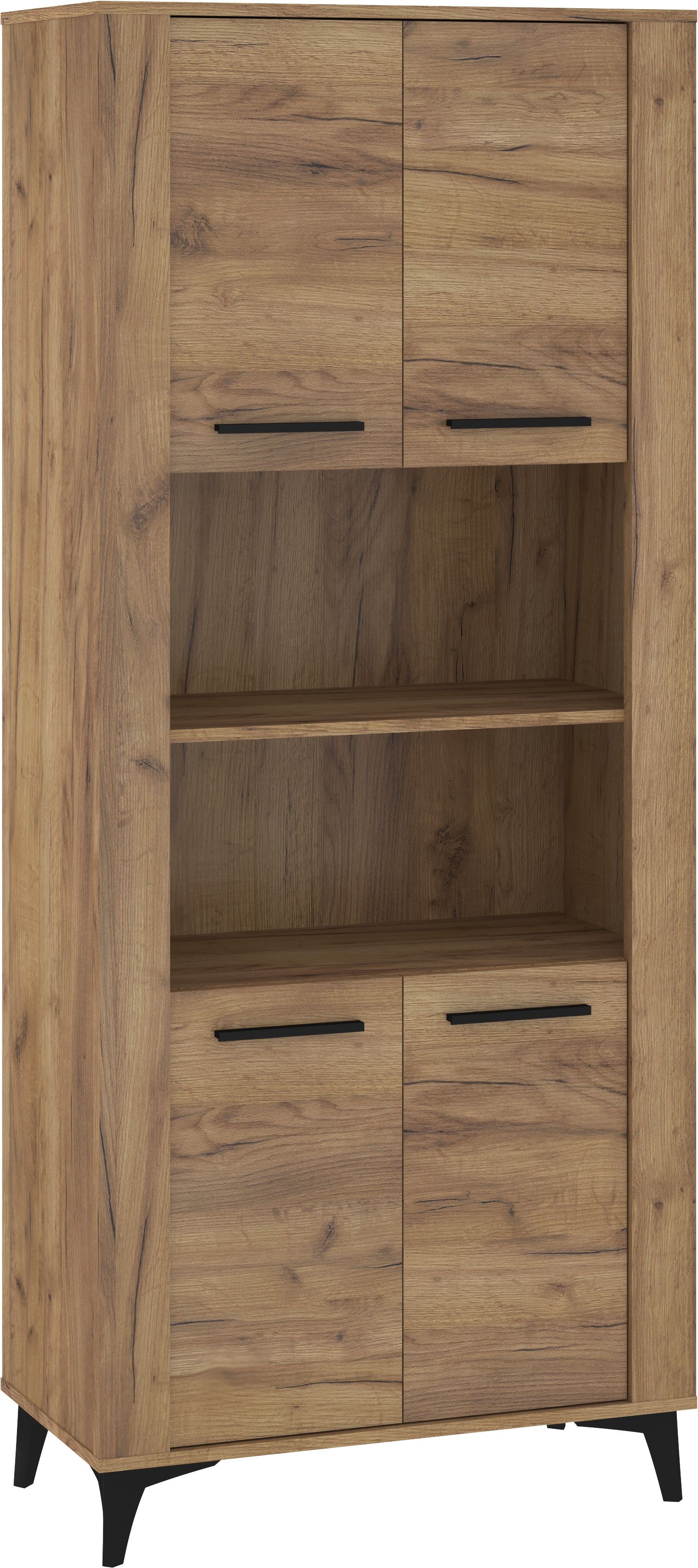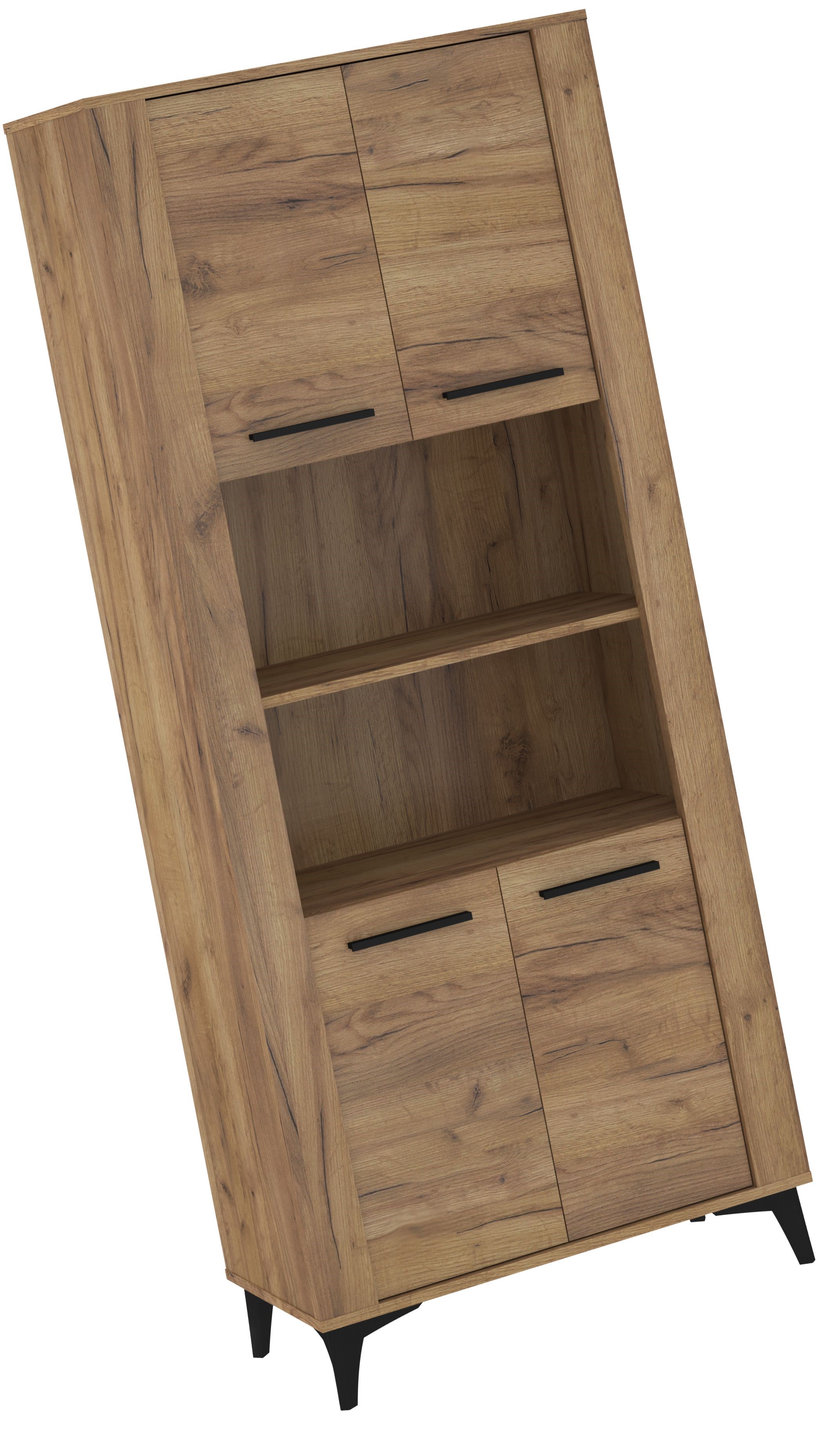 Nowoczesny regał w naturalnym wybarwieniu drewna to funkcjonalny mebel, który idealnie dopełni aranżacje w stylu loft, skandynawskim i minimalistycznym. Wyrazisty rysunek słojów podkreśla jego naturalny charakter, a czarne metalowe uchwyty oraz stabilne, skośne nogi dodają mu nowoczesnej lekkości. Regał wyposażono w cztery pojemne szafki w dekorze dąb craft złoty co zapewnia wygodne i estetyczne przechowywanie. Otwarta część środkowa świetnie sprawdzi się do ekspozycji dekoracji, książek lub sprzętu multimedialnego. To idealny wybór do salonu, jadalni czy domowego biura, łączący praktyczność z ponadczasowym designem.