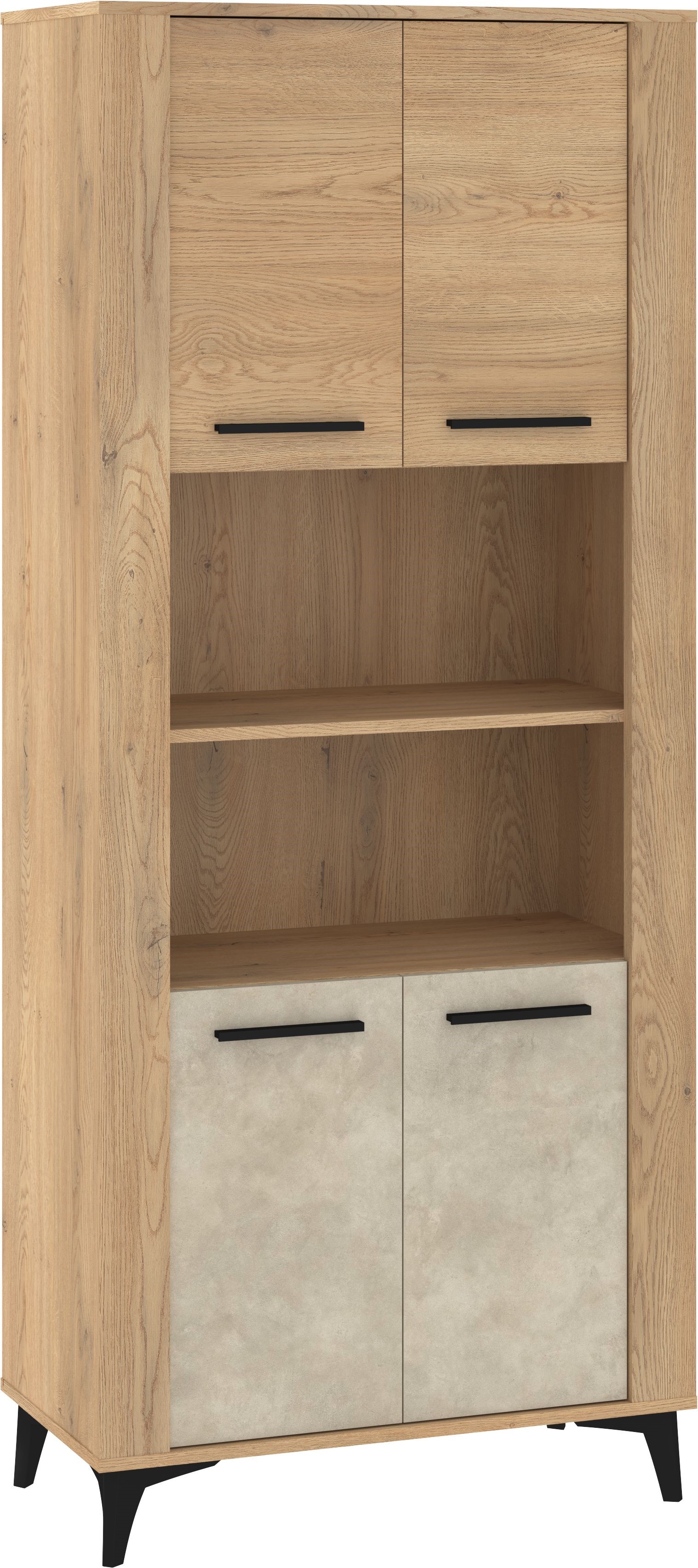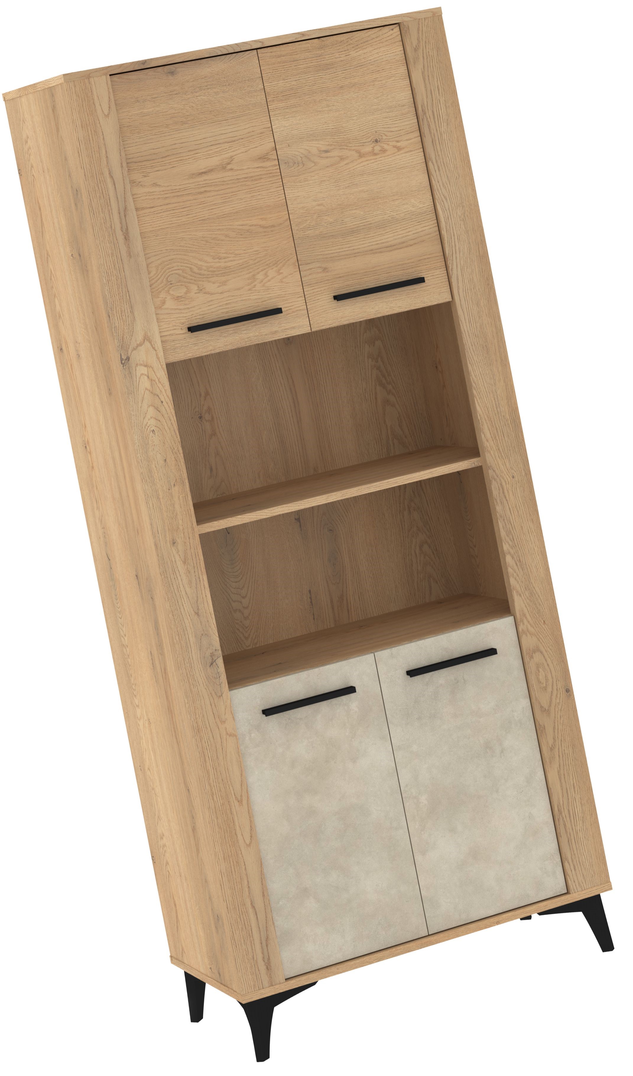 Elegancki regał w naturalnym odcieniu drewna to praktyczny mebel, który świetnie uzupełni nowoczesne i loftowe wnętrza. Jego wyrazista struktura słojów nadaje mu ciepły, przytulny charakter, a czarne uchwyty oraz stabilne, skośne nogi podkreślają współczesny styl. Mebel wyposażono w cztery zamykane szafki — górne w dekorze dąb cremona oraz dolne w jasnym wykończeniu granada migdał — co pozwala wygodnie uporządkować domowe akcesoria. Otwarta część środkowa stanowi idealne miejsce na dekoracje, książki lub sprzęt multimedialny. To funkcjonalny regał, który łączy estetykę z praktycznością, sprawdzając się zarówno w salonie, jadalni, jak i domowym biurze.