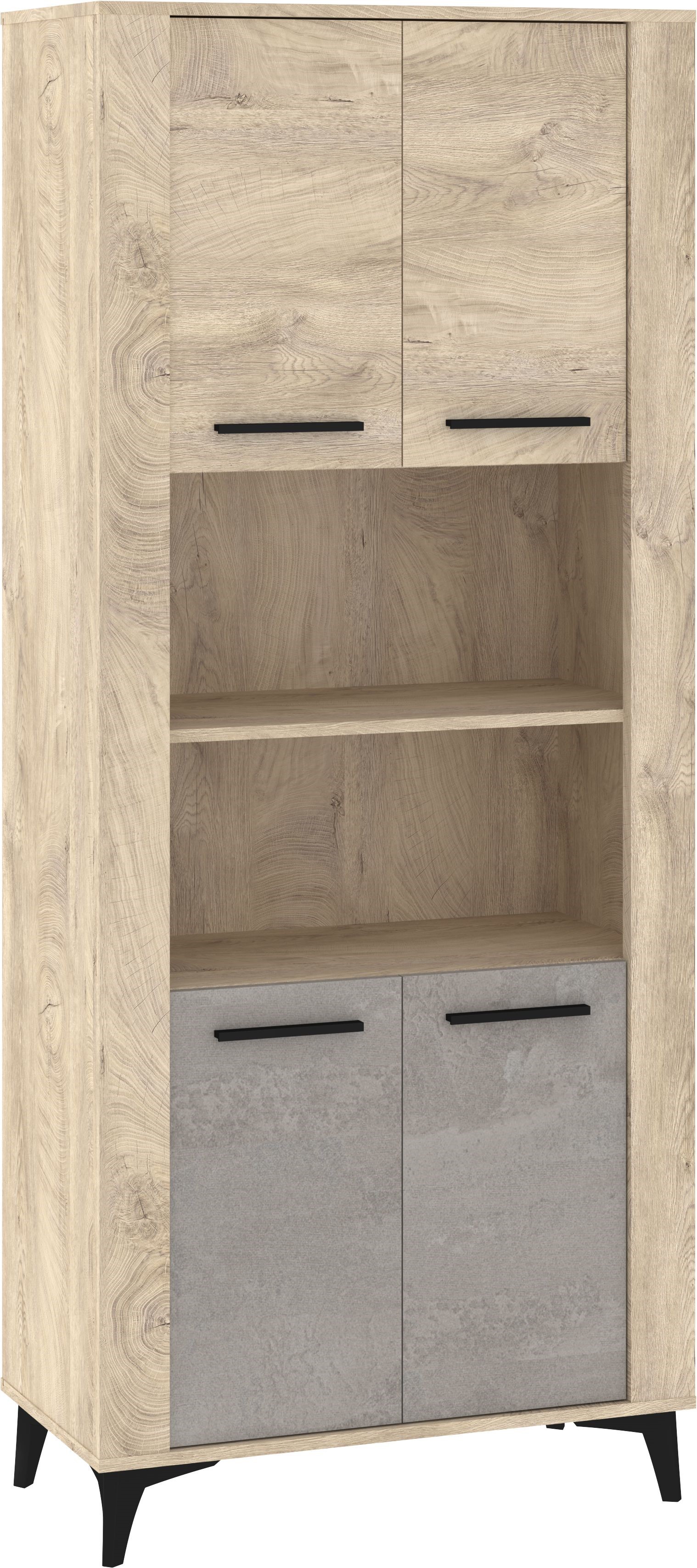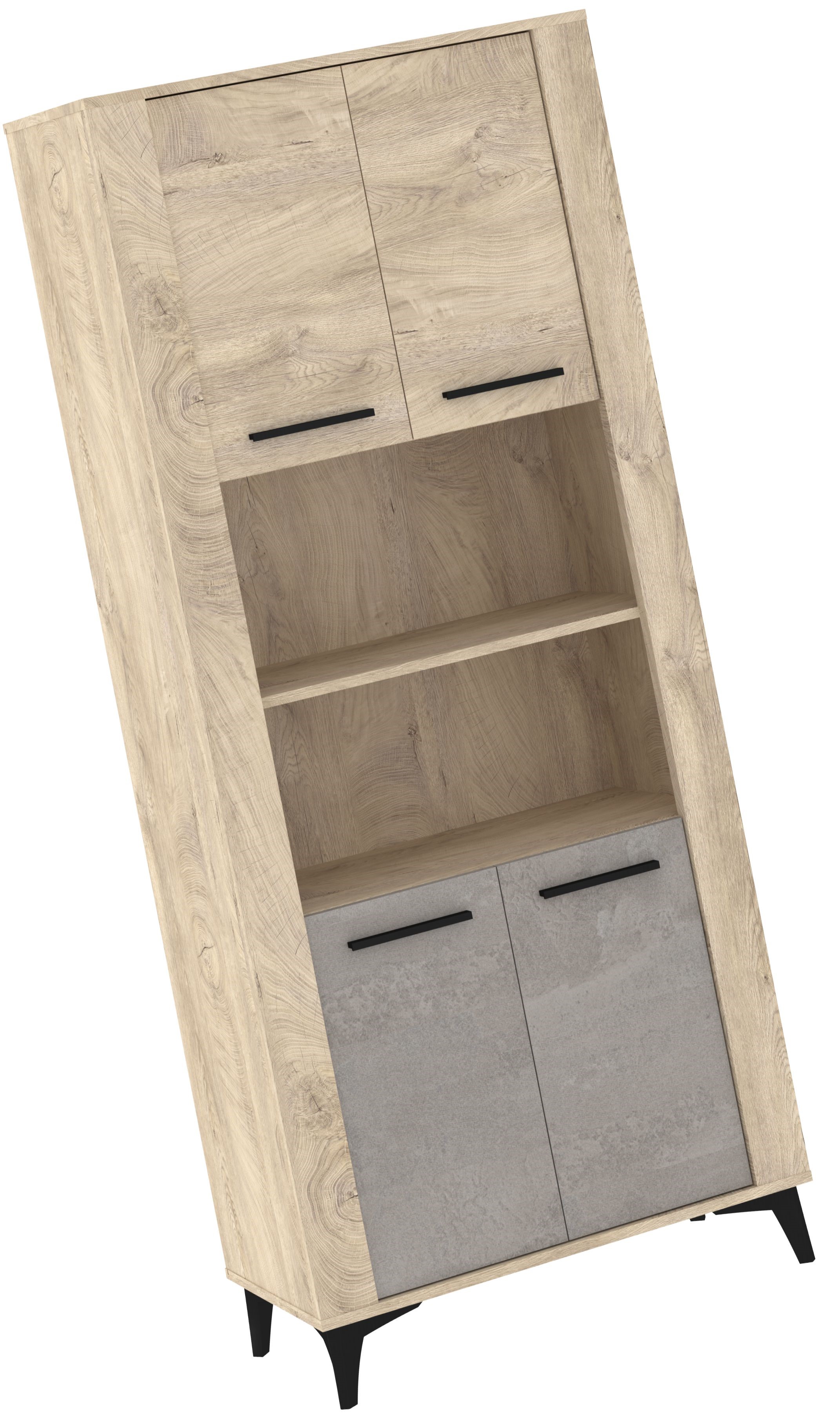 Nowoczesny regał w naturalnym wybarwieniu drewna to funkcjonalny mebel, który doskonale sprawdzi się w salonie, jadalni lub domowym biurze. Jego wyrazista struktura słojów nadaje wnętrzu ciepła, a czarne uchwyty oraz stabilne, skośne nogi podkreślają loftowy charakter. Mebel wyposażono w cztery pojemne szafki — górne w dekorze dąb endgrain oraz dolne w eleganckim, betonowym wykończeniu — co zapewnia wygodne przechowywanie i utrzymanie porządku. Otwarta półka środkowa idealnie nadaje się do ekspozycji dekoracji, książek lub sprzętu multimedialnego. To praktyczny i estetyczny regał, który łączy naturalny wygląd z nowoczesnym designem, świetnie pasując do wnętrz w stylu loft, skandynawskim i minimalistycznym.