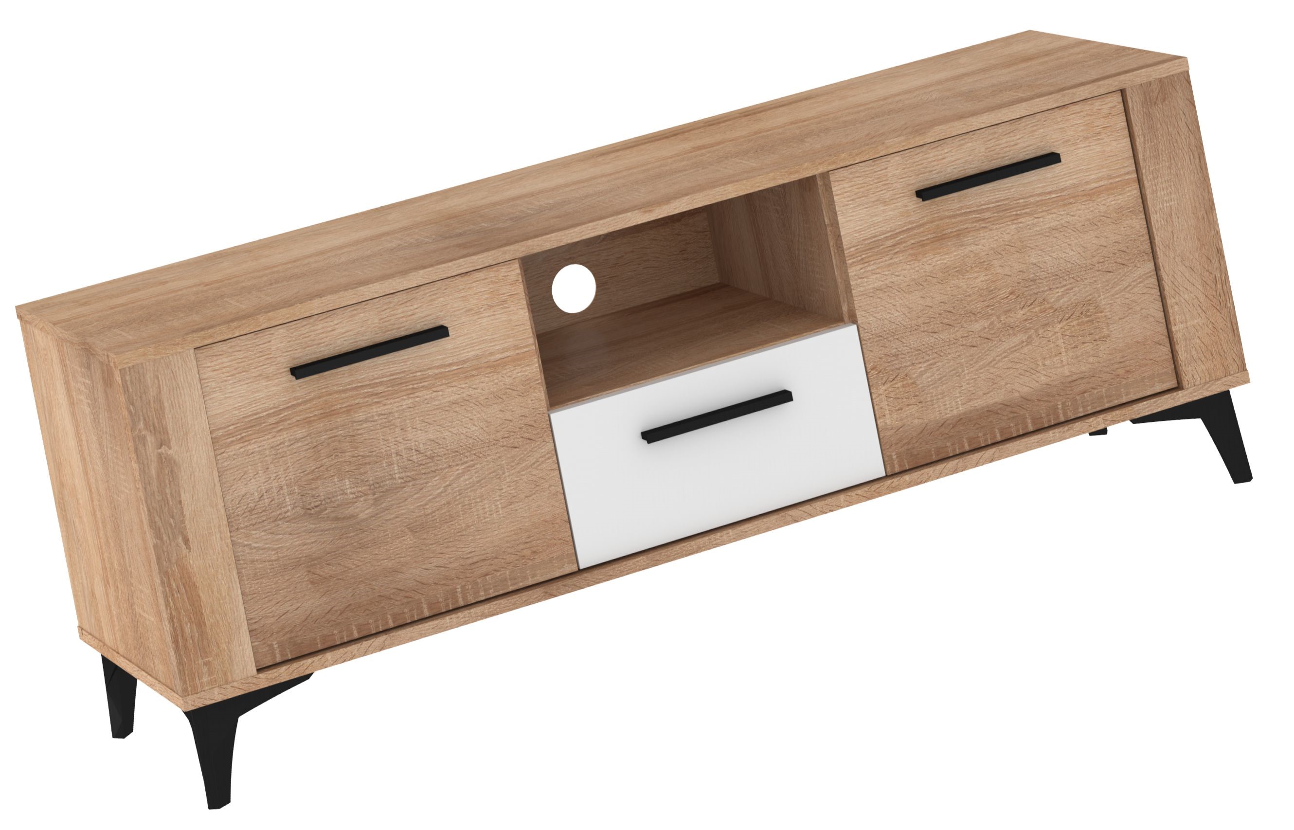 Nowoczesna szafka RTV w naturalnym wybarwieniu drewna to funkcjonalny i stylowy mebel, który świetnie sprawdzi się w każdym salonie. Jej minimalistyczna forma, podkreślona czarnymi uchwytami i skośnymi nogami, nadaje wnętrzu lekkości oraz współczesnego charakteru. Mebel wyposażono w dwie pojemne szuflady boczne, otwartą półkę z praktycznym przepustem kablowym oraz centralną szufladę w kontrastowym, białym wykończeniu. Taka konstrukcja pozwala wygodnie uporządkować sprzęt multimedialny, akcesoria i drobne przedmioty, jednocześnie dbając o estetykę przestrzeni. To idealna szafka RTV dla osób, które cenią połączenie nowoczesnego designu, funkcjonalności i trwałości.