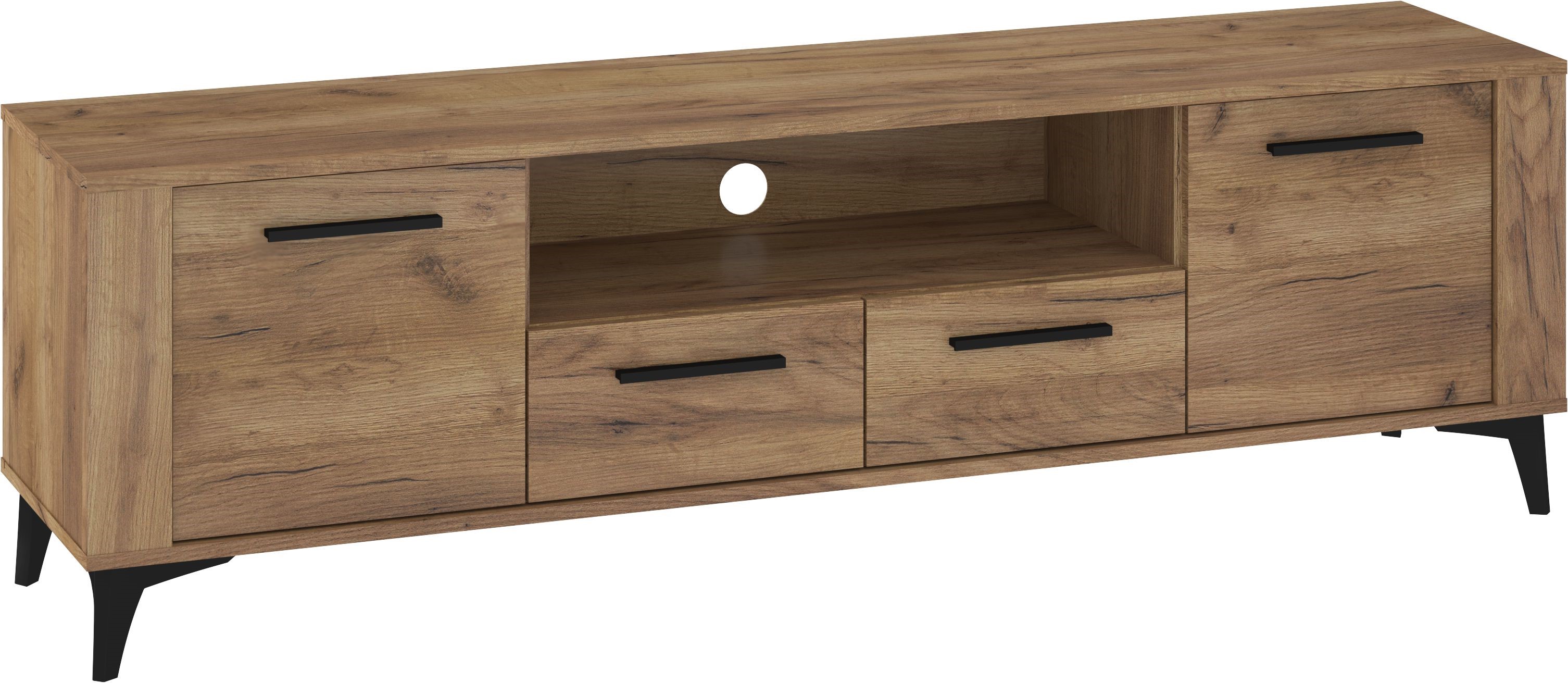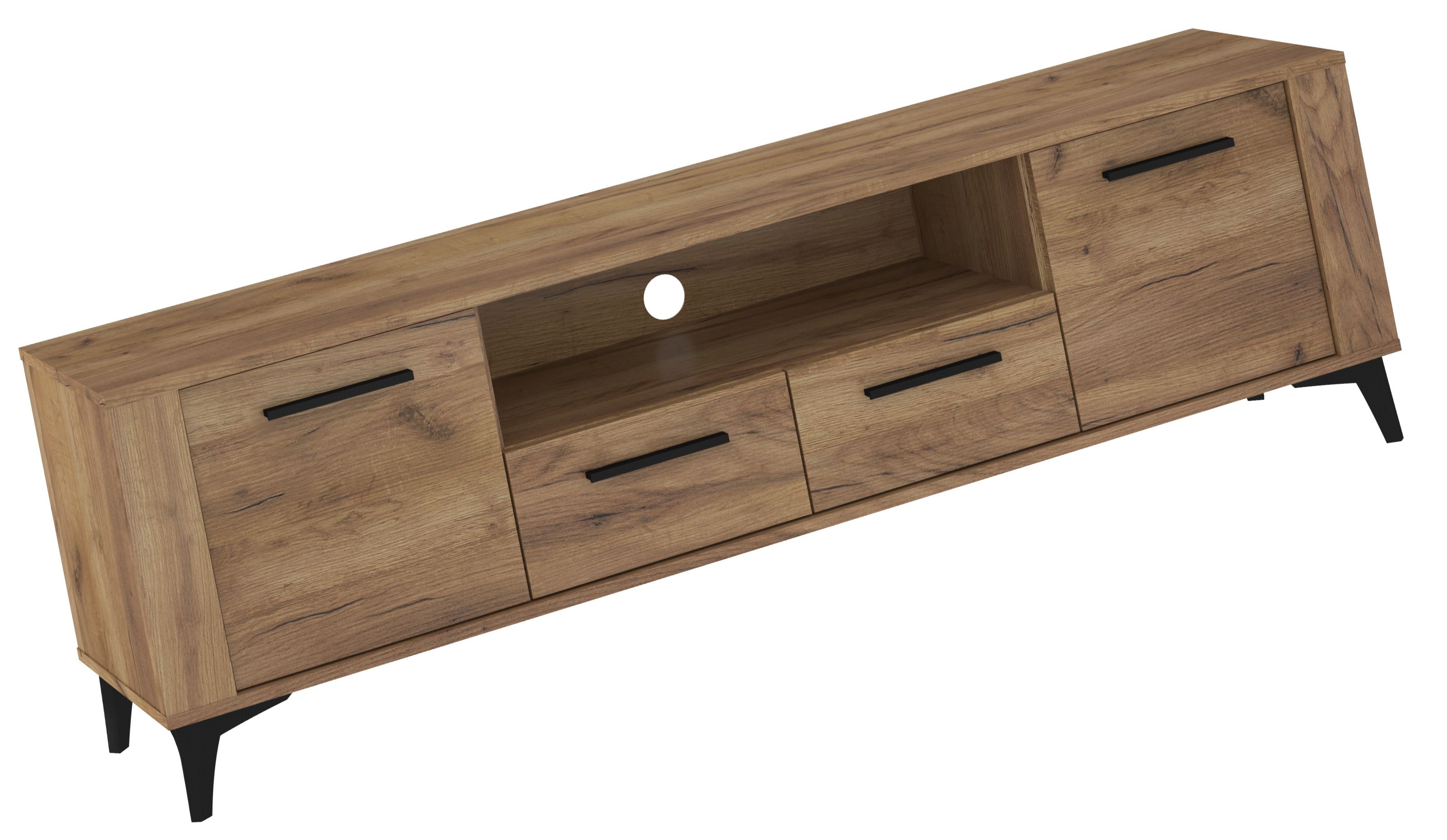 Nowoczesna szafka RTV w naturalnym wybarwieniu drewna to funkcjonalny i stylowy mebel, który świetnie sprawdzi się w każdym salonie. Jej minimalistyczna forma, podkreślona czarnymi uchwytami i stabilnymi, skośnymi nogami, nadaje wnętrzu elegancji oraz współczesnego charakteru. Mebel wyposażono w dwie boczne szafki z zamykanymi frontami, dwie praktyczne szuflady w centralnej części oraz otwartą półkę z przepustem kablowym, co ułatwia organizację sprzętu multimedialnego i akcesoriów. Naturalna struktura drewna w połączeniu z czarnymi akcentami tworzy harmonijną, nowoczesną kompozycję, idealną do wnętrz w stylu loft, skandynawskim i minimalistycznym. To doskonały wybór dla osób, które cenią połączenie estetyki, funkcjonalności i trwałości.