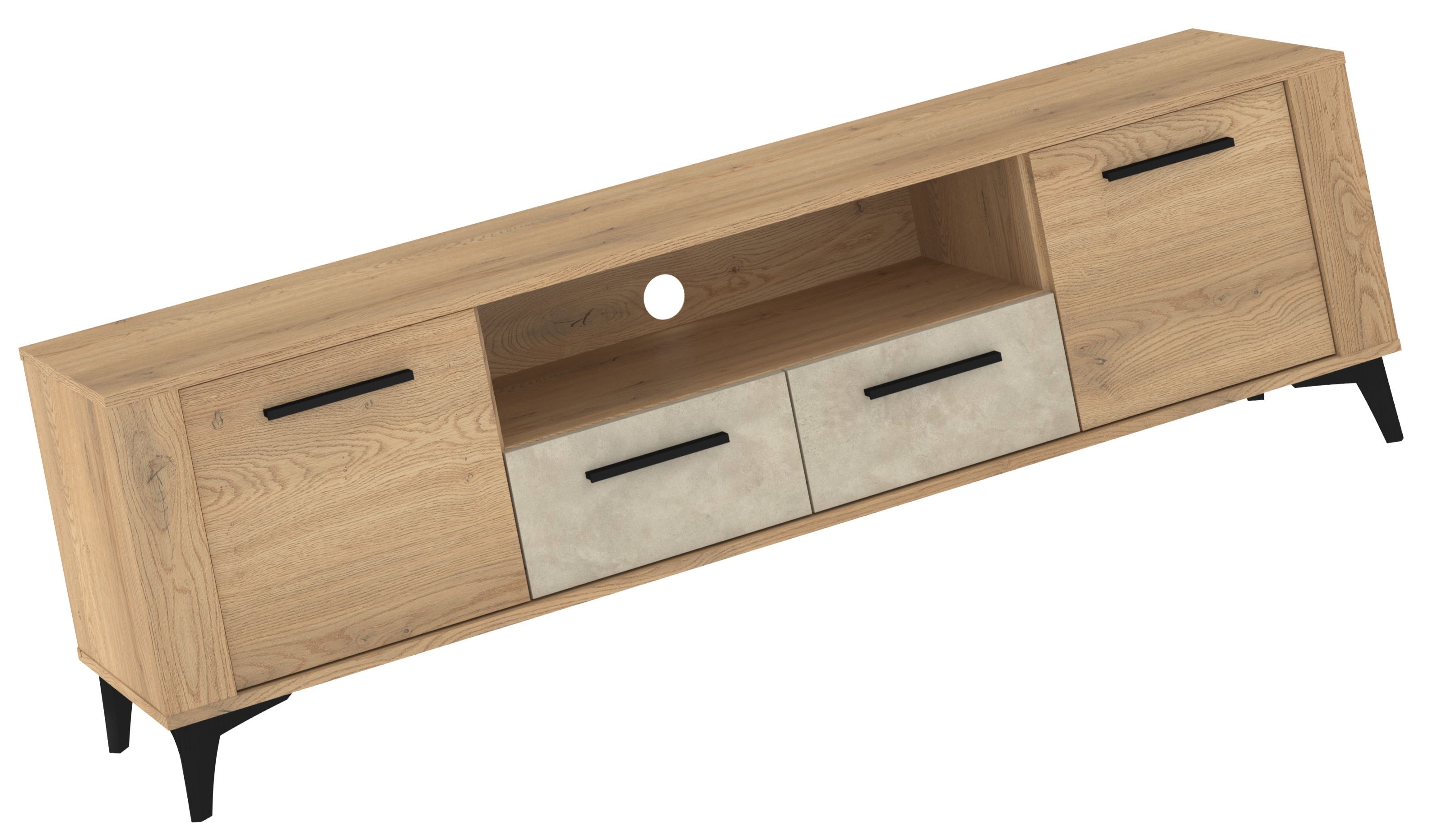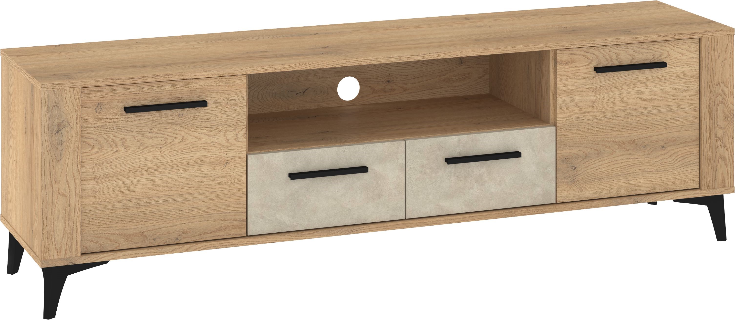 Nowoczesna szafka RTV w naturalnym wybarwieniu drewna to funkcjonalny i stylowy mebel, który doskonale sprawdzi się w każdym salonie. Jej minimalistyczna forma, podkreślona czarnymi uchwytami i stabilnymi, skośnymi nogami, nadaje wnętrzu elegancji oraz współczesnego charakteru. Mebel wyposażono w dwie pojemne szafki boczne, dwie praktyczne szuflady w centralnej części oraz otwartą półkę z przepustem kablowym, co ułatwia organizację sprzętu multimedialnego i akcesoriów. Naturalna struktura drewna w połączeniu z czarnymi akcentami tworzy harmonijną, nowoczesną kompozycję, idealną do wnętrz w stylu loft, skandynawskim i minimalistycznym. To doskonały wybór dla osób, które cenią połączenie estetyki, funkcjonalności i trwałości.