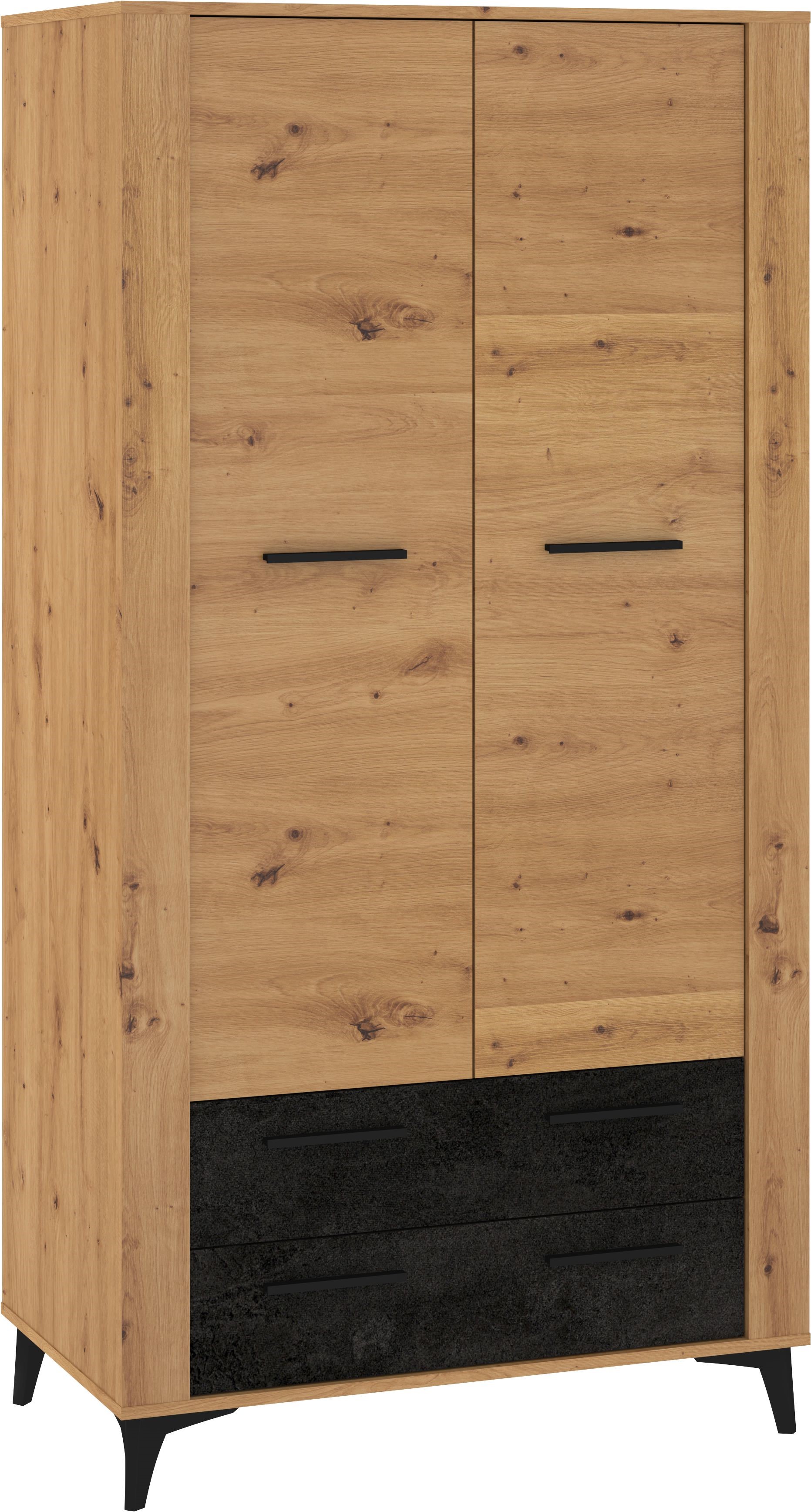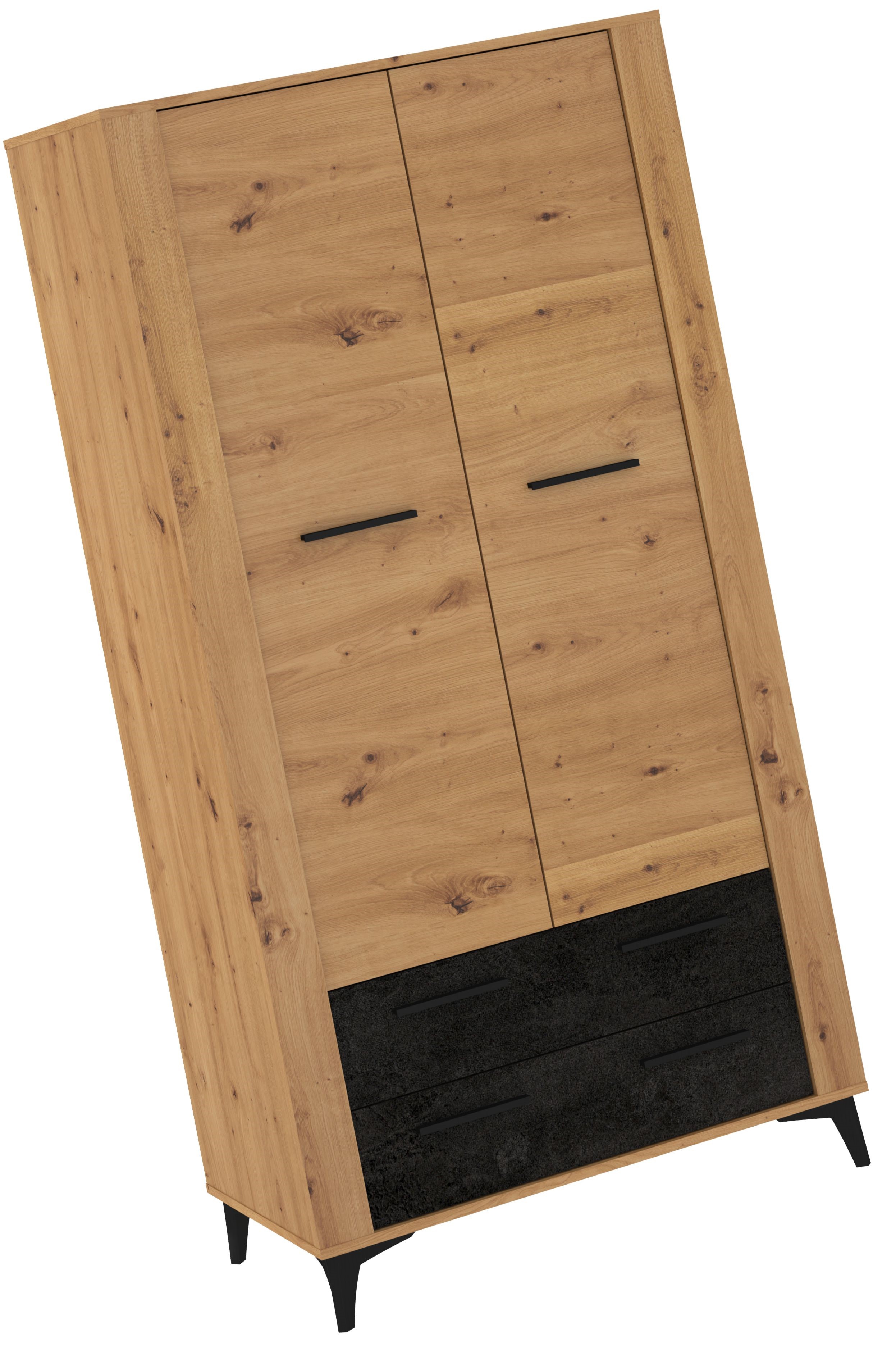 Nowoczesna szafa w naturalnym wybarwieniu drewna to funkcjonalny i stylowy mebel, który świetnie sprawdzi się w sypialni, garderobie lub przedpokoju. Jej elegancki wygląd podkreślają czarne uchwyty, stabilne skośne nogi oraz kontrastujące, ciemne fronty szuflad, które dodają całości wyrazistego, loftowego charakteru. Mebel wyposażono w dwie pojemne szafki górne z zamykanymi drzwiami oraz dwie praktyczne szuflady w dolnej części, co pozwala wygodnie przechowywać ubrania, tekstylia i akcesoria. Naturalna struktura drewna w połączeniu z nowoczesnymi akcentami tworzy harmonijną, współczesną kompozycję idealną do wnętrz w stylu loft, skandynawskim i minimalistycznym. To doskonały wybór dla osób, które cenią estetykę, funkcjonalność i trwałość.