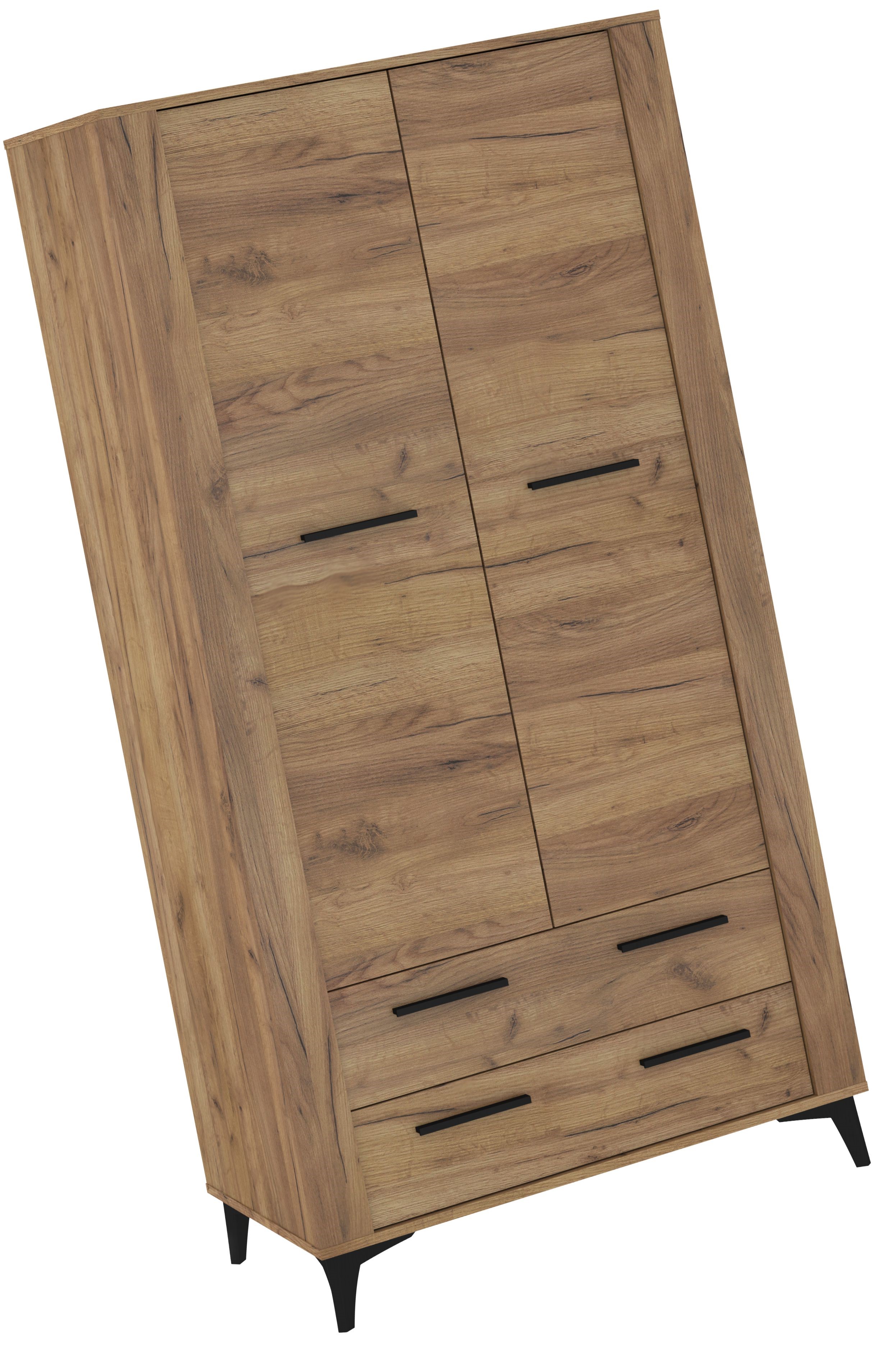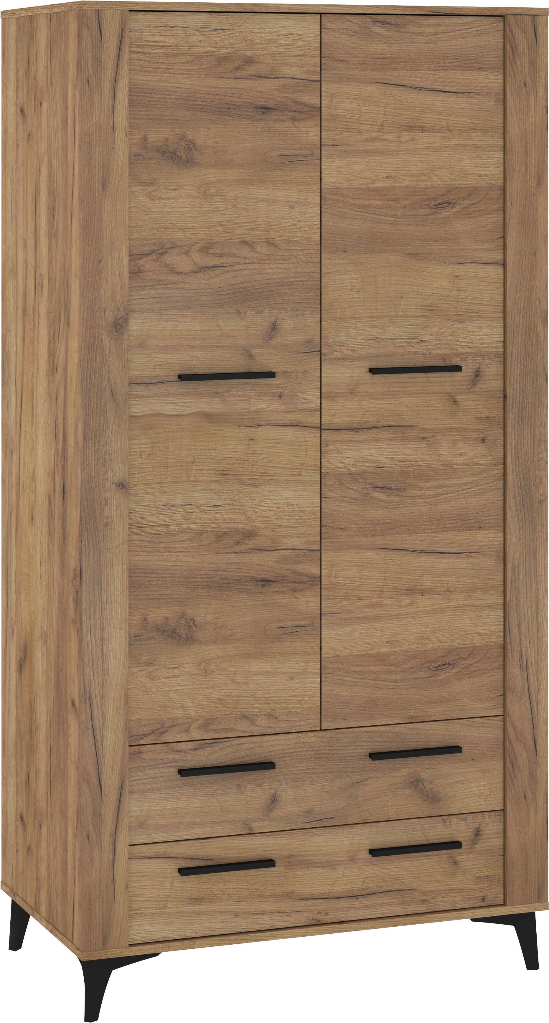 Stylowa szafa w naturalnym wybarwieniu drewna to praktyczny mebel, który świetnie odnajdzie się w nowoczesnych i minimalistycznych wnętrzach. Jej prosta forma została uzupełniona czarnymi, poziomymi uchwytami oraz stabilnymi, skośnymi nogami, co nadaje całości lekko industrialnego charakteru. W górnej części znajdują się dwie pojemne szafki z drzwiami, idealne do przechowywania odzieży wiszącej lub większych elementów garderoby. Dolne dwie szuflady zapewniają dodatkowe miejsce na drobniejsze akcesoria i tekstylia. Naturalna struktura drewna w połączeniu z czarnymi akcentami tworzy elegancki, ponadczasowy design, który łatwo dopasować do różnych aranżacji domowych.