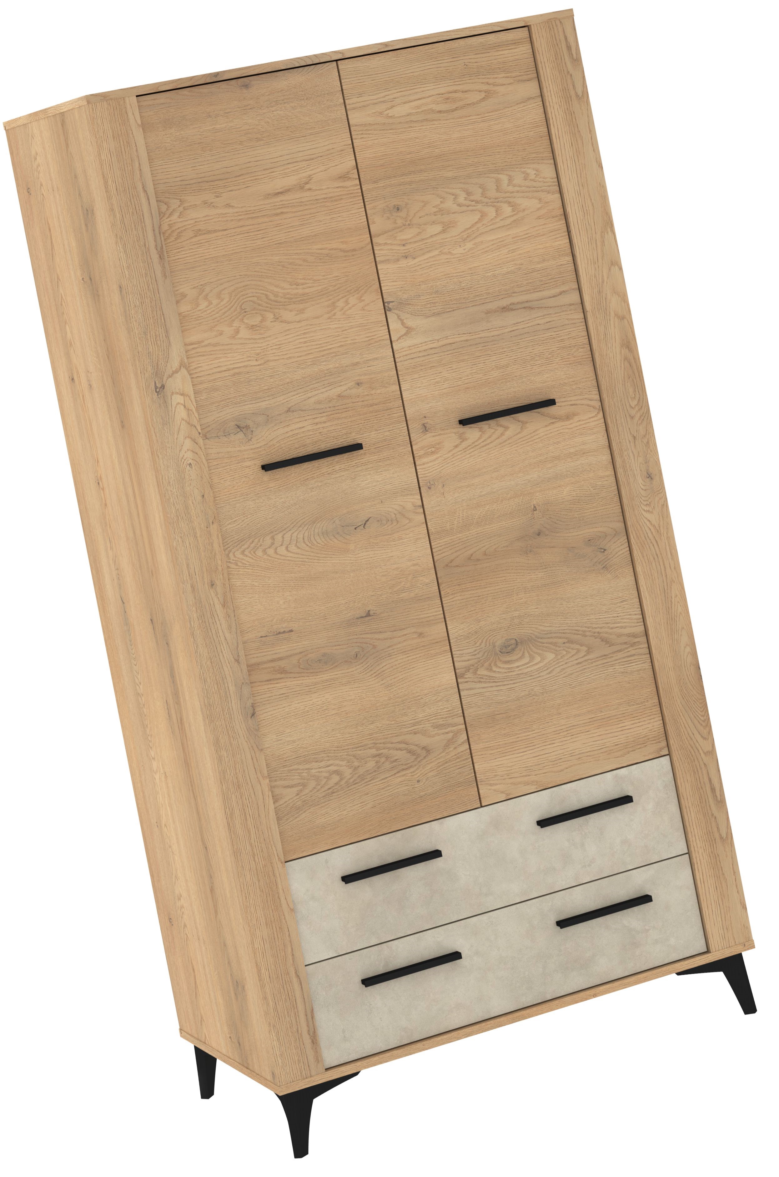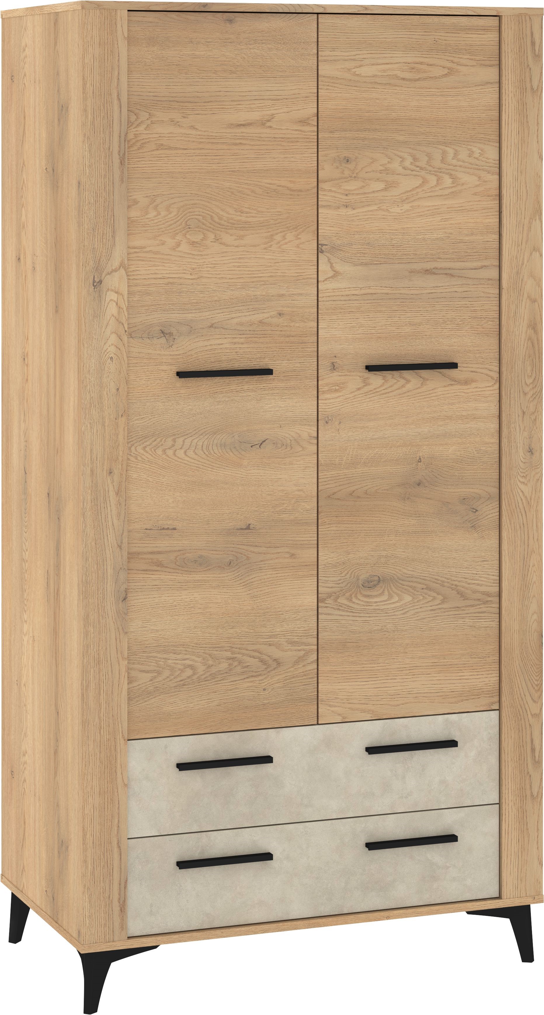 Nowoczesna szafa w naturalnym wybarwieniu dębu to funkcjonalny i stylowy mebel, który świetnie sprawdzi się w sypialni, garderobie lub przedpokoju. Jej minimalistyczny design podkreślają czarne, poziome uchwyty oraz stabilne, skośne nogi, nadające całości lekkości i współczesnego charakteru. W górnej części znajdują się dwie pojemne szafki z drzwiami, idealne do przechowywania odzieży wiszącej lub większych elementów garderoby. Dolne szuflady w kontrastowym wykończeniu granada migdał zapewniają dodatkowe miejsce na drobniejsze akcesoria i tekstylia. Naturalna struktura drewna w połączeniu z nowoczesnymi akcentami tworzy elegancki, ponadczasowy mebel, który doskonale komponuje się z aranżacjami w stylu loft, skandynawskim i minimalistycznym.