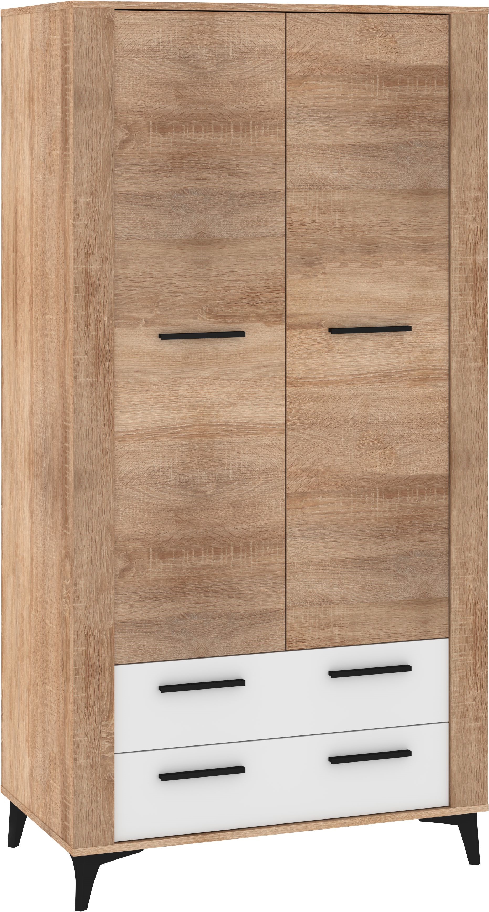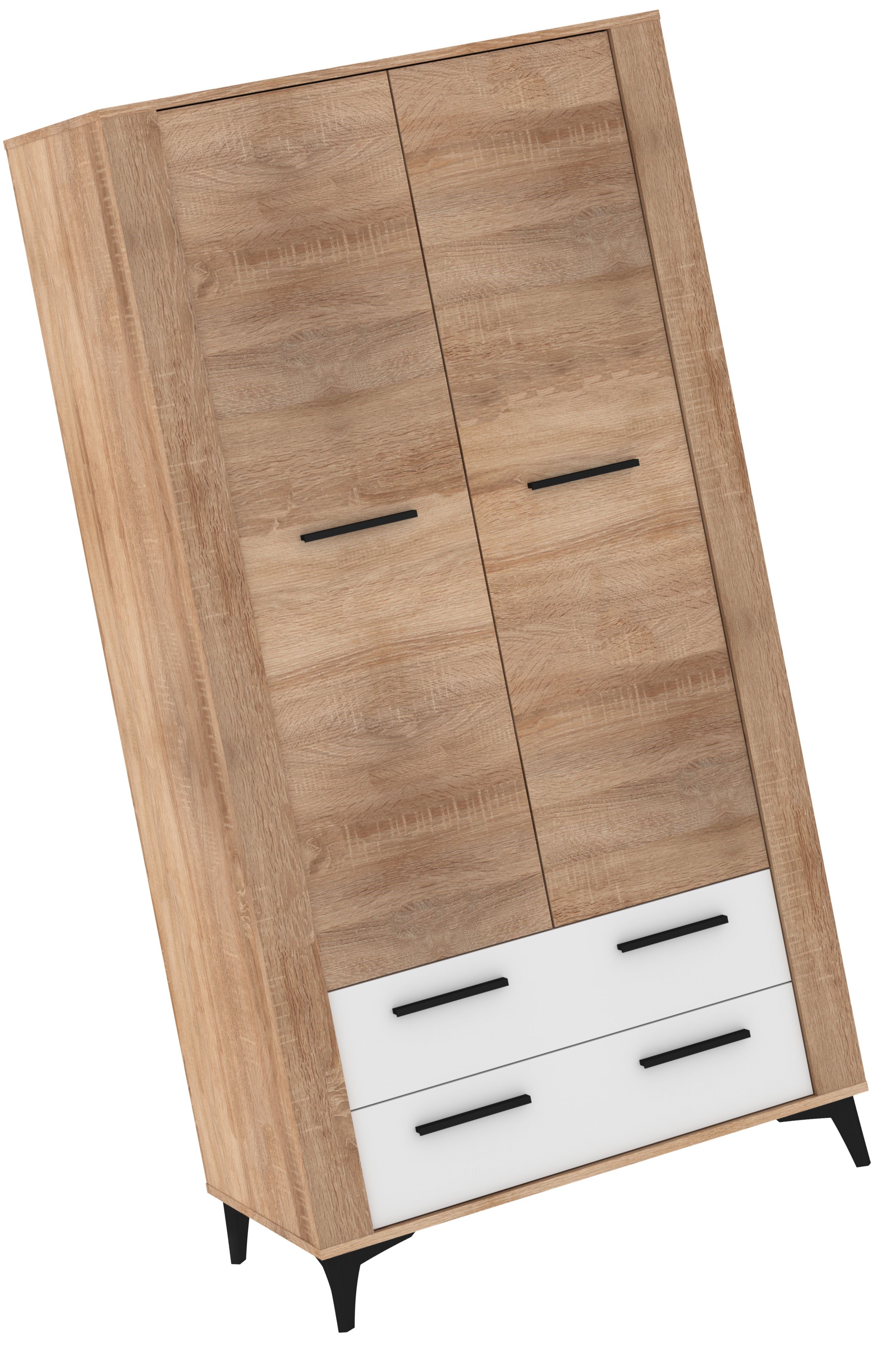 Nowoczesna szafa łącząca naturalne drewno z białymi frontami to praktyczne rozwiązanie do przechowywania, idealne do sypialni, garderoby czy przedpokoju. Górna część z dwuskrzydłowymi drzwiami oferuje dużo miejsca na odzież wiszącą i większe elementy garderoby, natomiast dwie dolne szuflady ułatwiają organizację drobniejszych akcesoriów. Czarne uchwyty oraz skośne nogi podkreślają nowoczesny charakter mebla, a kontrast między drewnem a bielą nadaje mu lekkości i elegancji. To uniwersalna szafa, która doskonale wpisuje się w aranżacje w stylu loft, skandynawskim i minimalistycznym, zapewniając jednocześnie wysoką funkcjonalność i trwałość.