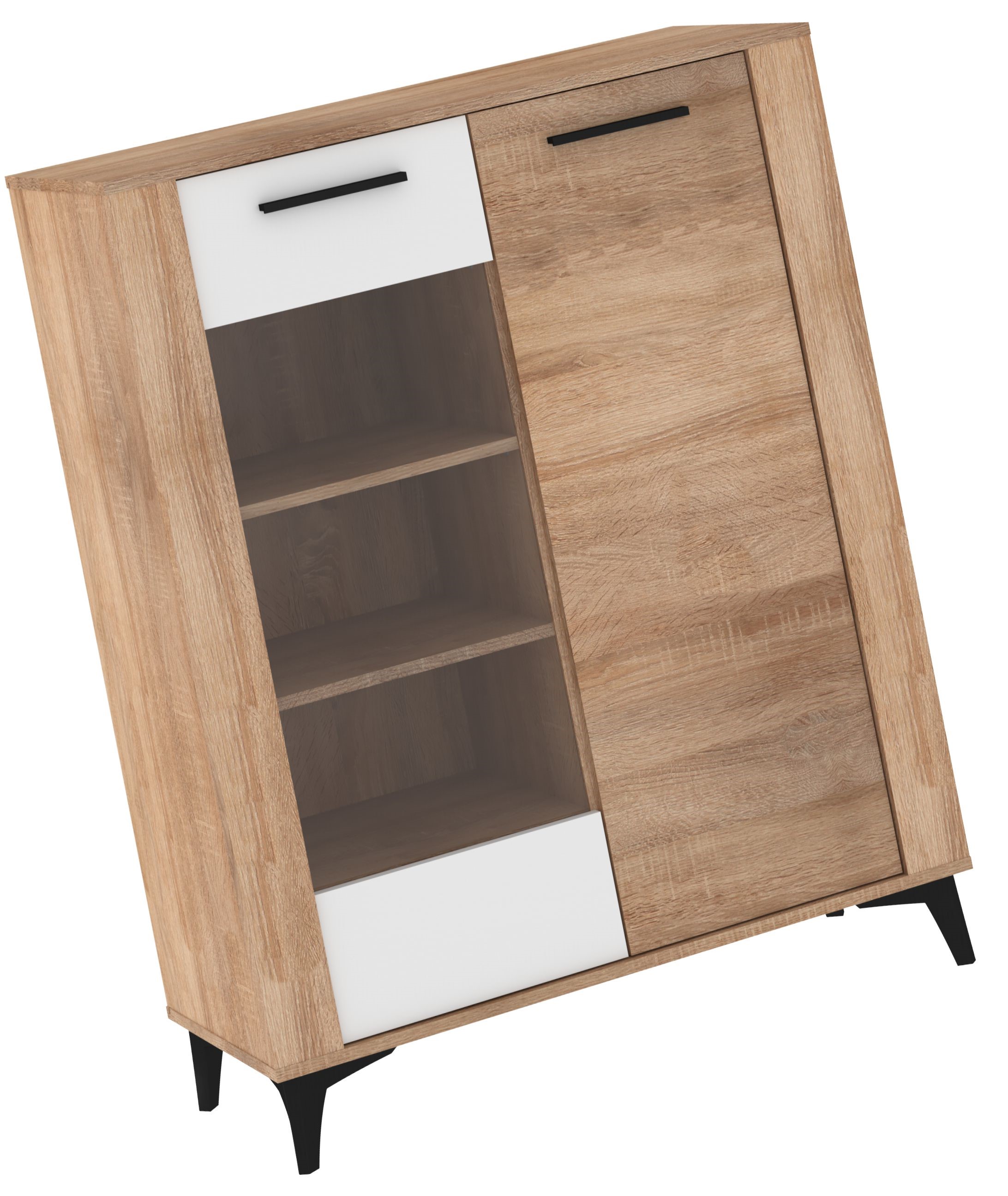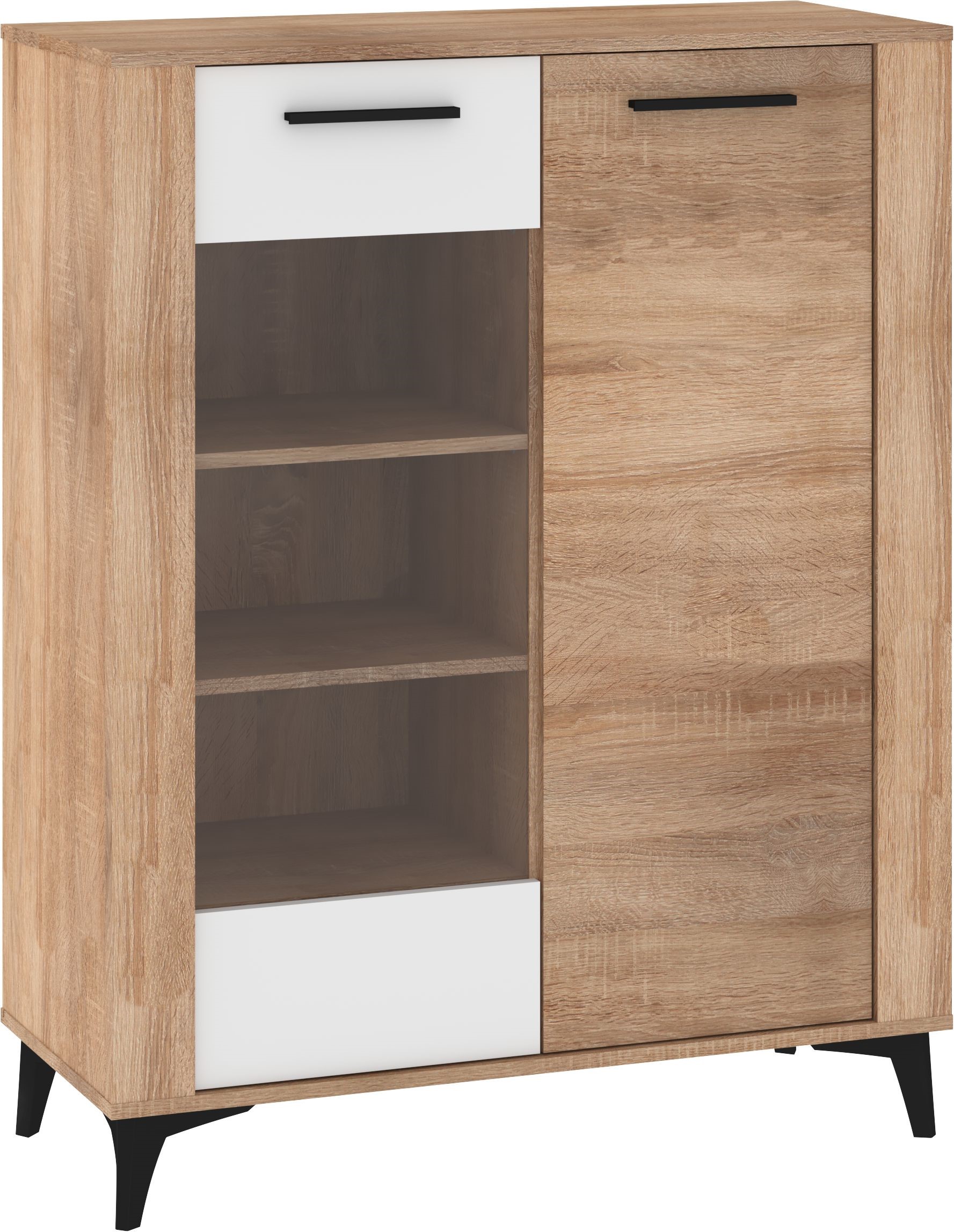 Witryna w naturalnym wybarwieniu drewna to praktyczny mebel, który łączy minimalistyczny design z funkcjonalnym układem przechowywania. Po lewej stronie znajdują się przeszklone drzwi oraz trzy półki, które świetnie sprawdzą się jako miejsce na dekoracje, książki lub drobne akcesoria. Prawa część mebla to wysoka, zamykana szafka z pełnym frontem, idealna do przechowywania większych przedmiotów i utrzymania porządku w pomieszczeniu. Stabilne, czarne nogi nadają konstrukcji lekkości i podkreślają jej nowoczesny charakter. Połączenie jasnego drewna, bieli i czarnych detali sprawia, że witryna doskonale wpisuje się w aranżacje skandynawskie, loftowe i modern, oferując jednocześnie estetykę i wygodę użytkowania.