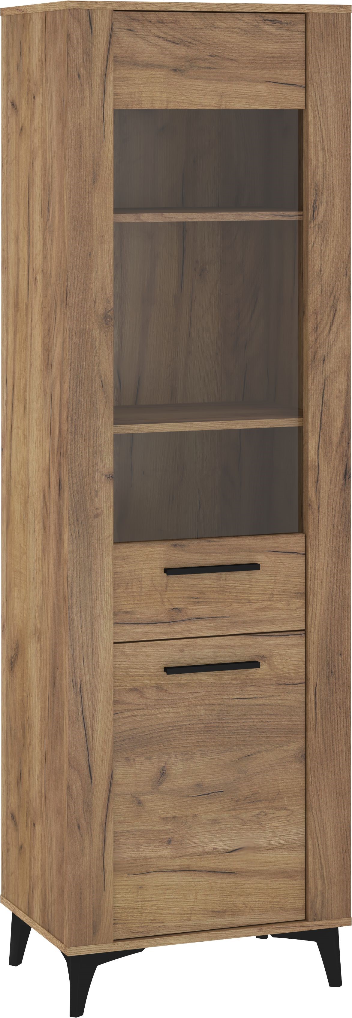 Stylowa, wysoka witryna w naturalnym odcieniu drewna to elegancki mebel, który łączy funkcję ekspozycyjną z wygodnym przechowywaniem. W górnej części znajduje się przeszklona szafka z trzema półkami, idealna do prezentacji dekoracji, porcelany lub ulubionych dodatków. Dolna, zamykana szafka zapewnia dodatkową przestrzeń na akcesoria, tekstylia lub dokumenty. Całość stoi na czarnych, skośnych nogach, które podkreślają nowoczesny charakter mebla i dodają mu lekkości. Witryna doskonale wpisuje się w aranżacje loftowe, skandynawskie i modern, oferując połączenie estetyki i funkcjonalności.