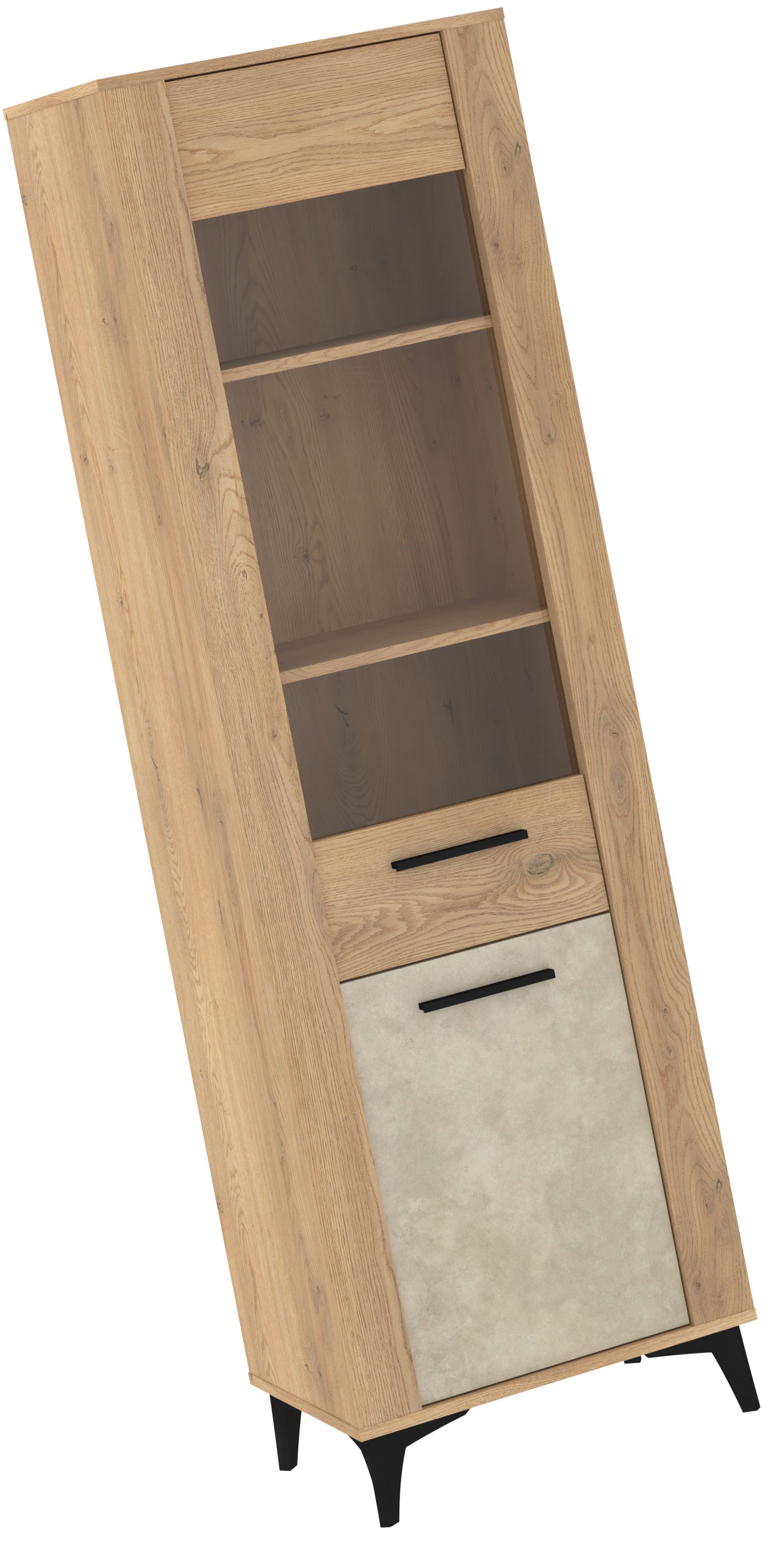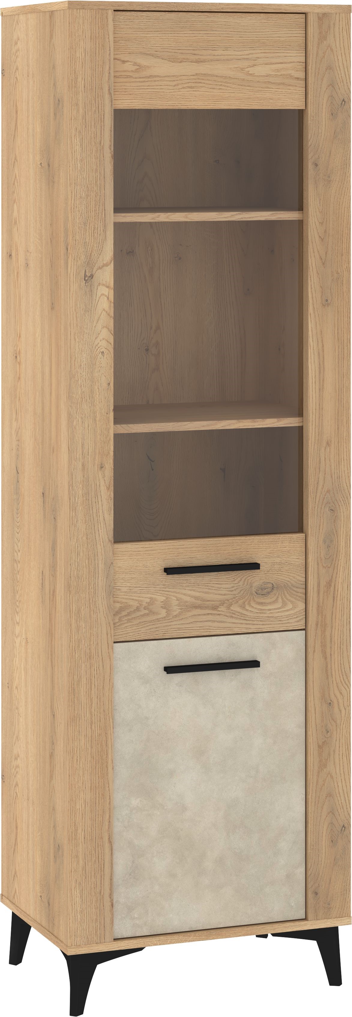 Wysoka witryna w naturalnym odcieniu drewna to elegancki mebel, który łączy funkcję ekspozycyjną z praktycznym przechowywaniem. W górnej części znajduje się przeszklona wnęka z trzema półkami, idealna do prezentacji dekoracji, porcelany lub ulubionych dodatków. Dolna szafka z jasnym frontem zapewnia dodatkowe miejsce na akcesoria i tekstylia. Całość stoi na czarnych, skośnych nogach, które podkreślają nowoczesny charakter mebla i dodają mu lekkości. Witryna świetnie sprawdzi się w salonie, jadalni lub gabinecie, szczególnie w aranżacjach modern, loft i skandynawskich.