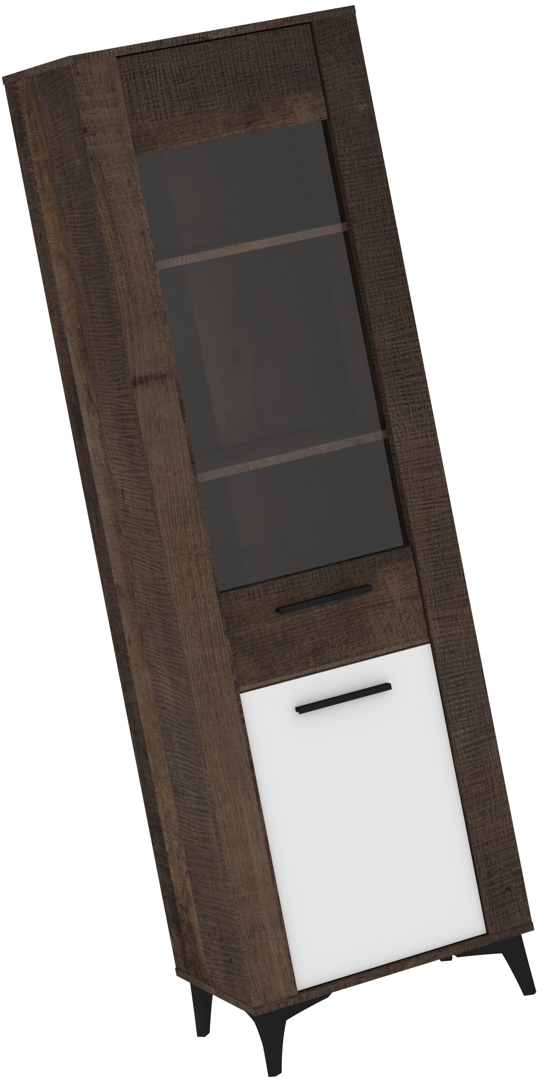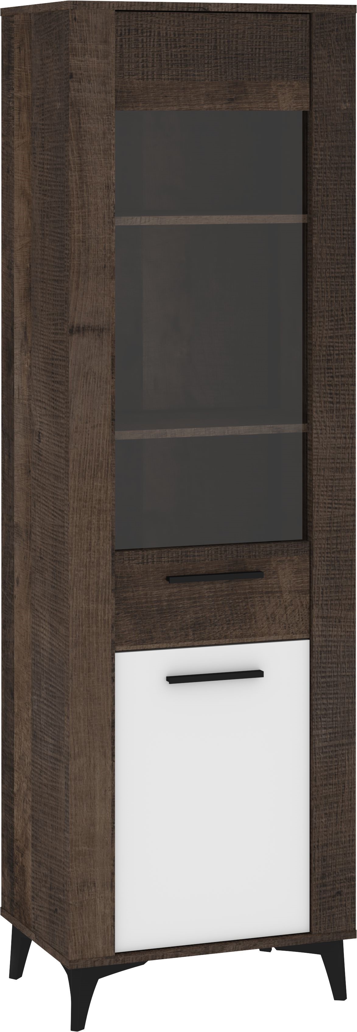Wysoka witryna w ciemnym, nowoczesnym wybarwieniu drewna to stylowy mebel, który łączy funkcję ekspozycyjną z praktycznym przechowywaniem. W górnej części znajduje się przeszklona szafka z trzema półkami, idealna do prezentacji dekoracji, szkła lub kolekcjonerskich dodatków. Dolna część została wyposażona w zamykaną szafkę z jasnym frontem, która pozwala ukryć mniej reprezentacyjne przedmioty. Stabilne, skośne nogi w czarnym kolorze nadają konstrukcji lekkości i podkreślają jej współczesny charakter. Witryna świetnie sprawdzi się w salonie, jadalni lub gabinecie, szczególnie w aranżacjach loftowych, modern i skandynawskich.